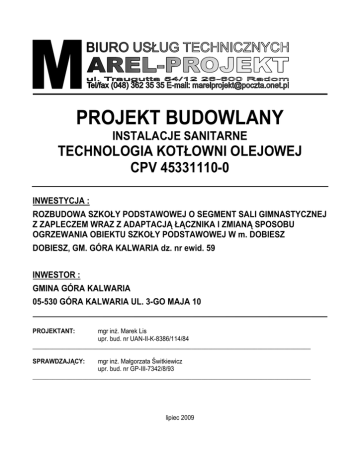PROJEKT BUDOWLANY INSTALACJE SANITARNE TECHNOLOGIA KOTŁOWNI OLEJOWEJ CPV 45331110-0 INWESTYCJA : ROZBUDOWA SZKOŁY PODSTAWOWEJ O SEGMENT SALI GIMNASTYCZNEJ Z ZAPLECZEM WRAZ Z ADAPTACJĄ ŁĄCZNIKA I ZMIANĄ SPOSOBU OGRZEWANIA OBIEKTU SZKOŁY PODSTAWOWEJ W m. DOBIESZ DOBIESZ, GM. GÓRA KALWARIA dz. nr ewid. 59 INWESTOR : GMINA GÓRA KALWARIA 05-530 GÓRA KALWARIA UL. 3-GO MAJA 10 mgr inż. Marek Lis upr. bud. nr UAN-II-K-8386/114/84 ____________________________________________________________________________________ PROJEKTANT: mgr inż. Małgorzata Świtkiewicz upr. bud. nr GP-III-7342/8/93 ____________________________________________________________________________________ SPRAWDZAJĄCY: lipiec 2009 MAREL-PROJEKT s.c. Biuro Usług Technicznych, 26-600 Radom ul. Traugutta 54/12, tel/fax 0-48-362-35-35, [email protected] OŚWIADCZEIE Zgodnie z art.20 ust.4 - Prawa Budowlanego (Dz.U. 207/2003 poz. 2016 z późniejszymi zmianami ) oświadczamy jako projektant / sprawdzający , że projekt budowlany obiektu: „Instalacja technologiczna kotłowni olejowej dla budynku Szkoły Podstawowej w m. Dobiesz gm. Góra Kalwaria (dz. nr ewid. 59)” dla Inwestora : Gmina Góra Kalwaria 05-530 Góra Kalwaria ul. 3-go Maja 10 sporządzono zgodnie z obowiązującymi przepisami oraz zasadami wiedzy technicznej. PROJEKTAT IST. SAITARYCH: mgr inż. Marek Lis upr. bud. nr UAN-II-K-8386/114/84 SPRAWDZAJĄCY IST. SAITARYCH: mgr inż. Małgorzata Świtkiewicz upr. bud. nr GP-III-7342/8/93 Instalacja technologiczna kotłowni olejowej w Szkole Podstawowej w m. Dobiesz gm. Góra Kalwaria, dz. nr 59 str. 2 MAREL-PROJEKT s.c. Biuro Usług Technicznych, 26-600 Radom ul. Traugutta 54/12, tel/fax 0-48-362-35-35, [email protected] SPIS TREŚCI do PROJEKTU BUDOWLAEGO instalacji technologicznej kotłowni olejowej dla budynku Szkoły Podstawowej w m. Dobiesz gm. Góra Kalwaria (dz. nr ewid. 59) Projekt zawiera : I. OPIS TECHICZY 1. 2. 3. 4. 5. Przedmiot i zakres opracowania Podstawa opracowania Wymagania budowlane kotłowni olejowej i magazynu oleju Zamierzenia projektowe Opis instalacji technologicznej kotłowni olejowej i magazynu oleju II. OBLICZEIA III. SPECYFIKACJA ELEMETÓW KOTŁOWI I MAGAZYU OLEJU IV. UWAGI WYKOAWCZO-EKSPLOATACYJE V. CZĘŚĆ RYSUKOWA 1. 2. 3. 4. Sytuacja Rzut przyziemia Przekrój A-A Schemat technologiczny kotłowni olejowej rys. nr 1 rys. nr 2 rys. nr 3 rys. nr 4 Instalacja technologiczna kotłowni olejowej w Szkole Podstawowej w m. Dobiesz gm. Góra Kalwaria, dz. nr 59 str. 3 MAREL-PROJEKT s.c. Biuro Usług Technicznych, 26-600 Radom ul. Traugutta 54/12, tel/fax 0-48-362-35-35, [email protected] I. OPIS TECHICZY 1. Przedmiot i zakres opracowania Przedmiotem opracowania jest projekt budowlany instalacji technologicznej kotłowni olejowej i magazynu oleju dla budynku Szkoły Podstawowej w m. Dobiesz gm. Góra Kalwaria (dz. nr ewid. 59). Zakres opracowania obejmuje: - wytyczne budowlane dla pomieszczenia kotłowni olejowej i magazynu oleju - instalację technologiczną kotłowni olejowej - instalację technologiczną magazynu oleju 2. Podstawa opracowania Projekt opracowano w oparciu o: a) umowa z Inwestorem, Gminą Góra Kalwaria nr 57/01/2009 z 20.01.2009 b) projekt budowlano-wykonawczy architektoniczno-konstrukcyjny c) inwentaryzacja do celów projektowych istn. budynku Szkoły Podstawowej d) rozporządzenie Ministra Infrastruktury w sprawie warunków technicznych, jakim powinny odpowiadać budynki i ich usytuowanie, Dz. U. Nr 75/2002 poz.690 z dn.15.06.2002 z późniejszymi zmianami e) obowiązujące przepisy i normy dotyczące projektowania i wykonawstwa instalacji sanitarnych i sieci zewnętrznych. COBRTI "Instal" W-wa f) warunki techniczne wykonania i odbioru robót budowlano-montażowych. Sieci sanitarne i przemysłowe, W-wa g) aktualne katalogi branżowe 3. Wymagania budowlane kotłowni olejowej i magazynu oleju 3.1. Kotłownia olejowa -kotłownia zlokalizowana w przyziemiu budynku Sali Gimnastycznej z bezpośrednim wejściem od zewnątrz -wysokość kotłowni min. 2,2 m w świetle -drzwi do kotłowni szer. min. 90 cm w świetle, samozamykające się, bezzamkowe -kotłownia wydzieloną strefą pożarową -ściany i stropy odporność ogniowa 60 min -zamknięcia otworów odporność ogniowa 30 min -podłoga niepalna, szczelna, niepyląca, nienasiąkliwa -przejścia przewodów przez przegrody kotłowni o odporności ogniowej jak przegroda -odwodnienie podłogi zaopatrzone w zamknięcia i urządzenia zatrzymujące olej (separator) -instalacja odwodnieniowa odporna na olej -wyposażenie w automatyczny wyłącznik dopływu oleju -wyposażenie w wydzieloną rozdzielnię elektryczną z dostępnym z zewnątrz awaryjnym wyłącznikiem prądu -wyposażenie w sprzęt gaśniczy (2 szt. gaśnic po 2kg każda + koc p.poż.) i oznakowanie miejsca jego lokalizacji -pozostałe wymagania typowe jak dla kotłowni o mocy ≤ 60 kW -stosować olej opałowy EL o minimalnej temp. zapłonu 55oC Instalacja technologiczna kotłowni olejowej w Szkole Podstawowej w m. Dobiesz gm. Góra Kalwaria, dz. nr 59 str. 4 MAREL-PROJEKT s.c. Biuro Usług Technicznych, 26-600 Radom ul. Traugutta 54/12, tel/fax 0-48-362-35-35, [email protected] 3.2. Magazyn oleju -magazyn oleju zlokalizowany w przyziemiu budynku Sali Gimnastycznej z bezpośrednim wejściem od zewnątrz -magazyn oleju wydzielonym pomieszczeniem z progiem przy wejściu o wys. 60 cm -wysokość magazynu min. 2,2 m w świetle -drzwi do magazynu oleju szer. min. 90 cm w świetle, samozamykające się, bezzamkowe -magazyn oleju wydzieloną strefą pożarową -ściany i stropy odporność ogniowa 120 min -zamknięcia otworów odporność ogniowa 60 min -podłoga niepalna, szczelna, niepyląca, nienasiąkliwa, w formie wanny szczelnej -przejścia przewodów przez przegrody magazynu o odporności ogniowej jak przegroda -wyposażenie w sprzęt gaśniczy (2 szt. gaśnic po 2kg każda + koc p.poż.) i oznakowanie miejsca lokalizacji -wentylacja magazynu nawiewno-wywiewna o kr