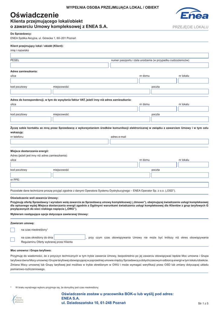 WYPEŁNIA OSOBA PRZEJMUJĄCA LOKAL / OBIEKT Oświadczenie Klienta przejmującego lokal/obiekt o zawarciu Umowy kompleksowej z ENEA S.A. PRZEJĘCIE LOKALU Do Sprzedawcy: ENEA Spółka Akcyjna, ul. Górecka 1, 60–201 Poznań Klient przejmujący lokal / obiekt (Klient): imię i nazwisko PESEL numer paszportu i data urodzenia (w przypadku cudzoziemców) Adres zamieszkania: ulica nr domu kod pocztowy miejscowość nr lokalu poczta Adres do korespondencji, w tym do wysyłania faktur VAT, jeżeli inny niż adres zamieszkania: ulica nr domu kod pocztowy miejscowość nr lokalu poczta Życzę sobie kontaktu ze mną przez Sprzedawcę z wykorzystaniem środków komunikacji elektronicznej w związku z zawarciem Umowy i w tym celu wskazuję: nr telefonu adres e-mail Miejsce dostarczania energii: Adres (jeżeli jest inny niż adres zamieszkania): ulica nr domu kod pocztowy miejscowość nr lokalu poczta nr PPE: Pozostałe dane techniczne proszę przyjąć zgodnie z danymi Operatora Systemu Dystrybucyjnego – ENEA Operator Sp. z o.o. („OSD”). Oświadczenie woli zawarcia Umowy: Przyjmuję ofertę Sprzedawcy i wyrażam wolę zawarcia ze Sprzedawcą umowy kompleksowej („Umowa”), obejmującej świadczenie usługi kompleksowej dla opisanego wyżej Miejsca dostarczania energii zgodnie z Ogólnymi warunkami świadczenia usługi kompleksowej dla Klientów z grup taryfowych G przyłączonych do sieci niskiego napięcia („OWU”). Wybieram następujące opcje dotyczące zawieranej Umowy: Zawieram umowę: na czas nieokreślony1 na czas określony do dnia , przy czym czas obowiązywania Umowy nie może być krótszy niż okres obowiązywania Regulaminu Oferty wybranej przez Klienta Moc umowna i Grupa taryfowa: Przyjmuję do wiadomości, że z przyczyn technicznych w tym trybie zawarcia Umowy, bezpośrednio po jej zawarciu obowiązywać będzie Moc umowna i Grupa taryfowa równa Mocy umownej i Grupie taryfowej obowiązującej w poprzedniej umowie między Sprzedawcą a dotychczasowym odbiorcą energii w tym lokalu/obiekcie. Zmiana Mocy umownej lub Grupy taryfowej jest możliwa w trybie określonym w OWU i może wymagać weryfikacji przez OSD lub zmiany dotyczącej układu pomiarowo-rozliczeniowego. 1 W braku wyraźnego wyboru przyjmuje się, że domyślny jest czas nieokreślony. Oświadczenie zostaw u pracownika BOK-u lub wyślij pod adres: ENEA S.A. ul. Dziadoszańska 10, 61-248 Poznań Str 1 z 5 Wybieram ofertę: Chcę skorzystać z gwarancji niezmienności ceny za energię elektryczną i stawek opłat przez określony czas2 – uzyskawszy wszelkie wymagane informacje i zapoznawszy się z warunkami oferty określonymi w dokumentach uzyskanych od Sprzedawcy. Nie chcę skorzystać z gwarancji niezmienności cen za energię elektryczną i stawek opłat. Nie wybieram żadnej z ofert wskazanych poniżej i w związku z tym wybieram rozliczenie wyłącznie w oparciu o obowiązującą Taryfę Sprzedawcy oraz Taryfę OSD. Wybieram jedną ofertę: Wybieram wariant Wybieram ofertę PEWNA CENA w wariancie do Zyskam: 36 miesięcy gwarancji pewność, że ceny energii i stawka opłaty handlowej określone w Cenniku nie wzrosną w okresie gwarancji 2 niezmienności ceny w wariancie do niezależność od zmieniających się cen energii na rynku 24 miesięcy gwarancji większą kontrolę nad domowym budżetem 2 niezmienności ceny Wybieram ofertę ENERGIA+ Fachowiec PROGRAM Przystępuję do Programu „ENERGIA+ Fachowiec” („Program”) na warunkach określonych w Regulaminie Programu „ENERGIA+ Fachowiec”. Administratorem podanych danych będzie PZU Pomoc Spółka Akcyjna z siedzibą przy al. Jana Pawła II 24, 00-133 Warszawa. Mam prawo dostępu do treści i poprawiania swoich danych osobowych. Celem przetwarzania moich danych osobowych jest przystąpienie do Programu i obsługa uczestnictwa w Programie. Moje dane osobowe podaję dobrowolnie. Jest to niezbędne do przystąpienia do Programu. UBEZPIECZENIE Zyskam: Dodatkowo wybieram ubezpieczenie i oświadczam, że przed przystąpieniem do Umowy grupowego ubezpieczenia dla Uczestników Programu „ENERGIA+ Fachowiec” nr 17BB2015 z dnia 5 stycznia 2016 r., zawartej pomiędzy PZU Pomoc SA i PZU SA („umowa ubezpieczenia”), otrzymałem/am tekst Ogólnych warunków grupowego ubezpieczenia assistance „ENERGIA+ Fachowiec” dla Uczestników Programu „ENERGIA+ Fachowiec”, ustalonych uchwałą nr UZ/405/2015 Zarządu PZU SA z dnia 21 grudnia 2015 r. oraz że zapoznałem/am się z ich treścią. Wyrażam zgodę na objęcie ochroną ubezpieczeniową przez PZU SA na podstawie umowy ubezpieczenia, na zasadach określonych w wyżej wskazanych ogólnych warunkach ubezpieczenia. Administratorem Pani/Pana danych osobowych będzie PZU SA z siedzibą w Warszawie, al. Jana Pawła II 24, 00-133 Warszawa. Ma Pani/Pan prawo dostępu do treści swoich danych osobowych i ich poprawiania. Dane przetwarzane będą w celach obsługowych, analitycznych, dochodzenia roszczeń oraz marketingu bezpośredniego własnych produktów i usług. Podanie przez Panią/Pana danych osobowych jest dobrowolne, ale niezbędne do przystąpienia do ubezpieczenia i wykonywania umowy ubezpieczenia. pewność, że ceny energii i stawka opłaty handlowej określone w Cenniku nie wzrosną w okresie gwarancji dostęp do usług elektryka oraz technika instalacji grzewczych i gazowych w ramach ubezpieczenia bogaty program rabatowy Wybieram ofertę ENERGIA+ Zdrowie Wybieram Pakiet Przystępuję do Programu Rabatowego, na zasadach wynikających z Oferty ENERGIA+ Zdrowie i wybieram następujący wariant Programu Rabatowego (Pakiet): Zyskam: pewność, że ceny energii i stawka opłaty handlowej określone w Cenniku nie wzrosną w okresie gwarancji dostęp na atrakcyjnych warunkach do lekarzy specjalistów dla siebie i swoich najbliższych Pakiet Indywidualny opiekę medyczną w placówkach LUX MED Pakiet Partnerski Pakiet Rodzinny Wyrażam zgodę na udostępnienie przez Sprzedawcę moich danych osobowych 