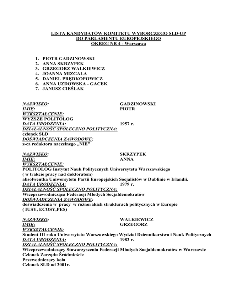 LISTA KANDYDATÓW KOMITETU WYBORCZEGO SLD-UP DO PARLAMENTU EUROPEJSKIEGO OKRĘG NR 4 - Warszawa 1. 2. 3. 4. 5. 6. 7. PIOTR GADZINOWSKI ANNA SKRZYPEK GRZEGORZ WALKIEWICZ JOANNA MIZGAŁA DANIEL PRĘDKOPOWICZ ANNA UZDOWSKA - GACEK JANUSZ CIEŚLAK NAZWISKO: GADZINOWSKI IMIĘ: PIOTR WYKSZTAŁCENIE: WYŻSZE POLITOLOG DATA URODZENIA: 1957 r. DZIAŁALNOŚĆ SPOLECZNO POLITYCZNA: członek SLD DOŚWIADCZENIA ZAWODOWE: z-ca redaktora naczelnego „NIE” NAZWISKO: SKRZYPEK IMIĘ: ANNA WYKSZTAŁCENIE: POLITOLOG Instytut Nauk Politycznych Uniwersytetu Warszawskiego ( w trakcie pracy nad doktoratem) absolwentka Uniwersytetu Partii Europejskich Socjalistów w Dublinie w Irlandii. 1979 r. DATA URODZENIA: DZIAŁALNOŚĆ SPOLECZNO POLITYCZNA: Wiceprzewodnicząca Federacji Młodych Socjaldemokratów DOŚWIADCZENIA ZAWODOWE: doświadczenia w pracy w różnorakich strukturach politycznych w Europie ( IUSY, ECOSY,PES) WALKIEWICZ NAZWISKO: IMIĘ: GRZEGORZ WYKSZTAŁCENIE: Student III roku Uniwersytetu Warszawskiego Wydział Dziennikarstwa i Nauk Politycznych DATA URODZENIA: 1982 r. DZIAŁALNOŚĆ SPOLECZNO POLITYCZNA: Wiceprzewodniczący Stowarzyszenia Federacji Młodych Socjaldemokratów w Warszawie Członek Zarządu Śródmieście Przewodniczący koła Członek SLD od 2001r. NAZWISKO: MIZGAŁA IMIĘ: JOANNA WYKSZTAŁCENIE: POLITOLOG stopień naukowy doktor-absolwentka Chrześcijańskiej Akademii Teologicznej Uniwersytetu Georgetown Waszsyngton DATA URODZENIA: 1956 r. DOŚWIADCZENIA ZAWODOWE: Adiunkt w instytucie Polskiej Akademii Nauk. Sekretarz w biurze Kościoła Ewangelicko- reformowanego w Polsce. W dorobku kilkadziesiąt publikacji z dziedziny publikacji. NAZWISKO: PRĘDKOPOWICZ IMIĘ: DANIEL WYKSZTAŁCENIE: POLITOLOG wydział Nauk Politycznych Wyższej Szkoły Humanistycznej DATA URODZENIA: 1979r. DZIAŁALNOŚĆ SPOLECZNO POLITYCZNA: Wiceprezes Stowarzyszenia „Europa i My” Pełnomocnik Rady Powiatowej SLD ds. Unii Europejskiej DOŚWIADCZENIA ZAWODOWE: Wykładowca akademicki WSH Staż w Biurze Integracji Europejskiej Kancelarii Prezydenta RP NAZWISKO: UZDOWSKA - GACEK IMIĘ: ANNA WYKSZTAŁCENIE: Student SGH –wydział Metod Ilościowych i systemów Informatycznych. 1978r. DATA URODZENIA: DZIAŁALNOŚĆ SPOLECZNO POLITYCZNA: Członek Rady Warszawskiej Federacji Młodych Socjaldemokratów DOŚWIADCZENIA ZAWODOWE: Działalność gospodarcza - Studio Promocji i Reklamy Asystent Posła na Sejm RP NAZWISKO: CIEŚLAK JANUSZ IMIĘ: WYKSZTAŁCENIE: PRAWNIK absolwent Uniwersytetu Warszawskiego – studium służby zagranicznej DATA URODZENIA: 1941r. DZIAŁALNOŚĆ SPOLECZNO POLITYCZNA: członek SLD udział w Komisjach Parlamentarnych przedstawiciel PKB w polsko- brytyjskiej Grupie Parlamentarnej DOŚWIADCZENIA ZAWODOWE: Wiceprezes Stowarzyszenia „Polski Klub Biznesu” Radca Handlowy w kilku Polskich Placówkach Zagranicznych w latach ubiegłych