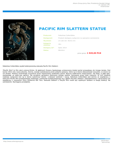 Aliens Group Jerzy Stec Produkcja-Handel-Usługi ul. Lipowa 17C Inowrocław PACIFIC RIM SLATTERN STATUE Producent: Sideshow Collectibles Dostępność: Produkt dostępny wyłącznie na specjalne zamówienie Wysokość: 23 cale (ok. 58,42 cm) Kategoria wiekowa: 18+ Dostępny od*: lipiec 2014 Status: Wkrótce price gross: 1 920,00 PLN Sideshow Collectibles wydał kolekcjonerską statuetę Pacific Rim Slattern ?Pacific Rim? to film akcji science-fiction. W głębinach Oceanu Spokojnego umieszczono kiedyś portal prowadzący do innego świata. Pod koniec 2012 roku nasza planeta, Ziemia, zostaje zaatakowana przez potężne potwory, które są w stanie zdewastować wszystko, co stanie na ich drodze. Potwory przeniknęły oczywiście przez wspomniany podwodny portal. Niszczą nadbrzeżne miejscowości, idą dalej, w głąb lądu, zostawiając za sobą pas zgliszcz. Na szczęście uprzednio stworzone zostały wielkie, sterowane przez ludzi maszyny. W nich ostatnia nadzieja, wyłącznie one są w stanie wykończyć bestie i uratować ludzkość i naszą. Sideshow Collectibles jest dumny ze współpracy z twórcami Pacific Rim przedstawiając kolejnego z potworów wydobywającego się z głębin Pacyfiku Slattern. Zaprojektowany i opracowany we współpracy z reżyserem filmu Guillermo Del Toro. Statueta Slattern z Pacyfic Rim może być wybitnym dziełem w twojej kolekcji. Na zamówienie. Wymagana przedpłata. http://www.aliensgroup.eu generator: aptusshop