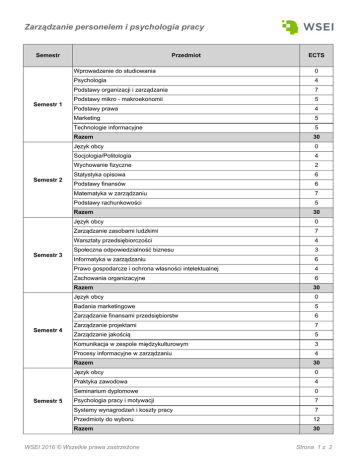 =DU]ąG]DQLHSHUVRQHOHPLSV\FKRORJLDSUDF\ Semestr Semestr 1 Semestr 2 Semestr 3 Semestr 4 Semestr 5 Przedmiot ECTS Wprowadzenie do studiowania 0 Psychologia 4 3RGVWDZ\RUJDQL]DFMLL]DU]ąG]DQLD 7 Podstawy mikro - makroekonomii 5 Podstawy prawa 4 Marketing 5 Technologie informacyjne 5 Razem 30 -Ċ]\NREF\ 0 Socjologia/Politologia 4 Wychowanie fizyczne 2 Statystyka opisowa 6 Podstawy finansów 6 0DWHPDW\NDZ]DU]ąG]DQLX 7 3RGVWDZ\UDFKXQNRZRĞFL 5 Razem 30 -Ċ]\NREF\ 0 =DU]ąG]DQLH]DVREDPLOXG]NLPL 7 :DUV]WDW\SU]HGVLĊELRUF]RĞFL 4 6SRáHF]QDRGSRZLHG]LDOQRĞüEL]QHVX 3 ,QIRUPDW\NDZ]DU]ąG]DQLX 6 3UDZRJRVSRGDUF]HLRFKURQDZáDVQRĞFLLQWHOHNWXDOQHM 4 Zachowania organizacyjne 6 Razem 30 -Ċ]\NREF\ 0 Badania marketingowe 5 =DU]ąG]DQLHILQDQVDPLSU]HGVLĊELRUVWZ 6 =DU]ąG]DQLHSURMHNWDPL 7 =DU]ąG]DQLHMDNRĞFLą 5 .RPXQLNDFMDZ]HVSROHPLĊG]\NXOWXURZ\P 3 3URFHV\LQIRUPDF\MQHZ]DU]ąG]DQLX 4 Razem 30 -Ċ]\NREF\ 0 Praktyka zawodowa 4 Seminarium dyplomowe 0 Psychologia pracy i motywacji 7 6\VWHP\Z\QDJURG]HĔLNRV]W\SUDF\ 7 Przedmioty do wyboru 12 Razem 30 :6(,:V]HONLHSUDZD]DVWU]HĪRQH Strona 1 z 2 =DU]ąG]DQLHSHUVRQHOHPLSV\FKRORJLDSUDF\ Semestr Semestr 6 Razem Przedmiot ECTS -Ċ]\NREF\ 8 Seminarium dyplomowe 10 'RNXPHQWDFMDNDGURZDLSáDFRZD 4 Coaching 4 Przedmioty do wyboru 4 Razem 30 Razem 180 (&76(XURSHDQ&UHGLW7UDQVIHU6\VWHP']LĊNLZGURĪHQLX(&76HXURSHMVF\VWXGHQFLPDMąPRĪOLZRĞüSRGMĊFLD OXENRQW\QXDFMLVWXGLyZZHZV]\VWNLFKXF]HOQLDFKUHDOL]XMąF\FKSURMHNW8áDWZLDWRZ\MD]GQDXF]HOQLH]DJUDQLF]QH DWDNĪHZ\PLDQĊVWXGHQWyZPLĊG]\SROVNLPLXF]HOQLDPLNWyUHZGURĪ\á\(&76 &3U]HGPLRWSU]\JRWRZXMąF\GRHJ]DPLQXFHU\ILNDF\MQHJR :6(,:V]HONLHSUDZD]DVWU]HĪRQH Strona 2 z 2
