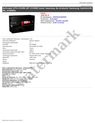 Informacje o produkcie Utworzono 04-03-2017 ActiveJet ATS-2150N [AT-2150N] toner laserowy do drukarki Samsung (zamiennik ML-2150D5) Cena : 198,28 zł er m ar k Nr katalogowy : EXPACJTSA0007 Producent : ActiveJet Stan magazynowy : bardzo wysoki Średnia ocena : brak recenzji Ilość w opakowaniu zbiorczym - orientacyjnie: 3 szt. Informacje dodatkowe: Klasa jakości podzespołów: Kod OEM: Kaseta z bębnem A+ ML-2150D8 Kod Producenta: ATS-2150N, AT-2150N Kolor: Czarny Orientacyjna waga brutto: Orientacyjna waga brutto opak. zbior.: Pasuje do drukarek:: 1840 g 6430 g ML: 2150, 2151N, 2152W, 2550, 2551. Technologia wytworzenia: Wałek OPC: Produkt 100% nowy 100% nowy Wersja: Supreme Strona Wydajność: 8800 stron A4 przy 5% pokryciu strony. w at Ilość w opakowaniu zbiorczym - orientacyjnie: 3 Kod Producenta: ATS-2150N, AT-2150N Orientacyjna waga brutto: 1840 Orientacyjna waga brutto opak. zbior.: 6430 Kod OEM: ML-2150D8 Kolor: Czarny Pasuje do drukarek:: ML: 2150, 2151N, 2152W, 2550, 2551. Wydajność: 8800 stron A4 przy 5% pokryciu strony. Informacje dodatkowe: Kaseta z bębnem Technologia wytworzenia: Produkt 100% nowy Wersja: Supreme Klasa jakości podzespołów: A Wałek OPC: 100% nowy Wygenerowano w programie www.oscGold.com