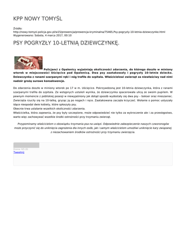 KPP NOWY TOMYŚL Źródło: http://nowy-tomysl.policja.gov.pl/w15/prewencja/prewencja-kryminalna/75465,Psy-pogryzly-10-letnia-dziewczynke.html Wygenerowano: Sobota, 4 marca 2017, 00:10 PSY POGRYZŁY 10-LETNIĄ DZIEWCZYNKĘ. Policjanci z Opalenicy wyjaśniają okoliczności zdarzenia, do którego doszło w miniony wtorek w miejscowości Uścięcice pod Opalenicą. Dwa psy zaatakowały i pogryzły 10-letnie dziecko. Dziewczynka z ranami szarpanymi ręki i nóg trafiła do szpitala. Właścicielowi zwierząt za niewłaściwy nad nimi nadzór grożą surowe konsekwencje. Do zdarzenia doszło w miniony wtorek po 17 w m. Uścięcice. Pokrzywdzoną jest 10-letnia dziewczynka, która z ranami szarpanymi trafiła do szpitala. Ze wstępnych ustaleń wynika, że dziewczynka spacerowała ulicą ze swoim pupilem. W pewnym momencie z pobliskiej posesji w niewyjaśniony jak dotąd sposób wydostały się dwa psy – bokser oraz mieszaniec. Zwierzęta rzuciły się na 10-latkę, gryząc ją po nogach i ręce. Zaatakowana zaczęła krzyczeć. Wołanie o pomoc usłyszały idące nieopodal dwie kobiety, które spłoszyły psy. Obecnie trwa ustalanie wszelkich okoliczności zdarzenia. Właścicielka, która zapewnia, że psy były szczepione, może odpowiedzieć nie tylko za wykroczenie ale i za przestępstwo, warto więc zachowywać wszelkie środki ostrożności przy trzymaniu zwierząt. Przypominamy właścicielom o obowiązku trzymania psa na uwięzi. Odpowiednie zabezpieczenie naszych czworonogów może przyczynić się do uniknięcia zagrożenia dla innych osób, jak i samym właścicielom umożliwi uniknięcie kary związanej z niezachowaniem środków ostrożności przy trzymaniu zwierzęcia. Ocena: 0/5 (0) Tweetnij
