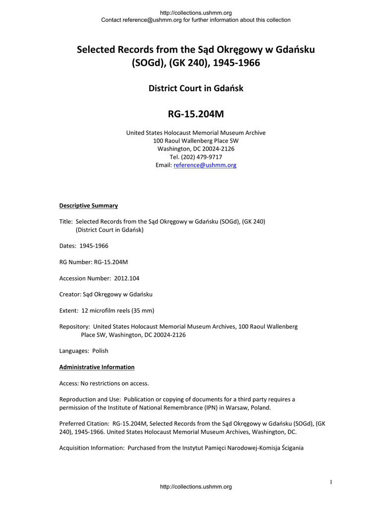 http://collections.ushmm.org Contact [email protected] for further information about this collection Selected Records from the Sąd Okręgowy w Gdańsku (SOGd), (GK 240), 1945‐1966 District Court in Gdańsk RG‐15.204M United States Holocaust Memorial Museum Archive 100 Raoul Wallenberg Place SW Washington, DC 20024‐2126 Tel. (202) 479‐9717 Email: [email protected] Descriptive Summary Title: Selected Records from the Sąd Okręgowy w Gdańsku (SOGd), (GK 240) (District Court in Gdańsk) Dates: 1945‐1966 RG Number: RG‐15.204M Accession Number: 2012.104 Creator: Sąd Okręgowy w Gdańsku Extent: 12 microfilm reels (35 mm) Repository: United States Holocaust Memorial Museum Archives, 100 Raoul Wallenberg Place SW, Washington, DC 20024‐2126 Languages: Polish Administrative Information Access: No restrictions on access. Reproduction and Use: Publication or copying of documents for a third party requires a permission of the Institute of National Remembrance (IPN) in Warsaw, Poland. Preferred Citation: RG‐15.204M, Selected Records from the Sąd Okręgowy w Gdańsku (SOGd), (GK 240), 1945‐1966. United States Holocaust Memorial Museum Archives, Washington, DC. Acquisition Information: Purchased from the Instytut Pamięci Narodowej‐Komisja Ścigania http://collections.ushmm.org 1 http://collections.ushmm.org Contact [email protected] for further information about this collection Zbrodni przeciwko Narodowi Polskiemu, Poland. Forms part of the Claims Conference International Holocaust Documentation Archive at the United States Holocaust Memorial Museum. This archive consists of documentation whose reproduction and/or acquisition was made possible with funding from the Conference on Jewish Material Claims against Germany. Accruals: Accruals may have been received since this collection was first processed, see the Archives catalog at collections.ushmm.org for further information. Custodial History Existence and location of originals: The original records are held at the Pamięci Narodowej‐‐ Komisja Ścigania Zbrodni przeciwko Narodowi Polskiemu, ul. Towarowa 28, Warsaw 00‐839 Poland. Tel. 011 48 22 581 85 00. More information about this repository can be found at www.ipn.gov.pl. Processing History: Aleksandra B. Borecka Scope and Content of Collection This collection contains selected files of criminal trials conducted by the District Court in Gdaṅsk during the years 1945‐1966. These trials pertain to crimes committed against Jews and Poles by Germans and their collaborators during the German occupation. Trials were based on the Decree of August 31, 1944 (“Sierpniówka”), issued by the Polski Komitet Wyzwolenia Narodowego (PKWN), concerning the punishment of German criminals guilty of murders and persecution of civilians and prisoners of war, and the punishment of traitors to the Polish Nation. "Sierpniówka" was one of the world's first legislation on liability for war crimes committed during World War II. This decree also applied to soldiers of the Home Army (Armia Krajowa) whom the Communist propaganda in the 40’s and 50’s attempted to portray as German collaborators. System of Arrangement The system of arrangement of the source repository has been preserved in the microfilmed reels. Arranged by personal case files and court file numbers. Indexing Terms Polski Komitet Wyzwolenia Narodowego. Gdańsk (Poland). Sąd Okręgowy‐‐Trials, litigation, etc. Stutthof (Concentration camp). Gusen (Concentration camp). War crime trials‐‐Poland‐‐Gdańsk Trials (Political crimes and offenses)‐‐Poland. War criminals‐‐Legal status, laws, etc.‐‐Poland. War victims‐‐Legal status, laws, etc.‐‐Poland. War criminals‐‐Government policy‐‐Poland. Prisoners of war‐‐Poland‐‐Gdańsk. World War, 1939‐1945‐‐Destruction and pillage‐‐Poland. World War, 1939‐1945‐‐Atrocities‐‐Investigations. World War, 1939‐1945‐‐Collaborationists‐‐Poland. Criminal justice, Administration of. http://collections.ushmm.org 2 http://collections.ushmm.org Contact [email protected] for further information about this collection Communism‐‐Poland‐‐History‐‐20th century. Holocaust, Jewish (1939‐1945)‐‐Poland. Augsburg (Germany). Województwo Pomorskie (Poland)‐‐History‐‐Occupation, 1941‐1944. Trials. CONTAINER LIST Note: Inventory in Polish and English (Polish, page 3‐10; English, page 10‐17); Polish Reel File Description 1 SOGd 146, 147, 148 SOGd 19‐ part I Andres Otto (oskarżony o pełnienie funkcji kierowniczej zastępcy Gauleitera w Gdańsku od 18 IX 1939 do 20 II 1941 r. oraz Kreistleitera w NSDAP w tym powiecie również od IX 1939 do 20 II 1941 r. Oprócz tego starosta Tczewa od 2 IX do 18 IX 1939 r. Jako starosta Tczewa występował publicznie przeciwko Polakom, w latach 1943‐1944 jako inżynier w firmie „Laur” bił robotników polskich. Do akt sprawy Otto Anders dołączona w t. 148: Dziennik Rozporządzeń Dowódcy Wojskowego Gdańsk‐Prusy Zachodnie: „Verordnungsblatt des Militärbefehlshabers” Danzig‐ Westpresussen, nr. 1‐20 od 18 IX do 25 X 1939 r., 1946‐1956, k. 251+352+121 Bancerewicz Konstanty (będąc sztubowym w obozie koncentracyjnym w Stuttohofie bił i maltretował więźniów różnych narodowości od początku 1944 do IV 1945 r.) 1945‐1960, k. 262+8 2 SOGd 19‐ part II SOGd 50 SOGd 114 SOGd 196 Bancerewicz Konstanty (będąc sztubowym w obozie koncentracyjnym w Stuttohofie bił i maltretował więźniów różnych narodowości od początku 1944 do IV 1945 r.) 1945‐1960, k. 262+8 Bankowski vel Banke Jan (oskarżony o bicie i kopanie współwięźniów pracujących pod jego nadzorem w obozie koncentracyjnym w Stutthofie pomiędzy 1942 a początkiem 1945 r.) 1945‐1953, k. 203 Barbarczyk Jan (przyczynił się od rozstrzelania dwóch Polaków i aresztowania kilku innych przez policję niemiecką na terenie pow. Starogard między IX 1939 a 1940 r.) 1946‐1953, k. 136