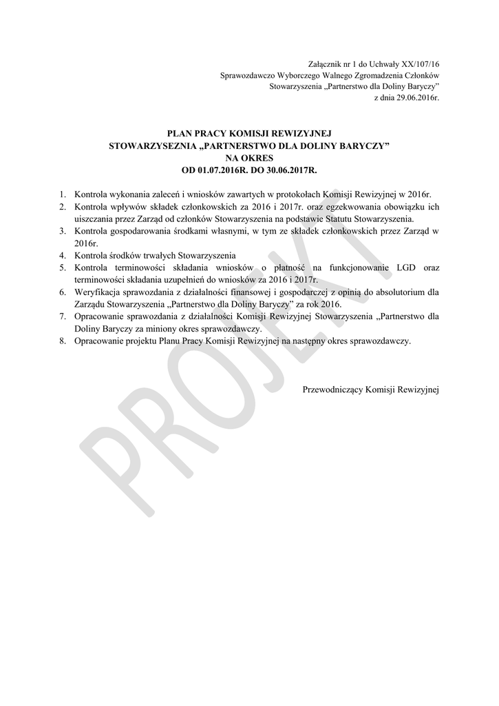Załącznik nr 1 do Uchwały XX/107/16 Sprawozdawczo Wyborczego Walnego Zgromadzenia Członków Stowarzyszenia „Partnerstwo dla Doliny Baryczy” z dnia 29.06.2016r. PLAN PRACY KOMISJI REWIZYJNEJ STOWARZYSEZNIA „PARTNERSTWO DLA DOLINY BARYCZY” NA OKRES OD 01.07.2016R. DO 30.06.2017R. 1. Kontrola wykonania zaleceń i wniosków zawartych w protokołach Komisji Rewizyjnej w 2016r. 2. Kontrola wpływów składek członkowskich za 2016 i 2017r. oraz egzekwowania obowiązku ich uiszczania przez Zarząd od członków Stowarzyszenia na podstawie Statutu Stowarzyszenia. 3. Kontrola gospodarowania środkami własnymi, w tym ze składek członkowskich przez Zarząd w 2016r. 4. Kontrola środków trwałych Stowarzyszenia 5. Kontrola terminowości składania wniosków o płatność na funkcjonowanie LGD oraz terminowości składania uzupełnień do wniosków za 2016 i 2017r. 6. Weryfikacja sprawozdania z działalności finansowej i gospodarczej z opinią do absolutorium dla Zarządu Stowarzyszenia „Partnerstwo dla Doliny Baryczy” za rok 2016. 7. Opracowanie sprawozdania z działalności Komisji Rewizyjnej Stowarzyszenia „Partnerstwo dla Doliny Baryczy za miniony okres sprawozdawczy. 8. Opracowanie projektu Planu Pracy Komisji Rewizyjnej na następny okres sprawozdawczy. Przewodniczący Komisji Rewizyjnej