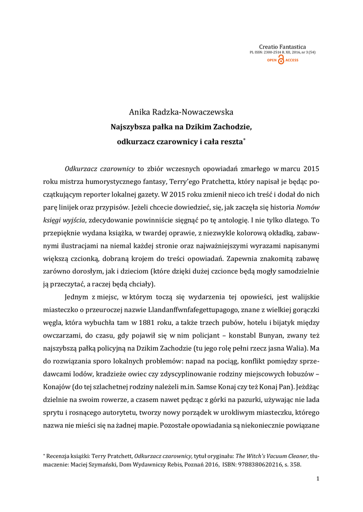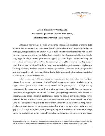 Creatio Fantastica PL ISSN: 2300-2514 R. XII, 2016, nr 3 (54) Anika Radzka-Nowaczewska Najszybsza pałka na Dzikim Zachodzie, odkurzacz czarownicy i cała reszta Odkurzacz czarownicy to zbiór wczesnych opowiadań zmarłego w marcu 2015 roku mistrza humorystycznego fantasy, Terry’ego Pratchetta, który napisał je będąc początkującym reporter lokalnej gazety. W 2015 roku zmienił nieco ich treść i dodał do nich parę linijek oraz przypisów. Jeżeli chcecie dowiedzieć, się, jak zaczęła się historia Nomów księgi wyjścia, zdecydowanie powinniście sięgnąć po tę antologię. I nie tylko dlatego. To przepięknie wydana książka, w twardej oprawie, z niezwykle kolorową okładką, zabawnymi ilustracjami na niemal każdej stronie oraz najważniejszymi wyrazami napisanymi większą czcionką, dobraną krojem do treści opowiadań. Zapewnia znakomitą zabawę zarówno dorosłym, jak i dzieciom (które dzięki dużej czcionce będą mogły samodzielnie ją przeczytać, a raczej będą chciały). Jednym z miejsc, w którym toczą się wydarzenia tej opowieści, jest walijskie miasteczko o przeuroczej nazwie Llandanffwnfafegettupagogo, znane z wielkiej gorączki węgla, która wybuchła tam w 1881 roku, a także trzech pubów, hotelu i bijatyk między owczarzami, do czasu, gdy pojawił się w nim policjant – konstabl Bunyan, zwany też najszybszą pałką policyjną na Dzikim Zachodzie (tu jego rolę pełni rzecz jasna Walia). Ma do rozwiązania sporo lokalnych problemów: napad na pociąg, konflikt pomiędzy sprzedawcami lodów, kradzieże owiec czy zdyscyplinowanie rodziny miejscowych łobuzów – Konajów (do tej szlachetnej rodziny należeli m.in. Samse Konaj czy też Konaj Pan). Jeżdżąc dzielnie na swoim rowerze, a czasem nawet pędząc z górki na pazurki, używając nie lada sprytu i rosnącego autorytetu, tworzy nowy porządek w urokliwym miasteczku, którego nazwa nie mieści się na żadnej mapie. Pozostałe opowiadania są niekoniecznie powiązane Recenzja książki: Terry Pratchett, Odkurzacz czarownicy, tytuł oryginału: The Witch's Vacuum Cleaner, tłumaczenie: Maciej Szymański, Dom Wydawniczy Rebis, Poznań 2016, ISBN: 9788380620216, s. 358. 1 ze sobą fabularnie – jednak w pełni pokazują potencjał niepodrabialnej wyobraźni Pratchetta. I tak na przykład w Zaiste strasznym bólu zęba bibliotekarz z Blackburry znajduje dziwną księgę, niechcący uwalniając czarodzieja, Czarnego Williama, który stopniowo zamienia miasteczko w osadę elżbietańską. Początkowo jego magii podlegają tylko stroje, ale z czasem także wszystkie współczesne przedmioty ulegają transformacji, a mieszkańcy zaczynają mówić gwarą elżbietańską... I należy tu podkreślić, że tłumacz bardzo dobrze poradził sobie z oddaniem humoru tej sytuacji. W zupełnie innym klimacie jest utrzymane opowiadanie Mrówka imieniem 4179003. Tym razem autor puszcza oko do dorosłych czytelników, przedstawiając historię mrówki, która uciekła z mrowiska i wreszcie miała czas na cokolwiek spojrzeć. Miłośnikom podróży w niezbadane terytoria spodoba się zapewne Darby i łódź podwodna – rzecz jasna o łodzi podwodnej z orzecha, z napędem gumkowym (cała gumkowa naprzód! s. 95), czy też Niesamowite przygody Dogginsa, w których bohater trafia do niezwykłych miejsc, lecąc sterowcem. Zaś wielbiciele magii będą się dobrze bawili czytając o perypetiach Rona, iluzjonisty z Blackburskiego Prostokąta Magicznego, który nagle zyskuje zdolność zamiany wszystkiego, czego dotyka, w coś innego, a także zapoznając się z konfliktem i kategoriami zaklęć w Wojnie czarodziejów. W książce nie brakuje oczywiście znanych dobrze fanom Pratchetta zabawnych przypisów, humoru słownego i sytuacyjnego, jednym słowem jest napisana tak, że osoby w każdym wieku znajdą w niej powód do uśmiechu. Dzieci będą się śmiały np. z policjanta, któremu pękły hamulce w rowerze, gdy jechał nim pędem z górki, czy też z papugi, która wykrzykuje nazwy różnorodnego jedzenia, oraz obrzucających się lodami sprzedawców tychże smakołyków. Dorośli zaś uznają zapewne za zabawną czarownicę na odkurzaczu (ach, ten postęp techniki!), piosenkę Ona tańczy dla mnie w owczej zagrodzie (s.208) czy krainę, w której pieniądze rosną na drzewach (nawiązanie do przysłowia Money doesn't grow on trees). Te opowiadania są niezwykłym połączeniem baśni i bajki – wszystkie ukazują barwną wyobraźnię autora, jednocześnie bez wyjątku kończąc się dobrze. Ukazane są liczne sytuacje, w których bohaterowie dbają o siebie nawzajem, potrafią się przeprosić za przykrości, które sobie sprawili, chcą, by konflikty pomiędzy innymi zostały raz na zawsze rozwiązane i nie wahają się, by sobie pomagać w trudnych momentach. Reasumując, ten zbiór różnorodnych tematycznie i klimatycznie opowiadań to wspaniała zabawa dla całej rodziny – mogłabym rekomendować czytanie jej dzieciom przed snem, ale może się okazać, że po tej lekturze wcale nie będą mogły zasnąć ze 2 śmiechu (dorośli zresztą też). To wspaniała, lekka i zabawna, intensywnie pobudzająca wyobraźnię, ale jednocześnie mądra książka, która z pewnością zachęci w niejednego młodego człowieka do sięgnięcia po kolejne utwory fantastyczne. I jednocześnie zapewniam, że jej czytanie jest dużo łatwiejsze niż śledzenie rowerów w walijskich górach, w dodatku w blasku księżyca! 3