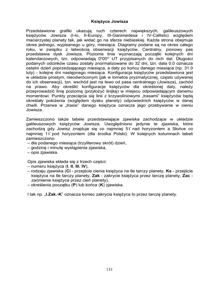 Księżyce Jowisza Przedstawione grafiki ukazują ruch czterech największych, galileuszowych księżyców Jowisza (I-Io, II-Europy, III-Ganimedesa i IV-Callisto) względem macierzystej planety tak, jak widać go na sferze niebieskiej. Każda strona obejmuje okres jednego, wypisanego u góry, miesiąca. Diagramy podane są na okres całego roku, w związku z łatwością obserwacji księżyców. Centralny, pionowy pas przedstawia dysk Jowisza. Poziome linie wyznaczają początki kolejnych dni kalendarzowych, tzn. odpowiadają 0h00m UT przypisanych do nich dat. Długości podanych odcinków czasu zostały znormalizowane do 32 dni, tzn. data 0.0 oznacza ostatni dzień poprzedzającego miesiąca, a daty po końcu danego miesiąca (np. 31.0 luty) - kolejne dni następnego miesiąca. Konfiguracja księżyców przedstawiona jest w układzie prostym, nieodwróconym (jak w lornetce pryzmatycznej, często używanej do ich obserwacji), tzn. wschód jest na lewo od pasa centralnego (Jowisza), zachód na prawo. Aby określić konfiguracje księżyców dla określonej daty, należy przeprowadzić linię poziomą (przyłożyć linijkę) w miejscu odpowiadającym danemu momentowi. Punkty przecięcia się linii z krzywoliniowymi „trasami” księżyców będą określały położenia (względem dysku planety) odpowiednich księżyców w danej chwili. Przerwa w „trasie” danego księżyca oznacza jego przebywanie w cieniu Jowisza. Zamieszczono także tabele przedstawiające zjawiska zachodzące w układzie galileuszowych księżyców Jowisza. Uwzględniono jedynie te zjawiska, które zachodzą gdy Jowisz znajduje się co najmniej 5° nad horyzontem a Słońce co najmniej 1° pod horyzontem (dla środka Polski). W kolejnych kolumnach tabeli zamieszczono: – dla podanego miesiąca (trzyliterowy skrót) dzień, – godzinę i minutę wystąpienia zjawiska, – opis zjawiska. Opis zjawiska składa się z trzech części: – numeru księżyca (I, II, III, IV), – rodzaju zjawiska (Ci - przejście cienia księżyca na tle tarczy planety, Ks - przejście księżyca na tle tarczy planety, Zak - zakrycie księżyca przez tarczę planety, Zac zaćmienie księżyca przez cień planety), – określenia początku (P) lub końca (K) zjawiska. I tak np. „I.Zak.-K” oznacza koniec zakrycia księżyca Io przez tarczę planety. 131