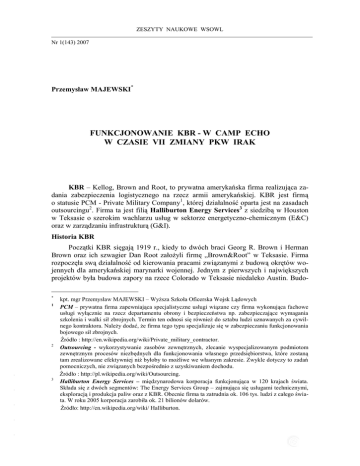 ZESZYTY NAUKOWE WSOWL Nr 1(143) 2007 Przemysław MAJEWSKI* FUNKCJONOWANIE KBR - W CAMP ECHO W CZASIE VII ZMIANY PKW IRAK KBR – Kellog, Brown and Root, to prywatna amerykańska firma realizująca zadania zabezpieczenia logistycznego na rzecz armii amerykańskiej. KBR jest firmą o statusie PCM - Private Military Company1, której działalność oparta jest na zasadach outsourcingu2. Firma ta jest filią Halliburton Energy Services3 z siedzibą w Houston w Teksasie o szerokim wachlarzu usług w sektorze energetyczno-chemicznym (E&C) oraz w zarządzaniu infrastrukturą (G&I). Historia KBR Początki KBR sięgają 1919 r., kiedy to dwóch braci Georg R. Brown i Herman Brown oraz ich szwagier Dan Root założyli firmę „Brown&Root” w Teksasie. Firma rozpoczęła swą działalność od kierowania pracami związanymi z budową okrętów wojennych dla amerykańskiej marynarki wojennej. Jednym z pierwszych i największych projektów była budowa zapory na rzece Colorado w Teksasie niedaleko Austin. Budo* 1 - 2 - - - - 3 kpt. mgr Przemysław MAJEWSKI – Wyższa Szkoła Oficerska Wojsk Lądowych PCM – prywatna firma zapewniająca specjalistyczne usługi wiązane czy firma wykonująca fachowe usługi wyłącznie na rzecz departamentu obrony i bezpieczeństwa np. zabezpieczające wymagania szkolenia i walki sił zbrojnych. Termin ten odnosi się również do sztabu ludzi uznawanych za cywilnego kontraktora. Należy dodać, że firma tego typu specjalizuje się w zabezpieczaniu funkcjonowania bojowego sił zbrojnych. Źródło : http://en.wikipedia.org/wiki/Private_military_contractor. Outsourcing - wykorzystywanie zasobów zewnętrznych, zlecanie wyspecjalizowanym podmiotom zewnętrznym procesów niezbędnych dla funkcjonowania własnego przedsiębiorstwa, które zostaną tam zrealizowane efektywniej niż byłoby to możliwe we własnym zakresie. Zwykle dotyczy to zadań pomocniczych, nie związanych bezpośrednio z uzyskiwaniem dochodu. Źródło : http://pl.wikipedia.org/wiki/Outsourcing. Halliburton Energy Services – międzynarodowa korporacja funkcjonująca w 120 krajach świata. Składa się z dwóch segmentów: The Energy Services Group – zajmująca się usługami technicznymi, eksploracją i produkcja paliw oraz z KBR. Obecnie firma ta zatrudnia ok. 106 tys. ludzi z całego świata. W roku 2005 korporacja zarobiła ok. 21 bilionów dolarów. Źródło: http://en.wikipedia.org/wiki/ Halliburton. Przemysław MAJEWSKI wę zapory aktywnie wspierał lokalny kongresman Lyndon B. Johnson, dzięki któremu firma w późniejszym okresie otrzymała kilkanaście kontraktów na rzecz armii amerykańskiej. W czasie II wojny światowej firma „Brown&Root” wybudowała „Naval Air Station Corpus Christi”4 w Teksasie, a w 1947 r. pierwszą na świecie platformę morską. Ponadto firma ta była jednym z głównych wykonawców projektu „Peligre Dam” 5 dla Haiti, podpisanego przez US Army Cors of Engineers6. W 1962 r., po śmierci jednego z założycieli Hermana Browna, „Brown&Root” została wchłonięta przez kompanię Halliburton, a do jej nazwy dodano człon Kellog. Kolejny okres świetności firmy to 85% udział w rozbudowie infrastruktury potrzebnej Armii Amerykańskiej w czasie wojny w Wietnamie. Następny okres rozkwitu firmy rozpoczął się w 1966 r., kiedy ówczesny prezydent USA Bill Clinton obdarzył „Brown&Root” kontraktem, w ramach którego firma zabezpieczała żołnierzy amerykańskich oraz żołnierzy innych krajów członkowskich NATO, biorących udział w operacji na Bałkanach w ramach SFOR 7. Od 1999 r. kontrakt ten został rozbudowany o siły KFOR8 i obejmował szeroki wachlarz usług logistycznych dla stacjonujących w tamtym rejonie wojsk, takich jak: usługi pralnicze, cateringowe, rozrywkowe (internet, filmy video) oraz rekreacyjne. Usługi firmy KBR były bardzo wysoko oceniane zarówno przez żołnierzy, jak i pracowników cywilnych, tworząc w ten sposób kolejny sukces firmy oraz przekonanie, że sektor prywatny będąc odpowiednio zdeterminowany, finansowo jest w stanie lepiej zabezpieczy codzienne funkcjonowanie wojsk rozmieszczonych w danym rejonie działań. W grudniu 2001 r. US Army wynajęło KBR do zabezpieczenia operacji dla ok. 100 tys. żołnierzy w Iraku na mocy kontraktu o wartości ok. 200 mln dolarów w ramach LOGCAP9. Jeden z kolejnych kontraktów, w ramach tego programu, dotyczył naprawy obiektów naftowych po operacji w Iraku oraz budowy więzień dla jeńców wojennych o łącznej wartości ponad 28 mln dolarów. W 2002 r. KBR wygrał kolejny kontrakt o wartości ok. 100 mln dolarów na odbudowanie amerykańskiej ambasady w Kabulu (Afganistan) oraz 15 kolejnych programów LOGCAP na sumę ponad 216 mln dolarów, celem zabezpieczenia operacji Enduring Freedom10 w Afganistanie. 4 5 - 6 7 8 - 9 - - 10 Naval Air Station Corpus Christi – baza amerykańskiej marynarki wojennej, której budowę zainicjowano w 1938, a pierwsze ćwiczenia bojowe odbyto 05.05.1941r. Źródło: http://en.wikipedia.org/wiki/ Naval_Air_Station_Corpus_Christi. Peligre Dam – projekt budowy tamy na Haiti w latach siedemdziesiątych XX wieku. U.S. Army Cors of Engineers (USACE) – jest firmą zatrudniającą ok. 35 tys. osób zapewniających specjalistyczne usługi dla rządu amerykańskiego. SFOR – Stabilisation Force, siły międzynarodowe w Bośni I Hercegowinie. KFOR – Kosowo Force, siły międzynarodowe w Kosowie. LOGCAP - Logistics Civil Augmentation Program (Cywilny Program Logistycznego Rozwoju). OPERATION ENDURING FREEDOM – operacja wojskowa przeprowadzana w Afganistanie przez NATO w ramach „Wojny z terroryzmem” przeciw Talibom i al-Qaedzie oraz jej liderowi Osama bin Laden. - 144 FUNKCJONOWANIE KBR W CAMP ECHO W CZASIE VII ZMIANY PKW IRAK W 2005 r. firma KBR podjęła się dość ambitnego projektu związanego z oceną oraz usunięciem zniszczeń oraz odbudową „Gulf Coast Marine”11 i jednostek „Navy”12 po zniszczeniach dokonanych przez 