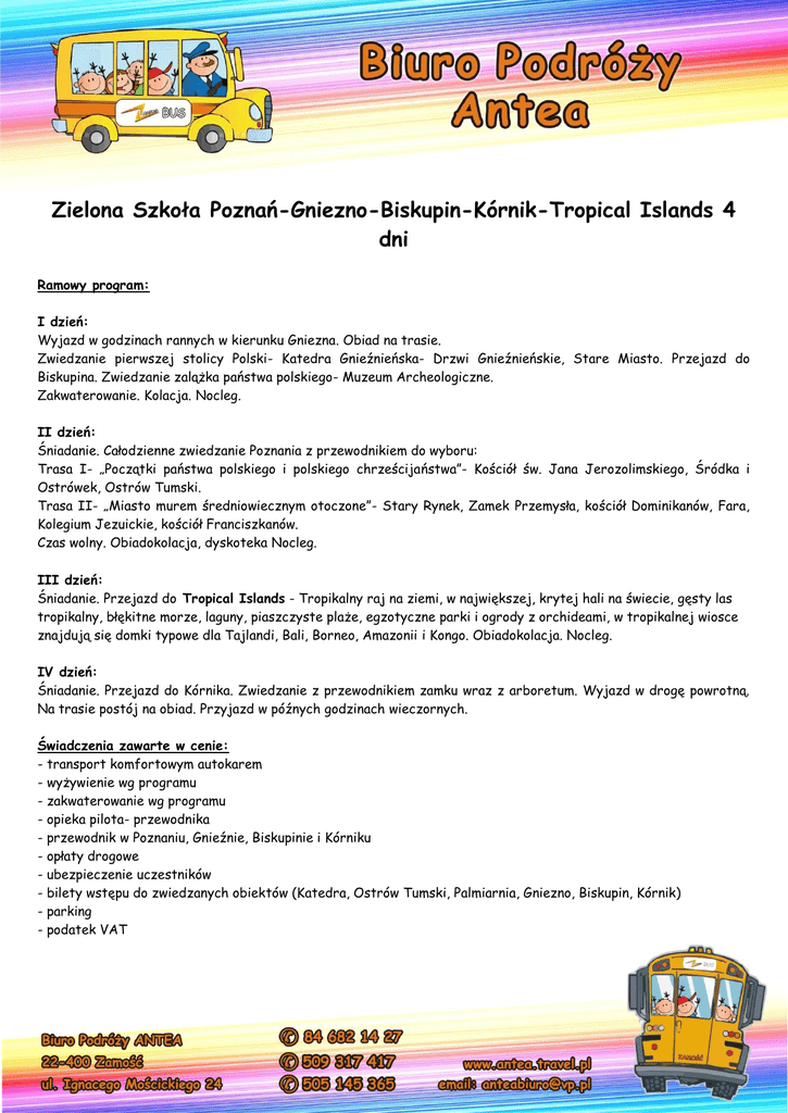 Zielona Szkoła Poznań-Gniezno-Biskupin-Kórnik-Tropical Islands 4 dni Ramowy program: I dzień: Wyjazd w godzinach rannych w kierunku Gniezna. Obiad na trasie. Zwiedzanie pierwszej stolicy Polski- Katedra Gnieźnieńska- Drzwi Gnieźnieńskie, Stare Miasto. Przejazd do Biskupina. Zwiedzanie zalążka państwa polskiego- Muzeum Archeologiczne. Zakwaterowanie. Kolacja. Nocleg. II dzień: Śniadanie. Całodzienne zwiedzanie Poznania z przewodnikiem do wyboru: Trasa I- „Początki państwa polskiego i polskiego chrześcijaństwa”- Kościół św. Jana Jerozolimskiego, Śródka i Ostrówek, Ostrów Tumski. Trasa II- „Miasto murem średniowiecznym otoczone”- Stary Rynek, Zamek Przemysła, kościół Dominikanów, Fara, Kolegium Jezuickie, kościół Franciszkanów. Czas wolny. Obiadokolacja, dyskoteka Nocleg. III dzień: Śniadanie. Przejazd do Tropical Islands - Tropikalny raj na ziemi, w największej, krytej hali na świecie, gęsty las tropikalny, błękitne morze, laguny, piaszczyste plaże, egzotyczne parki i ogrody z orchideami, w tropikalnej wiosce znajdują się domki typowe dla Tajlandi, Bali, Borneo, Amazonii i Kongo. Obiadokolacja. Nocleg. IV dzień: Śniadanie. Przejazd do Kórnika. Zwiedzanie z przewodnikiem zamku wraz z arboretum. Wyjazd w drogę powrotną. Na trasie postój na obiad. Przyjazd w późnych godzinach wieczornych. Świadczenia zawarte w cenie: - transport komfortowym autokarem - wyżywienie wg programu - zakwaterowanie wg programu - opieka pilota- przewodnika - przewodnik w Poznaniu, Gnieźnie, Biskupinie i Kórniku - opłaty drogowe - ubezpieczenie uczestników - bilety wstępu do zwiedzanych obiektów (Katedra, Ostrów Tumski, Palmiarnia, Gniezno, Biskupin, Kórnik) - parking - podatek VAT