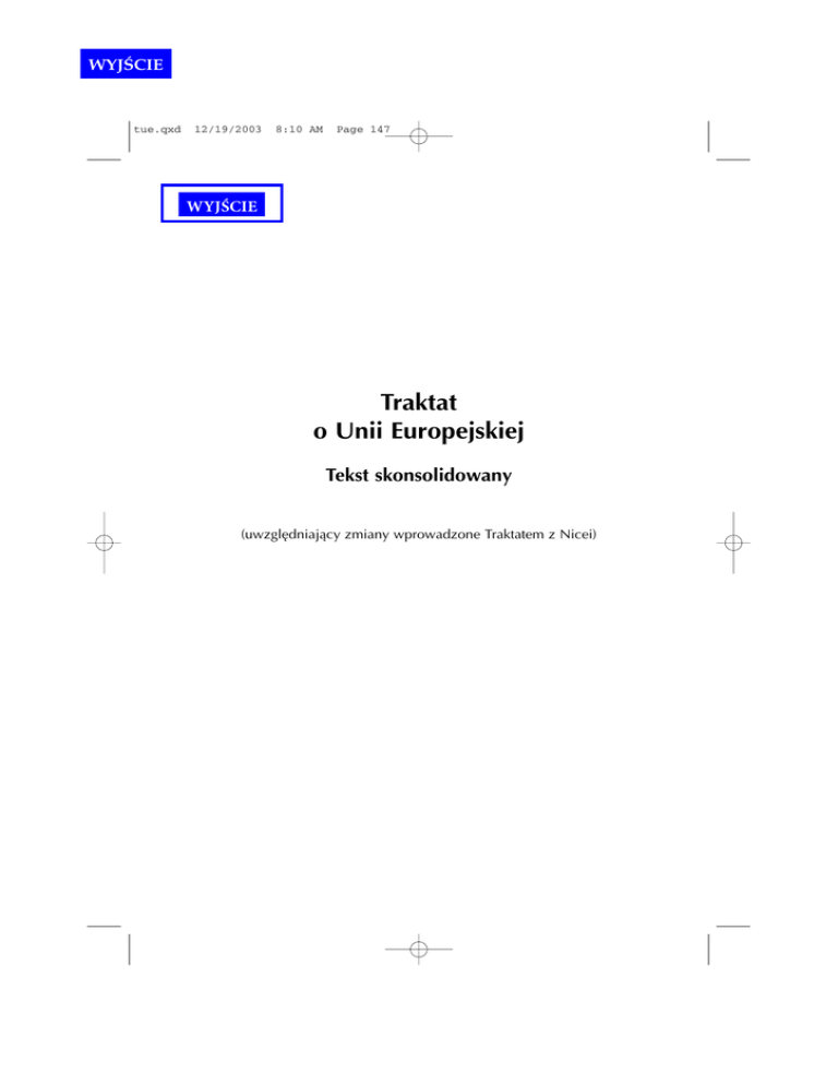WYJŚCIE tue.qxd 12/19/2003 8:10 AM Page 147 WYJŚCIE Traktat o Unii Europejskiej Tekst skonsolidowany (uwzglêdniaj¹cy zmiany wprowadzone Traktatem z Nicei) tue.qxd 12/19/2003 8:10 AM Page 148 tue.qxd 12/19/2003 8:10 AM Page 149 JEGO KRÓLEWSKA MOŒÆ KRÓL BELGÓW, JEJ KRÓLEWSKA MOŒÆ KRÓLOWA DANII, PREZYDENT REPUBLIKI FEDERALNEJ NIEMIEC, PREZYDENT REPUBLIKI GRECKIEJ, JEGO KRÓLEWSKA MOŒÆ KRÓL HISZPANII, PREZYDENT REPUBLIKI FRANCUSKIEJ, PREZYDENT IRLANDII, PREZYDENT REPUBLIKI W£OSKIEJ, JEGO KRÓLEWSKA WYSOKOŒÆ WIELKI KSI¥¯Ê LUKSEMBURGA, JEJ KRÓLEWSKA MOŒÆ KRÓLOWA NIDERLANDÓW, PREZYDENT REPUBLIKI PORTUGALSKIEJ, JEJ KRÓLEWSKA MOŒÆ KRÓLOWA ZJEDNOCZONEGO KRÓLESTWA WIELKIEJ BRYTANII I IRLANDII PÓ£NOCNEJ, ZDECYDOWANI przejœæ do nowego etapu procesu integracji europejskiej, zapocz¹tkowanego ustanowieniem Wspólnot Europejskich, PRZYWO£UJ¥C historyczne znaczenie przezwyciê¿enia podzia³u kontynentu europejskiego oraz potrzebê ustanowienia trwa³ych podstaw budowy przysz³ej Europy, POTWIERDZAJ¥C swe przywi¹zanie do zasad wolnoœci, demokracji, poszanowania praw cz³owieka i podstawowych wolnoœci oraz pañstwa prawnego, POTWIERDZAJ¥C swe przywi¹zanie do podstawowych praw socjalnych okreœlonych w Europejskiej Karcie Spo³ecznej, podpisanej w Turynie dnia 18 paŸdziernika 1961 roku, oraz we Wspólnotowej Karcie Socjalnych Praw Podstawowych Pracowników z 1989 roku, PRAGN¥C pog³êbiæ solidarnoœæ miêdzy swymi narodami w poszanowaniu ich historii, kultury i tradycji, PRAGN¥C umocniæ demokratyczny charakter i skutecznoœæ dzia³ania instytucji, tak aby by³y one w stanie lepiej spe³niaæ, w jednolitych ramach instytucjonalnych, powierzone im zadania, ZDECYDOWANI umocniæ swe gospodarki, a tak¿e doprowadziæ do ich konwergencji oraz do ustanowienia unii gospodarczej i walutowej, w tym – zgodnie z postanowieniami niniejszego Traktatu – jednej i stabilnej waluty, WYRA¯AJ¥C MOCN¥ WOLÊ popierania postêpu gospodarczego i spo³ecznego swych narodów poprzez urzeczywistnienie rynku wewnêtrznego oraz umacnianie spójnoœci i ochrony œrodowiska naturalnego, przy uwzglêdnieniu zasady sta³ego rozwoju, oraz prowadzenia polityk, które zapewni¹, ¿e integracji gospodarczej towarzyszyæ bêdzie równoczesny postêp w innych dziedzinach, 149 tue.qxd 12/19/2003 8:10 AM Page 150 ZDECYDOWANI ustanowiæ wspólne obywatelstwo dla obywateli swych krajów, ZDECYDOWANI realizowaæ wspóln¹ politykê zagraniczn¹ i bezpieczeñstwa, w tym stopniowo okreœlaæ wspóln¹ politykê obronn¹, która mog³aby prowadziæ do wspólnej obrony, zgodnie z artyku³em 17, wzmacniaj¹c w ten sposób to¿samoœæ i niezale¿noœæ Europy w celu wspierania pokoju, bezpieczeñstwa oraz postêpu w Europie i na œwiecie, ZDECYDOWANI u³atwiæ swobodny przep³yw osób, przy zapewnieniu bezpieczeñstwa swym narodom, poprzez ustanowienie przestrzeni wolnoœci, bezpieczeñstwa i sprawiedliwoœci, zgodnie z postanowieniami niniejszego Traktatu, ZDECYDOWANI kontynuowaæ proces tworzenia coraz œciœlejszego zwi¹zku miêdzy narodami Europy, w którym decyzje s¹ podejmowane jak najbli¿ej obywateli, zgodnie z zasad¹ pomocniczoœci, MAJ¥C NA UWADZE dalsze kroki, które nale¿y przedsiêwzi¹æ na rzecz rozwoju integracji europejskiej, POSTANOWILI ustanowiæ Uniê Europejsk¹ i w tym celu powo³ali jako swych pe³nomocników: JEGO KRÓLEWSKA MOŒÆ KRÓL BELGÓW: Marka EYSKENSA, Ministra Spraw Zagranicznych; Philippe’a MAYSTADTA, Ministra Finansów; JEJ KRÓLEWSKA MOŒÆ KRÓLOWA DANII: Uffe ELLEMANNA-JENSENA, Ministra Spraw Zagranicznych; Andersa FOGHA RASMUSSENA, Ministra Gospodarki; PREZYDENT REPUBLIKI FEDERALNEJ NIEMIEC: Hansa-Dietricha GENSCHERA, Federalnego Ministra Spraw Zagranicznych; Theodora WAIGLA, Federalnego Ministra Finansów; PREZYDENT REPUBLIKI GRECKIEJ: Antoniosa SAMARASA, Ministra Spraw Zagranicznych; Efthymiosa CHRISTODOULU, Ministra Gospodarki; JEGO KRÓLEWSKA MOŒÆ KRÓL HISZPANII: Francisco FERNANDEZA ORDONEZA, Ministra Spraw Zagranicznych; Carlosa SOLCHAGÊ CATALANA, Ministra Gospodarki i Finansów; 150 tue.qxd 12/19/2003 8:10 AM Page 151 PREZYDENT REPUBLIKI FRANCUSKIEJ: Rolanda DUMASA, Ministra Spraw Zagranicznych; Pierre’a BEREGOVOY, Ministra Gospodarki, Finansów i Bud¿etu; PREZYDENT IRLANDII: Gerarda COLLINSA, Ministra Spraw Zagranicznych; Bertie AHERNA, Ministra Finansów; PREZYDENT REPUBLIKI W£OSKIEJ: Gianniego DE MICHELISA, Ministra Spraw Zagranicznych; Guida CARLIEGO, Ministra Skarbu; JEGO KRÓLEWSKA WYSOKOŒÆ WIELKI KSI¥¯Ê LUKSEMBURGA: Jacques’a F. POOSA, Wicepremiera, Ministra Spraw Zagranicznych; Jeana-Claude’a JUNCKERA, Ministra Finansów; JEJ KRÓLEWSKA MOŒÆ KRÓLOWA NIDERLANDÓW: Hansa VAN DEN BROEKA, Ministra Spraw Zagranicznych; Willema KOKA, Ministra Finansów; PREZYDENT REPUBLIKI PORTUGALSKIEJ: Joao de Deusa PINHEIRÊ, Ministra Spraw Zagranicznych; Jorge BRAGÊ DE MACEDO, Ministra Finansów; JEJ KRÓLEWSKA MOŒÆ KRÓLOWA ZJEDNOCZONEGO KRÓLESTWA WIELKIEJ BRYTANII I IRLANDII PÓ£NOCNEJ: The Rt. Hon. Douglasa HURDA, Sekretarza Stanu do spraw Zagranicznych i Wspólnoty Brytyjskiej; The Hon. Francisa MAUDE’A, Sekretarza Finansów w Ministerstwie Skarbu; KTÓRZY, po wymianie swych pe³nomocnictw uznanych za nale¿yte i sporz¹dzone we w³aœciwej formie, uzgodnili, co nastêpuje: tue.qxd 12/19/2003 8:10 AM Page 152 TYTU£ I POSTANOWIENIA WSPÓLNE Artyku³ 1 Niniejszym Traktatem WYSOKIE UMAWIAJ¥CE SIÊ STRONY ustanawiaj¹ miêdzy sob¹ UNIÊ EUROPEJSK¥, zwan¹ dalej „Uni¹”. Niniejszy Traktat wyznacza nowy etap w procesie tworzenia coraz œciœlejszego zwi¹zku miêdzy narodami Europy, w którym decyzje podejmowane s¹ z mo¿liwie najwy¿szym poszanowaniem zasady otwartoœci i jak najbli¿ej obywateli. Uniê stanowi¹ Wspólnoty Europejskie, uzupe³nione politykami i formami wspó³pracy przewidzianymi niniejszym Traktatem. Jej zadaniem jest kszta³towanie w sposób spójny i solidarny stosunków miêdzy Pañstwami Cz³onkow