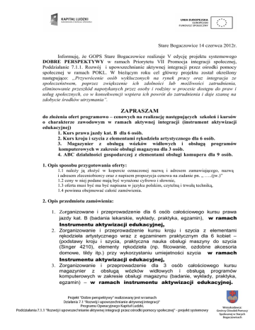 Stare Bogaczowice 14 czerwca 2012r. Informuję, że GOPS Stare Bogaczowice realizuje V edycję projektu systemowego DOBRE PERSPEKTYWY w ramach Priorytetu VII Promocja integracji społecznej, Poddziałanie 7.1.1. Rozwój i upowszechnianie aktywnej integracji przez ośrodki pomocy społecznej w ramach POKL. W bieżącym roku cel główny projektu został określony następująco: „Przywrócenie osób wykluczonych na rynek pracy oraz integracja ze społeczeństwem, poprzez zwiększenie ich zdolności lub możliwości zatrudnienia, eliminowanie przeszkód napotykanych przez osoby i rodziny w procesie dostępu do praw i usług społecznych, co w konsekwencji wspiera ich powrót do zatrudnienia i daje szansę na zdobycie środków utrzymania”. ZAPRASZAM do złożenia ofert programowo – cenowych na realizację następujących szkoleń i kursów o charakterze zawodowym w ramach aktywnej integracji (instrument aktywizacji edukacyjnej) 1. Kurs prawa jazdy kat. B dla 6 osób. 2. Kurs kroju i szycia z elementami rękodzieła artystycznego dla 6 osób. 3. Magazynier z obsługą wózków widłowych i obsługą programów komputerowych w zakresie obsługi magazynu dla 3 osób. 4. ABC działalności gospodarczej z elementami obsługi komupera dla 9 osób. 1. Opis sposobu przygotowania oferty: 1.1 należy ją złożyć w kopercie oznaczonej nazwą i adresem zamawiającego, nazwą i adresem zleceniobiorcy oraz z napisem propozycja cenowa na zadanie pn. „ …..(jw.)” 1.2 ceny w niej podane mają być wyrażone cyfrowo i słownie, 1.3 oferta musi być ma być napisana w języku polskim, czytelną i trwałą techniką, 1.4 powinna obejmować całość zamówienia. 2. Opis przedmiotu zamówienia: 1. Zorganizowane i przeprowadzenie dla 6 osób całościowego kursu prawa jazdy kat. B (badania lekarskie, wykłady, praktyka, egzamin), w ramach Instrumentu aktywizacji edukacyjnej, 2. Zorganizowanie i przeprowadzenie kursu kroju i szycia z elementami rękodzieła artystycznego wraz z egzaminem praktycznym dla 6 kobiet – (podstawy kroju i szycia, praktyczna nauka obsługi maszyny do szycia (Singer 4210), elementy rękodzieła (np. filcowanie, ozdobne akcesoria domowe, tildy itp.) przy wykorzystaniu umiejetności szycia w ramach Instrumentu aktywizacji edukacyjnej, 3. Zorganizowanie i przeprowadzenie dla 3 osób całościowego kursu magazynier z obsługą wózków widłowych i obsługą programów komputerowych w zakresie obsługi magazynu (badanie, wykłady, praktyka, egzamin) – w ramach instrumentu aktywizacji edukacyjnej. 4. Zorganizowanie i przeprowadzenie szkolenia (wykłady, praktyka i egzamin) dla 9 osób – ABC działalności gospodarczej z elementami obsługi komputera – uczestnicy zdobędą wiedzę jak założyć własną działalność, jakie z tego tytułu ciążą obowiązki (podatki, podstawowe obowiązki z tyt. ubezpieczenia), jakie są możliwości pozyskania środków na otwarcie działalnośći, zasady sprzedaży internetowej, zakładanie poczty elektronicznej). − Zapewnienie (podczas całego trwania zajęć aktywnej integracji) dla uczestników: − materiałów szkoleniowych dla 9 uczestników, bazy sprzętowej zapewniającej płynną realizację szkoleń, kadry prowadzącej o odpowiednich kwalifikacjach, bufetu w trakcie zajęć (kawa, herbata, w razie konieczności zimne napoje oraz ciepły posiłek wtrakcie zajęć trwających 6 i więcej godzin, przygotowanie ankiet ewaluacyjnych dla uczestników przed rozpoczęciem i po zakończeniu zajęć, wypracowanie dokumentów aplikacyjnych z uczestnikami, prowadzenie zajęć i dokumentacji szkoleń (listy obecności, potwierdzenia, sprawozdania, certyfikaty itp.) zgodnie z zasadami promocji projektów realizowanych w ramach EFS, − zorganizowanie dowozu uczestników na zajęcia grupowe (wykłady) - oprócz dojazdu na indywidualne lekcje (jazdy) w trakcie kursu prawa jazdy, na które poszcególni uczestnicy będą dojeżdzać sami. − wydanie zaświadczeń o nabytych uprawnieniach (ukończeniu kursów) − ubezpieczenie uczestników od nieszczęsliwych wypadków na czas trwania kursów − Informacje dodatkowe: zajęcia mogą odbywać się w miejscu dogodnym dla realizatora. Istnieje możliwość wynajęcia sali komputerowej w Gminnym Centrum Edukacyjno-Społecznym w Starych Bogaczowicach, które wyposażone jest w pracownię komputerową wg najnowszych technologii do zajęć kursu „ABC działalności gospodarczej …” Wykonawca będzie zobowiązany także do: − Dołożenia należytej staranności i prawidłowej realizacji ramowego programu szkolenia. − Systematycznej oceny postępów uczestników szkolenia, indywidualizacji kształcenia wobec osób mających trudności w procesie nauczania, − Bieżącego informowania Zamawiającego o : - wszystkich przypadkach nieobecności na szkoleniu osób skierowanych - rezygnacji uczestnika ze szkolenia trakcie jego trwania, pod rygorem odmowy zapłaty za szkolenia tych osób, - przypadkach zmian kadry szkoleniowej oraz innych zmian dotyczących przebiegu szkolenia. − Przekazania zamawiającemu w terminie 14 dni od daty zakończenia szkoleń następujących dokumentów: - oryginałów bądź potwierdzonych za zgodność z oryginałem kopii zaświadczeń o ukończeniu szkolenia, - list obecności kursantów na szkoleniu - dokumentacji dotyczącej ewaluacji i monitoringu. − Opatrzenia w logo EFS, które jest zgodne z wytycznymi wszelkich materiałów szkoleniowych oraz dokumentów przekazywanych do Zamawiającego wraz z wystawioną fakturą oraz zaświadczeń o ukończeniu szkolenia, do umieszczenia realizowanych szkoleń na stronie internetowej − Wykonawca szkolenia otwartego realizowanego w ramach Projektu rejestruje instytucję szkoleniową w internetowej bazie ofert szkoleniowych na stronie: www.inwestycjawkadry.pl i aktualizuje w tej bazie informacje nie rzadziej niż raz w miesiącu. 3. Wymagany termin realizacji umowy: od 1 lipca 2012r. do 30.09.2012r. 4. Wymagane dokument