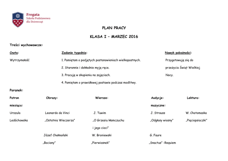 PLAN PRACY KLASA I – MARZEC 2016 Treści wychowawcze: Cnota: Zadanie tygodnia: Nawyk pobożności: Wytrzymałość 1. Pamiętam o podjętych postanowieniach wielkopostnych. Przygotowuję się do 2. Starannie i dokładnie myję ręce. przeżycia Świąt Wielkiej 3. Pracuję w skupieniu na zajęciach. Nocy. 4. Pamiętam o prawidłowej postawie podczas modlitwy. Poranek: Patron Obrazy: Wiersze: miesiąca: Audycje: Lektura: muzyczne: Urszula Leonardo da Vinci Ledóchowska „Ostatnia Wieczerza” J. Tuwim „O Grzesiu kłamczuchu J. Strauss W. Chotomaska „Odgłosy wiosny” „Pięciopsiaczki” i jego cioci” Józef Chełmoński „Bociany” W. Broniewski „Pierwiosnek” G. Faure „Snactus” -Requiem Treści edukacyjne: polonistyczne: legendy pt. : „Lech, Czech i Rus”, matematyczne: rozwiązywanie zadań tekstowych, sąsiedzi Polaków dodawanie i odejmowanie w zakresie kierunki świata 15 polskie miasta, jeziora, rzeki i szczyty „Wars i Sawa” opowiadania Ali i Adama: „Pokaz mody”, „Leniuchowanie na tapczanie”, „Kosmiczne pytania”, „Wielkanocna przygoda”, „Na wsi u wujka Janka” poznanie sposobów zmiękczania spółgłosek spółgłoski miękkie: „ć”, „ci”, „ń”’, „ni”, „ś”, „si” układanie pytań do odpowiedzi rozpoznawanie samogłosek pisanie wyrazów i zdań w zeszycie czytanie z podziałem na role lektura: W. Chotomska, „Pięciopsiaczki” przyrodnicze: zaznaczanie pełnych godzin na tarczy górskie zegarowej planety Układu Słonecznego obliczenia zegarowe zjawisko dnia i nocy kolejność miesięcy wiosna na wsi grafy matematyczne wyrażenia mianowane marzec 2016 – I klasa poniedziałek wtorek 1 środa 2 czwartek 3 piątek sobota niedziela 4 5 6 11 12 13 19 20 ur. Kasi Piotrowskiej 7 8 9 10 Wyjście do Zoo 14 15 16 17 18 rekolekcje wielkopostne 21 22 23 24 25 26 27 ur. Hani rekolekcje wielkopostne rekolekcje wielkopostne ur. Natalii Wielki Czwartek Wielki Piątek Wielka Sobota Wielkanoc 28 29 30 31 Wielkanoc