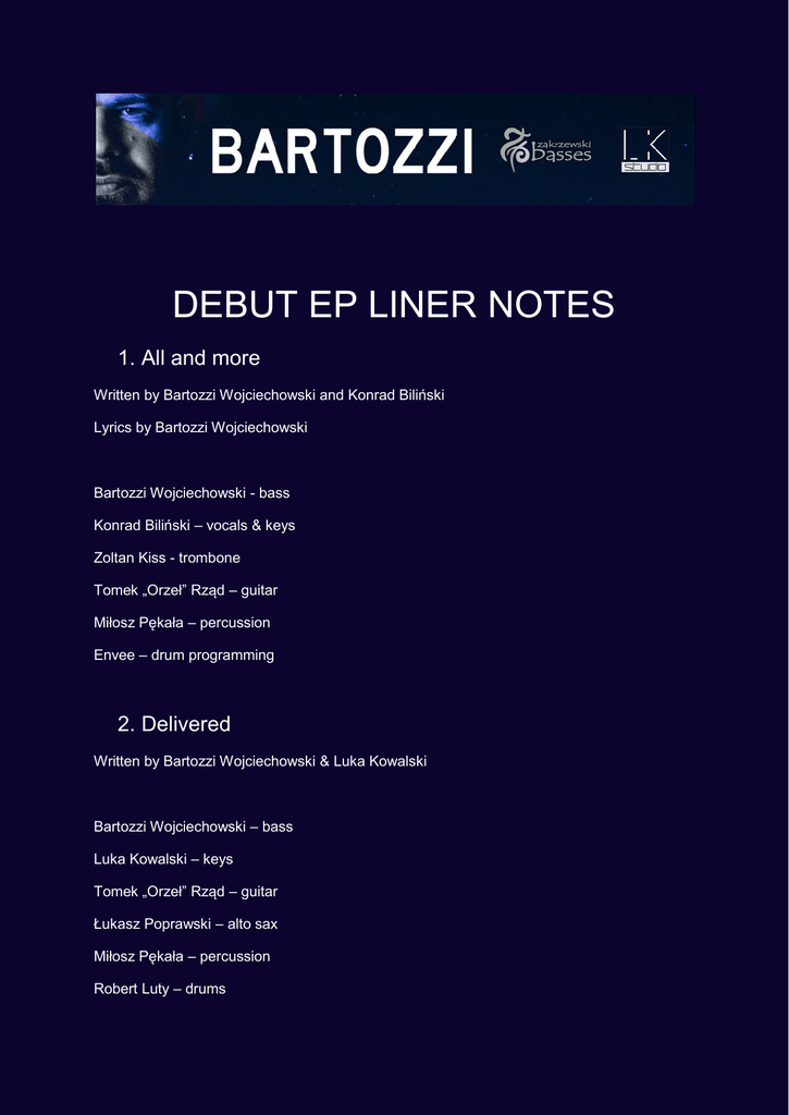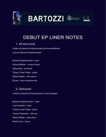 DEBUT EP LINER NOTES 1. All and more Written by Bartozzi Wojciechowski and Konrad Biliński Lyrics by Bartozzi Wojciechowski Bartozzi Wojciechowski - bass Konrad Biliński – vocals & keys Zoltan Kiss - trombone Tomek „Orzeł” Rząd – guitar Miłosz Pękała – percussion Envee – drum programming 2. Delivered Written by Bartozzi Wojciechowski & Luka Kowalski Bartozzi Wojciechowski – bass Luka Kowalski – keys Tomek „Orzeł” Rząd – guitar Łukasz Poprawski – alto sax Miłosz Pękała – percussion Robert Luty – drums 3. Told you so Witten by Bartozzi Wojciechowski Bartozzi Wojciechowski – bass Konrad Biliński – moog & keys Luka Kowalski – keys Łukasz Poprawski – alto sax Miłosz Pękała – percussion Derrick McKenzie – drums 4. Fromscratch Written by Bartozzi Wojciechowski & Atanas Valkov Bartozzi Wojciechowski – bass Atanas Valkov – keys In intro Luka Kowalski – keys Adam Rapa – trumpet Zoltan Kiss - trombone Łukasz Poprawski – alto sax Miłosz Pękała - percussion Robert Luty - drums 5. Thinkin’ of you Written by Maru$ Piotrowski, Konrad Biliński & Bartozzi Wojciechowski Bartozzi Wojciechowski – bass Konrad Biliński – vocals Maru$ Piotrowski – rhodes piano Luka Kowalski – keys Kuba Chmielarski – guitar Miłosz Pękała - percussion Derrick McKenzie – drums All drums were recorded at Woobie Doobie Studio B In Sulejówek, Poland, engineered by Łukasz Błasiński. All other instruments and vocals (except bass) were recorded in various home studios, engineered by Bartozzi, Envee, or the musician himself. Some of the recordings were done back In ’09, so the overall timespan of making of this EP is 5 years. Makes it 1 year per song… interesting :) Bass was recorded In LK Studio In Kielce, Poland In January 2014. Produced by Bartozzi. Additional production by Envee, Konrad Biliński & Luka Kowalski. Mixing & Mastering was done In January 2014 by Luka Kowalski In LK studio. The only bass used for this record is my Zakrzewski Essential. I also use Looptrotter Audio Engineering studio equipment, such as the MiniMonster custom channel strip and the Monster stereo compressor. Derrick McKenzie plays Yamaha drums, Sabian cymbals, Vic Firth drumsticks and Aquarian drumheads. THANKS I would like to thank my parents, my gran Ludwika and my aunt Magda for their love, patience and neverending support. My lovely Lena for giving my life a new meaning. Piotr Zakrzewski and Brunon Niewiński of the incredible Zakrzewski Basses team, for their incredible support and care over the years. My best friend in the world Zoltan Kiss (Bracie, Ty wiesz!), my fantastic friend Luka Kowalski – he made sure this record was finished no matter what! My great friends – Envee and Konrad Biliński – without you guys this record would never be complete! Robert Luty – you made those songs into what they are! Derrick McKenzie – for lifechanging drumparts and the ever-evolving musical friendship! Łukasz Błasiński – you make the drummers sound better everytime! Shout out to my fam: Wojtek Pilichowski, Piotr Żaczek, Tomek „Orzeł” Rząd, Kuba Chmielarski, Łukasz „Łamek” Szafrański (thx for the support and hospitality, Bro!), Maceo Wyro (we be Nephews, son!), Miłosz Pękała, Atanas Valkov, Maru$ Piotrowski, Bartek Królik, Kuba Badach, Grzegorz Jabłoński, Rafał Stępień, Hubert Miziołek of Audiostacja, Andrzej „Looptrotter” Starzyk (the support never ends! Proud of ya Bro!) Arek Wielgosik, Krzysiek Polesiński, Shane Soloski, Hadrien Feraud (thx for the support Bro!), Andrew Gouche (much love Bro!), Andrzej Piaseczny, my good’ol LO27 crew – Łukasz Lach, Kuba Molęda, Szymon Szopiński, Bartek Szopiński & the lovely Banaszewskie twins (I haven’t forgotten! Let’s get together sometime guys!), Kacper Kacperczyk, Ewa Kacperczyk, Krzysztof Kacperczyk, Małgorzata Kacperczyk, Emilia Benedykcińska (you go girl!), my old friends form the FUSE – Michał „Fox” Król and Marcin „U1” Ułanowski, Marcin Szaniawski, the crew at the Rockandroll Warsaw store... and aynone I forgot to mention. You guys made me who I am today, and I’ll always appreciate that! January 22nd, 2014.