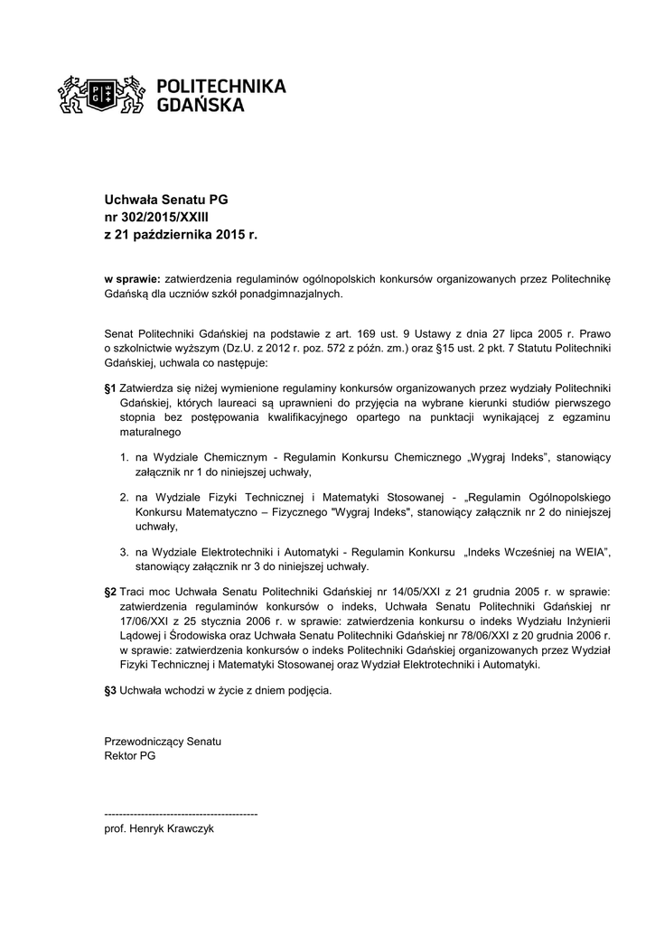Uchwała Senatu PG nr 302/2015/XXIII z 21 października 2015 r. w sprawie: zatwierdzenia regulaminów ogólnopolskich konkursów organizowanych przez Politechnikę Gdańską dla uczniów szkół ponadgimnazjalnych. Senat Politechniki Gdańskiej na podstawie z art. 169 ust. 9 Ustawy z dnia 27 lipca 2005 r. Prawo o szkolnictwie wyższym (Dz.U. z 2012 r. poz. 572 z późn. zm.) oraz §15 ust. 2 pkt. 7 Statutu Politechniki Gdańskiej, uchwala co następuje: §1 Zatwierdza się niżej wymienione regulaminy konkursów organizowanych przez wydziały Politechniki Gdańskiej, których laureaci są uprawnieni do przyjęcia na wybrane kierunki studiów pierwszego stopnia bez postępowania kwalifikacyjnego opartego na punktacji wynikającej z egzaminu maturalnego 1. na Wydziale Chemicznym - Regulamin Konkursu Chemicznego „Wygraj Indeks”, stanowiący załącznik nr 1 do niniejszej uchwały, 2. na Wydziale Fizyki Technicznej i Matematyki Stosowanej - „Regulamin Ogólnopolskiego Konkursu Matematyczno – Fizycznego "Wygraj Indeks", stanowiący załącznik nr 2 do niniejszej uchwały, 3. na Wydziale Elektrotechniki i Automatyki - Regulamin Konkursu „Indeks Wcześniej na WEIA”, stanowiący załącznik nr 3 do niniejszej uchwały. §2 Traci moc Uchwała Senatu Politechniki Gdańskiej nr 14/05/XXI z 21 grudnia 2005 r. w sprawie: zatwierdzenia regulaminów konkursów o indeks, Uchwała Senatu Politechniki Gdańskiej nr 17/06/XXI z 25 stycznia 2006 r. w sprawie: zatwierdzenia konkursu o indeks Wydziału Inżynierii Lądowej i Środowiska oraz Uchwała Senatu Politechniki Gdańskiej nr 78/06/XXI z 20 grudnia 2006 r. w sprawie: zatwierdzenia konkursów o indeks Politechniki Gdańskiej organizowanych przez Wydział Fizyki Technicznej i Matematyki Stosowanej oraz Wydział Elektrotechniki i Automatyki. §3 Uchwała wchodzi w życie z dniem podjęcia. Przewodniczący Senatu Rektor PG -----------------------------------------prof. Henryk Krawczyk Załącznik nr 1 do Uchwały Senatu PG Nr 302/2015/XXIII z 21 października 2015 r. Regulamin Konkursu Chemicznego „Wygraj Indeks” §1 INFORMACJE OGÓLNE 1. Organizatorem konkursu „Wygraj Indeks” jest Wydział Chemiczny Politechniki Gdańskiej. 2. Konkurs adresowany jest do uczniów szkół ponadgimnazjalnych. W wyjątkowych przypadkach – wyłącznie za pośrednictwem szkoły – możliwy jest udział uczniów ostatnich klas gimnazjów. Szkoła (dyrekcja) powinna uzasadnić pisemnie takie zgłoszenie i umożliwić kontakt mailowy lub telefoniczny z nauczycielem chemii w danej szkole. 3. Celem konkursu jest rozwijanie zainteresowań chemią szerokiego kręgu młodzieży, możliwość sprawdzenia swej wiedzy poza szkołą i porównania jej z rówieśnikami z różnych stron Polski, jak również możliwość bezpośredniego kontaktu ze środowiskiem akademickim. 4. Konkurs organizowany jest corocznie. 5. Konkursowe materiały informacyjne, regulamin, listy osób zakwalifikowanych do II etapu i lista laureatów konkursu będą zamieszczane na stronie www.chem.pg.edu.pl §2 ORGANIZACJA KONKURSU 1. Konkurs składa się z 2 etapów 2. Etap I polega na rozwiązaniu zadań i problemów chemicznych umieszczonych (15 listopada) na stronie www.chem.pg.edu.pl oraz przesłaniu prac na adres: Dziekanat Wydziału Chemicznego Politechnika Dziekanat Gdańska ul. G. Narutowicza 11/12 80-233 Gdańsk (z dopiskiem Konkurs Chemiczny) 3. Ostateczny termin nadsyłania prac konkursowych upływa 15 lutego (liczy się data stempla pocztowego). 4. Do pracy konkursowej należy dołączyć kartę zgłoszeniową (załącznik 1) oraz wyrażenie zgody na przetwarzanie danych osobowych (załącznik 2). W przypadku osób niepełnoletnich załączniki wypełnia opiekun prawny uczestnika konkursu. 5. Prace bez dołączonych załączników nie będą sprawdzane. 6. Praca konkursowa może być przesłana indywidualnie lub przez szkołę. 7. Do etapu finałowego kwalifikuje się uczestnik który otrzymał co najmniej 80% możliwych punktów. 8. Organizatorzy powiadamiają uczestników o wynikach Etapu I w terminie do 7dni roboczych licząc od daty wskazanej w ust. 3 poprzez opublikowanie listy osób zakwalifikowanych do Etapu II na stronie www.chem.pg.edu.pl. 9. Udział uczniów w eliminacjach konkursowych jest dobrowolny. 10. Etap II (finałowy) odbywa się na terenie Politechniki Gdańskiej w ostatnią sobotę marca 11. Organizator zastrzega sobie prawo do zmiany terminu II Etapu Konkursu, przy czym zobowiązuje się do poinformowania uczestników o ewentualnej zmianie przynajmniej z dwutygodniowym wyprzedzeniem. 12. Uczeń przystępujący do finałowego etapu konkursu zobowiązany jest do posiadania dowodu tożsamości lub ważnej legitymacji szkolnej. 13. Czas przeznaczony na rozwiązanie zadań wynosi 60 min. 14. W czasie rozwiązywania zadań uczniowie mają prawo do korzystania z własnego prostego kalkulatora oraz z układu okresowego przygotowanego przez organizatora konkursu. 15. Organizacja konkursów uwzględnia potrzeby osób niepełnosprawnych oraz przewlekle chorych poprzez dostosowanie warunków przeprowadzenia konkursu do potrzeb ww. uczestników konkursu (dostosowanie nie może naruszać zasad samodzielnej pracy uczestnika konkursu). 16. Podczas trwania konkursu uczeń pracuje samodzielnie, zachowuje spokój i nie zakłóca w żaden inny sposób przebiegu konkursu (nie opuszcza wyznaczonego mu w sali miejsca, nie porozumiewa się z innymi uczestnikami, nie korzysta z żadnych niedozwolonych materiałów i środków łączności, w tym telefonów komórkowych). 17. W szczególnych przypadkach uczeń może opuścić salę, w której rozwiązuje zadania konkursowe, w każdym czasie po poinformowaniu o swoim zamiarze komisji konkursowej i oddaniu pracy konkursowej przewodniczącemu komisji. 18. Uczestnik konkursu, który ukończył pracę przed wyznaczonym czasem, opuszcza salę za zgodą przewodniczącego komisji. 19. W przypadku stwierdzenia przez komisję naruszenia przez ucz