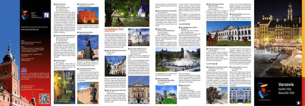 12 Musée de Varsovie Warsaw Tourist Information [email protected] Portail officiel du tourisme de la Ville de Varsovie www.warsawtour.pl (Muzeum Warszawy) Rynek Starego Miasta 28/42 tél. +48 22 635 16 25 www.muzeumwarszawy.pl Il occupe une série de plus d’une dizaine d’immeubles restaurés de la Vieille Ville de Varsovie et trois cours. L’exposition retrace l’histoire de la ville, dès sa fondation jusqu’à nos jours. Actuellement le Musée est fermé pour cause de rénovation. Les souterrain et le cinéma sont accessibles. Le cinéma du musée présente un film documentaire sur Varsovie pendant la seconde guerre mondiale (1939–1945), qui passe du mardi au dimanche en anglais (les versions polonaise, espagnole, française et allemande sont disponibles sur demande). 15 Le Barbacane et les remparts Ce sont les vestiges des remparts de Varsovie, élevés au XVIème siècle par J.Baptiste Venitien. 16 Monument de Jan Kiliński (Pomnik Jana Kilińskiego) 13 Musée de Littérature Adam Mickiewicz Éditeur: L’Office de Tourisme de la Ville de Varsovie (Stołeczne Biuro Turystyki) Photos: H. Czarnocki, W. Hansen, J. Jastrzębski, P. Miller, T. Nowak, Z. Panów pzstudio.pl, P. Wierzbowski, E. Miszczyk (photo de couverture) Carte du projet: „Moyo – Teresa Witkowska, www.moyo.pl” Édition III, Warszawa 2014 Exemplaire gratuit (Muzeum Literatury im. Adama Mickiewicza) Rynek Starego Miasta 20 tél. +48 22 831 40 61 www.muzeumliteratury.pl Adam Mickiewicz fut l’un des plus grands poètes polonais de l’époque du romantisme. Le Musée réunit une vaste collection des souvenirs de Mickiewicz, ainsi que des manuscrits et des souvenirs d’autres écrivains polonais, des œuvres d’art et d’iconographie, qui reflètent les époques littéraires des époques anciennes jusqu’aux temps modernes. 14 L’escalier en pierre (Kamienne Schodki) Un très pittoresque escalier datant du XVème siècle qui, dans le passé, fut même emprunté par Napoleon, lui-même, lors d’une de ses visites à Varsovie. Facebook.com/Warsaw Twitter@ewarsaw Instagram.com/fall_in_love_with_warsaw 21 Place du Marché de la Nouvelle Ville (Rynek Nowego Miasta) Créé au XVème siècle au début il fut rectangulaire et presque deux fois plus grand que le Marché de la Vieille Ville. Au milieu de la place se trouvait l’hôtel de ville, démoli en 1818. Aujourd’hui, sur le Marché, se trouve un petit puits en fonte, orné des armes de la Nouvelle Ville, une jeune fille avec une Licorne. LA NOUVELLE VILLE Cette partie de Varsovie fut crée à la fin du XIVème siècle et jusqu’au XVIIIème elle fonctionnait en tant qu’une ville indépendante, avec sa propre administration, son hôtel de ville et son église. La plupart des maisons de style baroque et néo-classique, réunies autour du marché, c’est la reconstruction après la guerre. Ces petites rues pleines de charme abritent aujourd’hui plusieurs restaurants et cafés. (Kościół św. Ducha) ul. Długa 3 Monument du cordonnier héroïque, dirigeant du peuple de Varsovie de l’Insurrection de Kościuszko (XVIIIème siècle). 17 Le Monument du Petit Insurgé (Pomnik Małego Powstańca) ul. Podwale à l’intersection de la rue Wąski Dunaj Une statue d’un jeune garçon portant un casque militaire, trop grand pour lui, qui fut élevée pour commémorer les jeunes héros luttant contre l’occupant, pendant l’insurrection de Varsovie. 22 Église St-Casimir (des Soeurs du Saint-Sacrement) (NOWE MIASTO) 18 Église du Saint-Esprit des pères Paulins WarsawPass – l’entrée gratuit aux atractions les plus connues. La carte est disponible aux offices d’ Information Touristique de Varovie, les musées sélectionnés et sur la page www.warsawpass.com. La carte est acceptée au Château Royal de Varsovie. naises en Amérique lui a transmis l’argent pour l’ouverture de l’Institut du Radium en Pologne. (Barbakan i mury obronne) Église date du XVIIIème siècle. Depuis près de 300 ans, chaque année début août part d’ici le plus grand pèlerinage pédestre pour le sanctuaire de la Sainte Vierge à Częstochowa. L’église avoisine le plus petit immeuble de Varsovie, qui abrite de nos jours un kiosque. 19 Église St-Jacques des pères Dominicains (Kościół św. Jacka) ul.Freta 10 www.freta.dominikanie.pl Construit avec le couvent au XVIIème siècle. Lors de l’Insurrection de Varsovie, l’église, qui abritait un hôpital insurrectionnel, fut bombardée, ce qui entraîna la mort de 1000 personnes environ. (Kościół św. Kazimierza ) Rynek Nowego Miasta 2 Au début, c’était une résidence des magnats. Elle fut achetée par la reine Maria Kazimiera Sobieska (Marysieńka) et transformée en église. Lors de l’Insurrection de Varsovie en 1944, l’église hébergeait un hôpital insurrection nel et un abri pour la population civile. Suite L’une des églises les plus anciennes de Varsovie, construite au début du XVème. Elle aurait été construite, selon des témoignages, à l’emplacement d’un temple païen. Elle fut le temple des pêcheurs et des artisans. À côté de l’église, il y a un point d’observation, qui offre une vue panoramique sur la Vistule et sur la rive droite de Varsovie ainsi que l’escalier qui mène au Parc Multimédial des Fontaines. à Podzamcze (Multimedialny Park Fontan na Podzamczu) Skwer I Dywizji Pancernej Situé dans un endroit plein de charme, tout près de la Vieille Ville et de la Vistule. Lors des spectacles multimédiaux 367 puissants conduits font jaillir même 30 mille litres d’eau par minute et presque 300 projecteurs de couleur éclairent les jets d’eau. De temps en temps, sur le fond de la brume de l’eau pulvérisée, apparaissent des anima27 Palais des Sapieha (Pałac Sapiehów) ul. Zakroczymska 6 Construit au XVIIIème siècle et au début du XIXème transformé en casernes de Sapieha. Pendant les 20 années entre les deux guerres il abrita un hôpital militaire. Aujou