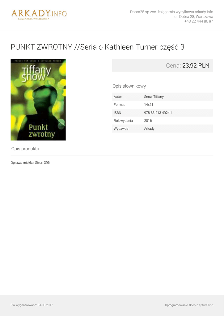 Dobra28 sp zoo. księgarnia wysyłkowa arkady.info ul. Dobra 28, Warszawa +48 22 444 86 97 PUNKT ZWROTNY //Seria o Kathleen Turner część 3 Cena: 23,92 PLN Opis słownikowy Autor Snow Tiffany Format 14x21 ISBN 978-83-213-4924-4 Rok wydania 2016 Wydawca Arkady Opis produktu Oprawa miękka, Stron 396 Plik wygenerowano: 04-03-2017 Powered by TCPDF (www.tcpdf.org) Oprogramowanie sklepu: AptusShop