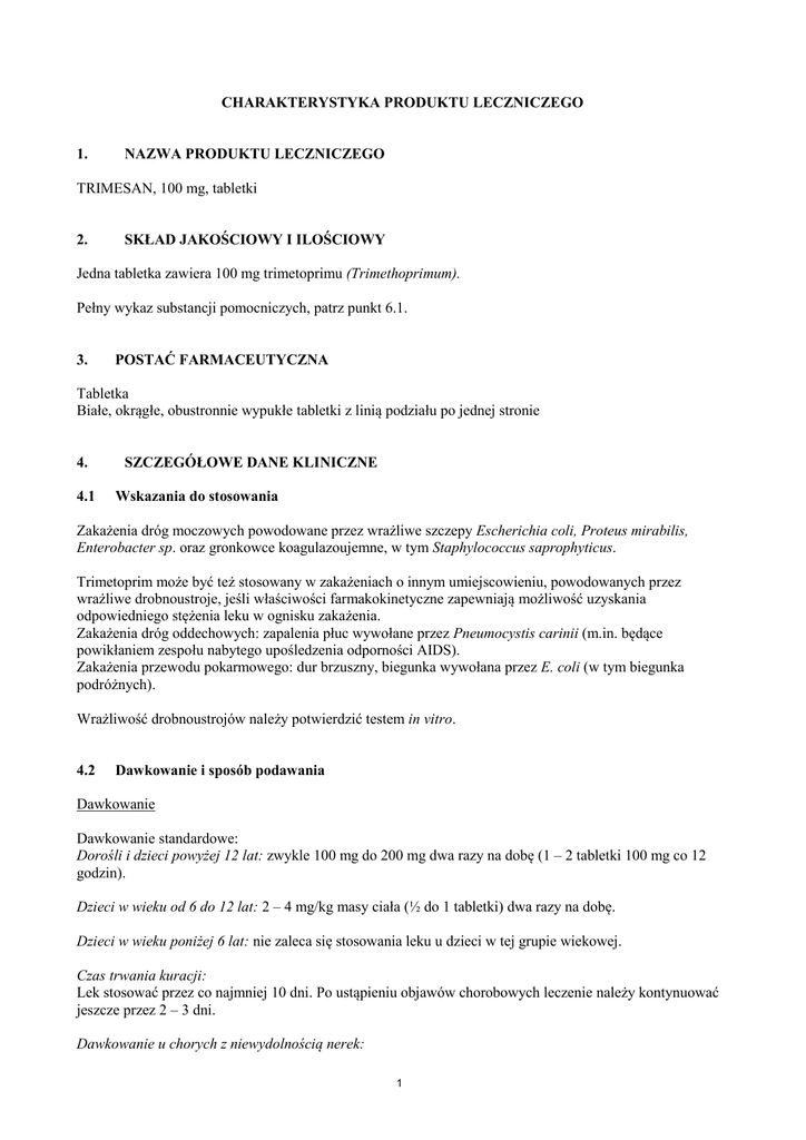CHARAKTERYSTYKA PRODUKTU LECZNICZEGO 1. NAZWA PRODUKTU LECZNICZEGO TRIMESAN, 100 mg, tabletki 2. SKŁAD JAKOŚCIOWY I ILOŚCIOWY Jedna tabletka zawiera 100 mg trimetoprimu (Trimethoprimum). Pełny wykaz substancji pomocniczych, patrz punkt 6.1. 3. POSTAĆ FARMACEUTYCZNA Tabletka Białe, okrągłe, obustronnie wypukłe tabletki z linią podziału po jednej stronie 4. 4.1 SZCZEGÓŁOWE DANE KLINICZNE Wskazania do stosowania Zakażenia dróg moczowych powodowane przez wrażliwe szczepy Escherichia coli, Proteus mirabilis, Enterobacter sp. oraz gronkowce koagulazoujemne, w tym Staphylococcus saprophyticus. Trimetoprim może być też stosowany w zakażeniach o innym umiejscowieniu, powodowanych przez wrażliwe drobnoustroje, jeśli właściwości farmakokinetyczne zapewniają możliwość uzyskania odpowiedniego stężenia leku w ognisku zakażenia. Zakażenia dróg oddechowych: zapalenia płuc wywołane przez Pneumocystis carinii (m.in. będące powikłaniem zespołu nabytego upośledzenia odporności AIDS). Zakażenia przewodu pokarmowego: dur brzuszny, biegunka wywołana przez E. coli (w tym biegunka podróżnych). Wrażliwość drobnoustrojów należy potwierdzić testem in vitro. 4.2 Dawkowanie i sposób podawania Dawkowanie Dawkowanie standardowe: Dorośli i dzieci powyżej 12 lat: zwykle 100 mg do 200 mg dwa razy na dobę (1 – 2 tabletki 100 mg co 12 godzin). Dzieci w wieku od 6 do 12 lat: 2 – 4 mg/kg masy ciała (½ do 1 tabletki) dwa razy na dobę. Dzieci w wieku poniżej 6 lat: nie zaleca się stosowania leku u dzieci w tej grupie wiekowej. Czas trwania kuracji: Lek stosować przez co najmniej 10 dni. Po ustąpieniu objawów chorobowych leczenie należy kontynuować jeszcze przez 2 – 3 dni. Dawkowanie u chorych z niewydolnością nerek: 1 W przypadku klirensu kreatyniny powyżej 30 ml/min stosuje się dawkę standardową. W przypadku klirensu kreatyniny 15 – 30 ml/min – dawka wynosi 50 mg (½ tabletki) co 12 godzin. Nie zaleca się stosowania leku u osób z klirensem kreatyniny poniżej 15 ml/min. Dawkowanie specjalne: U chorych na dur brzuszny – początkowo 300 mg (3 tabletki) co 12 godzin (przez 2 do 3 dni), a następnie 200 mg (2 tabletki) co 12 godzin. U chorych z pneumocystozowym zapaleniem płuc dawka wynosi około 5 mg/kg masy ciała co 8 godzin lub 300 mg co 8 godzin. W przypadku leczenia skojarzonego razem z dapsonem należy stosować 100 mg/dobę. U chorych, którzy reagują na lek w ciągu pierwszych 72 godzin, leczenie należy kontynuować przez 14 dni. W przypadku biegunki podróżnych dawka wynosi 200 mg (2 tabletki) co 12 godzin. Sposób podawania Podanie doustne. Tabletki można dzielić. 4.3 Przeciwwskazania - Nadwrażliwość na substancję czynną lub na którąkolwiek substancję pomocniczą wymienioną w punkcie 6.1. - Niedokrwistość megaloblastyczna związana z niedoborem kwasu foliowego. - Okres ciąży. - Ciężka niewydolność nerek. 4.4 Specjalne ostrzeżenia i środki ostrożności dotyczące stosowania Trimetoprim w rzadkich przypadkach może powodować zaburzenia w układzie krwiotwórczym. Wczesnymi objawami tych zaburzeń mogą być m.in. ból gardła, gorączka, wybroczyny. Pojawienie się objawów mogących wskazywać na uszkodzenie szpiku jest wskazaniem do natychmiastowego wykonania badania morfologii krwi z rozmazem. Jeśli badanie wykaże zmniejszenie liczby któregokolwiek upostaciowanego składnika krwi, lek należy odstawić. U osób z niedoborem kwasu foliowego lub z podejrzeniem takiego niedoboru, lek należy stosować ostrożnie. Trimetoprim należy stosować ostrożnie u osób z zaburzeniami czynności wątroby lub nerek. 4.5 Interakcje z innymi produktami leczniczymi i inne rodzaje interakcji Trimetoprim hamuje metabolizm fenytoiny. Jednoczesne stosowanie trimetoprimu może przedłużyć okres półtrwania fenytoiny o 50%. Jeśli stosowanie obu leków jest niezbędne, należy obserwować pacjenta w kierunku potencjalnego przedawkowania fenytoiny. Jednoczesne stosowanie trimetoprimu może zwiększać niedobory kwasu foliowego wywołane przez inne leki (np. fenytoinę, metotreksat). Trimetoprim może zwiększać działanie warfaryny. Trimetoprim zwiększa działanie digoksyny, prokainamidu. Ryfampicyna wpływa na wydalanie trimetoprimu, zmniejszając jego stężenie. Trimetoprim i dapson wzajemnie zwiększają swoje stężenia we krwi. 2 Trimetoprim hamuje wymianę sód – potas w kanaliku dystalnym. Kliniczne konsekwencje jednoczesnego stosowania trimetoprimu z diuretykami oszczędzającymi potas nie są znane, jednak nie można wykluczyć potencjalnego zwiększenia ryzyka hiperkaliemii. 4.6 Wpływ na płodność, ciążę i laktację Ciąża Wyniki badań przedklinicznych wskazują na możliwość wystąpienia zaburzeń rozwojowych płodu, dlatego nie należy stosować trimetoprimu w czasie ciąży. Karmienie piersią Trimetoprim przenika do mleka ludzkiego. Nie zaleca się stosowania trimetoprimu podczas karmienia piersią. 4.7 Wpływ na zdolność prowadzenia pojazdów i obsługiwania maszyn Brak doniesień o wpływie na zdolność prowadzenia pojazdów i obsługiwania maszyn. 4.8 Działania niepożądane Częstość występowania działań niepożądanych określono następująco: Bardzo często (≥1/10); Często (≥1/100 do <1/10); Niezbyt często (≥1/1 000 do <1/100); Rzadko (≥1/10 000 do <1/1 000); Bardzo rzadko (<1/10 000); Częstość nieznana (częstość nie może być określona na podstawie dostępnych danych). Zaburzenia krwi i układu chłonnego Trombocytopenia, leukopenia, neutropenia, niedokrwistość megaloblastyczna, methemoglobinemia. Zaburzenia układu immunologicznego Rzadko odnotowano nadwrażliwość w postaci zespołu Stevensa-Johnsona, zespołu Lyella lub wstrząsu anafilaktycznego. Zaburzenia żołądka i jelit Uczucie dyskomfortu w nadbrzuszu, nudności, wymioty, zapalenie języka. Zaburzenia skóry i tkanki podskórnej Najczęściej występują wysypki skórne, świąd oraz nadwrażliwoś