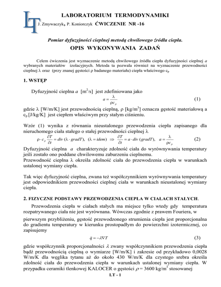 LABORATORIUM TERMODYNAMIKI J. Zmywaczyk, P. Koniorczyk ĆWICZENIE NR -16 Pomiar dyfuzyjności cieplnej metodą chwilowego źródła ciepła. OPIS WYKONYWANIA ZADAŃ Celem ćwiczenia jest wyznaczenie metodą chwilowego źródła ciepła dyfuzyjności cieplnej a wybranych materiałów izolacyjnych. Metoda ta pozwala również na wyznaczenie przewodności cieplnej oraz (przy znanej gęstości badanego materiału) ciepła właściwego cp 1. WSTĘP Dyfuzyjność cieplna a [m2/s] jest zdefiniowana jako a c p (1) gdzie [W/m/K] jest przewodnością cieplną, [kg/m3] oznacza gęstość materiałową a cp [J/kg/K] jest ciepłem właściwym przy stałym ciśnieniu. Wzór (1) wynika z równania nieustalonego przewodzenia ciepła zapisanego dla nieruchomego ciała stałego o stałej przewodności cieplnej cp T T div ( gradT ), ( idem ) a div ( gradT ), a t t c p (2) Dyfuzyjność cieplna a charakteryzuje zdolność ciała do wyrównywania temperatury jeśli zostało ono poddane chwilowemu zaburzeniu cieplnemu. Przewodność cieplna określa zdolność ciała do przewodzenia ciepła w warunkach ustalonej wymiany ciepła. Tak więc dyfuzyjność cieplna, zwana też współczynnikiem wyrównywania temperatury jest odpowiednikiem przewodności cieplnej ciała w warunkach nieustalonej wymiany ciepła. 2. FIZYCZNE PODSTAWY PRZEWODZENIA CIEPŁA W CIAŁACH STAŁYCH. Przewodzenia ciepła w ciałach stałych ma miejsce tylko wtedy gdy temperatura rozpatrywanego ciała nie jest wyrównana. Wówczas zgodnie z prawem Fouriera, w pierwszym przybliżeniu, gęstość przewodzonego strumienia ciepła jest proporcjonalna do gradientu temperatury w kierunku prostopadłym do powierzchni izotermicznej, co zapisujemy q T (3) gdzie współczynnik proporcjonalności zwany współczynnikiem przewodzenia ciepła bądź przewodnością cieplną o wymiarze [W/m/K] i zakresie od przykładowo 0,0028 W/m/K dla węglika tytanu aż do około 430 W/m/K dla czystego srebra określa zdolność ciała do przewodzenia ciepła w warunkach ustalonej wymiany ciepła. W przypadku ceramiki tlenkowej KALOCER o gęstości = 3600 kg/m3 stosowanej LT - 1 LABORATORIUM TERMODYNAMIKI J. Zmywaczyk, P. Koniorczyk ĆWICZENIE NR -16 w urządzeniach, gdzie występują ekstremalne warunki ścierne i temperaturowe, jej przewodność cieplna zawiera się w granicach od 14 W/m/K do około 21 W/m/K. Przewodzenie ciepła w ciałach stałych nie zachodzi w ten sposób, że energia wyprowadzona z jednej części ciała przemieszcza się prostoliniowo do innej części tego ciała, bo wówczas strumień przewodzonego ciepła q musiałby zależeć tylko od różnicy temperatury T między jego końcami i to bez względu na długość rozpatrywanego ciała. Skoro zaś strumień ciepła zależy od gradientu temperatury więc nośniki energii dyfundują przez to ciało ulegając po drodze licznym zderzeniom o charakterze przypadkowym, a to oznacza, że proces przewodzenia ciepła ma charakter stochastyczny. Przewodzenie ciepła w metalach jest spowodowane głównie ruchem swobodnych elektronów, a w znacznie mniejszym stopniu drganiami sieci krystalicznej wokół położenia równowagi, których kwanty energii nazywamy fononami. W tym przypadku przewodność cieplną można traktować jako addytywną sumę jej składowej elektronowej e oraz fononowej f e f (4) Przewodność cieplna czystych metali zależy głównie od technologii ich otrzymywania (jak dużo znajduje się zanieczyszczeń) oraz od obróbki termicznej decydującej o strukturze metalu. Zależność przewodności cieplnej od temperatury w przypadku metali oraz ich stopów dana jest w postaci ogólnej [1] T 1 FT m BT C DT E e f (5) Zależność (5) uwzględnia wyniki badań eksperymentalnych oraz badań teoretycznych tej grupy ciał, przy czym drugi nawias powyższego wyrażenia dotyczy fononowej składowej przewodności cieplnej i uwzględnia ograniczenia drogi swobodnej fononów w wyniku rozpraszania ich przez fonony, elektrony, defekty sieci krystalicznej i domieszki. W przypadku półprzewodników o bardzo dużej oporności elektrycznej i dielektryków ich przewodność cieplna jest zdominowana przez mechanizm fononowy, gdzie przyjmuje się, że fonony zderzają się tak jak cząsteczki gazu doskonałego i wówczas ma zastosowanie elementarna teoria kinetyczna na podstawie której uzyskuje się 1 3 f cv wl (6) gdzie l jest średnią drogą swobodną fononu, w oznacza prędkość fononów, czyli lokalną prędkość dźwięku, cv jest ciepłem właściwym przy stałej objętości a oznacza gęstość materiałową. Przykładowo dla kwarcu umieszczonego równolegle do osi optycznej znajdującego się w temperaturze 273,15 K po do wzoru (6) następujących wartości liczbowych [2] LT - 2 LABORATORIUM TERMODYNAMIKI J. Zmywaczyk, P. Koniorczyk ĆWICZENIE NR -16 (cv) = 0,484,19106 [J/m3/K] = 2,0112106 [J/m3/K], w = 5103 m/s, l = 40 Å otrzymujemy 1 3 f 2,0112 10 6 5 103 40 10 10 13,408 W mK (7) Uzyskana wartość liczbowa przewodności cieplnej kwarcu w temperaturze 273,15 K jest zgodna z wynikami pracy zamieszczonymi w [3] 3. OPIS METODY ODWROTNEJ WYZNACZANIA PRZEWODNOŚCI CIEPLNEJ DYFUZYJNOŚCI CIEPLNEJ I OBJĘTOŚCIOWEJ POJEMNOŚCI CIEPLNEJ Przewodność cieplna często jest wyznaczana metodą stanu ustalonego w oparciu o aparat płytowy Poensgena bądź jego modyfikacje. Zasadniczą wadą tej metody jest stosunkowo długi czas, wynoszący kilka godzin, niezbędny do zapewnienia warunków ustalonej wymiany ciepła w badanej próbce. W proponowanej metodzie, należącej do grupy metod, znanych w literaturze pod nazwą "pulse methods" problem pomiaru dyfuzyjności cieplnej sprowadza się do wytworzenia chwilowego źródła ciepła na powierzchni próbki i rejestracji w czasie zmian nadwyżki temperatury na jej tylnej powierzchni. W tym celu przyjmuje się model nieustalonego przewodzenia ciepła w ośrodku pół-nieskończonym postaci: T ( x, t ) 2T ( x, t ) a t x2 T ( x, 0) T0 T (0, t ) q0 (t 0) x T ( x, t 