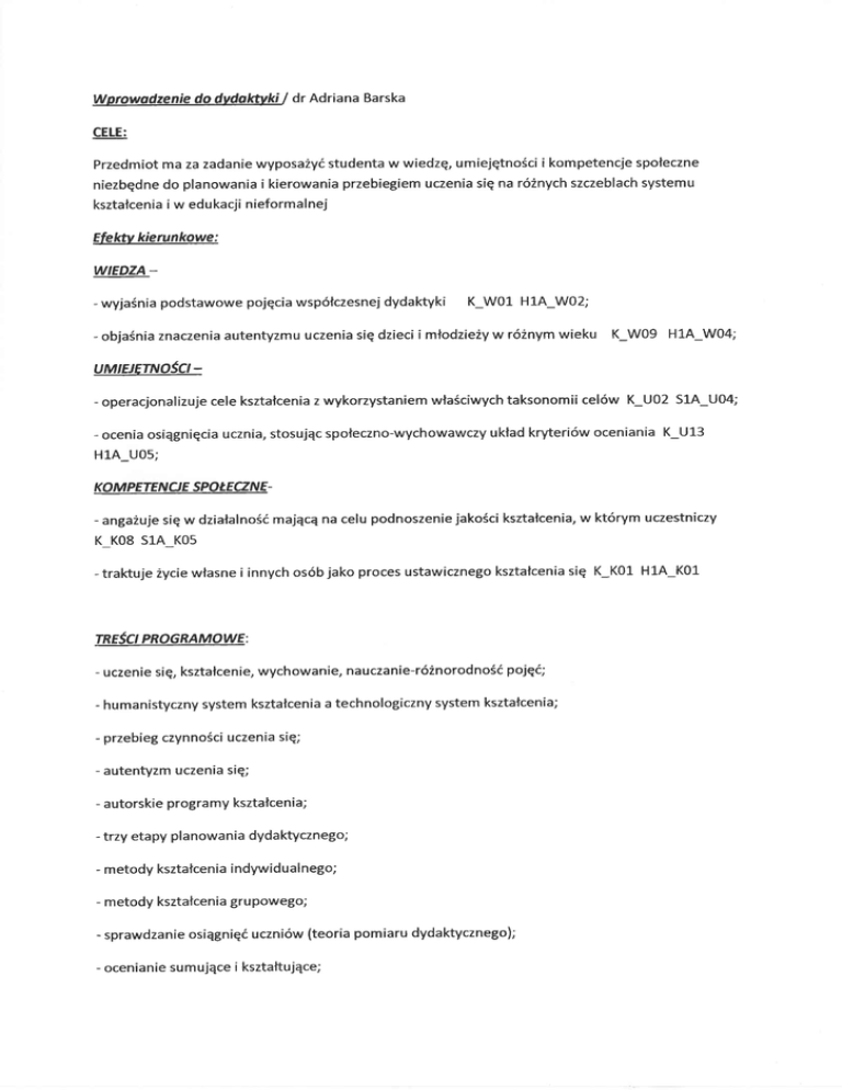 Wprowodzenie do dvdolctyki I dr Adriana Barska CELE: Przedmiot ma za zadanie wyposażyć studenta w wiedzę, umiejętności i kompetencje społeczne niezbędne do planowania i kierowania przebiegiem uczenia się na rÓżnych szczeblach systemu kształcenia i w edukacji nieformalnej Efektv kierunkowe: WIEDZA _ dydaktyki K_W01 H1A_W02; - wyjaśnia podstawowe pojęcia wspÓtczesnej - objaśnlaznaczenia autentyzmu uczenia się dzieci i młodzieŻy w rÓżnym UMIHETNoŚct wieku K-W09 H1A_W04; - - operacjona|izuje ce|e kształcenia z wykorzystaniem właściwychtaksonomii ce|Ów K_U02 S1A_U04; - ocenia osiqgnięcia ucznia, stosujqc społeczno-wychoWaWcZy układ kryteriÓw ocenianla K_U13 H 1A-U05; Ko M PETE N cJ E sPoł.Ecz,N E - angażuje się w K - KO8 S].A KOs traktuje Życle własne i innych osÓb jako proces ustawicznego kształcenia się K_K01 H1A_K01 TREŚOI - działalnośćmajqcq na celu podnoszenie jakościkształcenia, w ktÓrym uczestniczy u PRaGRAMoWE: czenie si ę, kształce n ie, wych owan ie, na ucza nle-rÓżn orod nośćpojęć; - humanistyczny system kształcenia a techno|ogiczny system kszta|cenia; - przebieg czynności uczenia się; - autentyzm uczenia się; - autorskie programy kształcenia; - trzy etapy planowania dydaktycznego; - metody ksztatcenia indywidualnego; - metody ksztatcenia grupowego; - sprawdzanie osiqgnięć uczniÓw (teoria pomiaru dydaktycznego); - ocenianie sumujqce i ksztattujqce; - ucze ocenia swoje osiqgnięcia 9teczka prac ucznia, lęk egzaminaryjny); - podnoszenie jakościszkoły (podstaworł4y błqd atrybucji osiągnięć uczniÓw). B IB LIO6 RAF IA O B OW IAJZKOW A: B. Niemierko, Kształcenie szkolne. Podręcznik skutecznej dydaktyki, Warszawa 2oo7 BI BLIaG RAF IA U ZU PEł,N IAIAG: w. okori, Wprowadzenie do dydokĘki ogÓIne1, Warszawa 1.987 PEDAGOGIT(A . dr Adriono Barcka. CELE: Przedmiot ma za zodanie wyposażyć studenta w wiedzę, umiejętnościi kompetencje społeczne niezbędne do planowania i reolizacji procesu nauczanla. EFEKTY KIERUNKOWE: WIEDA: - wyjaśnia podstawowe pojęcia K_W1 H1A_W04 - wykazuje się e|ementarnq wiedzqna temat wybranych teorii pedagogicznych K-W12 H1A_W03 IJMIHETNoŚct: - dokonuje obserwacji i interpretacji zjawisk społecznych: anaIizuje ich powiqzania z rÓżnymi obszarami działa!nościpedagogicznej K_U01. S1A. U01 wypowiada się w sposÓb precyzyjny i spÓjny na tematy dotyczqce wybranych zagadnieri pedagogicznych; z wykorzystaniem rożnych ujęć teoretycznych, korzystajqc zarÓwno z dorobku pedagogiki, jak i innych dyscyplin K-U06 H1A-U01 - Ko M PETE N cI E sP o ŁE Cf N E : - umiejętnie prezentuje własne pomysty, wqtpliwości i sugestie, popierajqc je argumentacjq w kontekściewybranych perspektyw teoretycznych, pogIqdÓw rÓżnych autorÓw K_U08 H1A_U06 TREŚcl PR)GRAMoWE: - status teoretyczny pedagogiki; -metodologia bada pedagogicznych; - głÓwne nurty pedagogiczne; - czotowi przedstawiciele pedagogiki; - kategorie pojęciowe wspÓłczesnej teorii wychowania: konteksty-ku|turowy, społeczny i rozwojowy; - szkoła jako środowisko edukacyjne _ rys historyczny; - modele szkoty wspÓłczesnej; - program nauczania; - ocenianie; - uczniowie (rodzaje); - sylwetka nauczyciela - rys historyczny; - wspotczesny nauczyciel - wybrane teorie; - tożsamośćzawodowa nauczyciela, wypalenie zawodowe; - relacyjny charakter wychowania; - alternatywne sposoby myslenia o wychowaniu; - wychowanie w obliczu globalizacji; - wychowanie w perspektywie wieloku|turowości i idei wspÓlnotowości; - pseudowychowanie; - wychowanie błędne i nieskuteczne B I B LI O G RAF I A O B OW - g. Ś|lwerski, Z. - g. IAZKOWA Kwieci ski, Pedagogika, t. l, ||, Warszawa 2003 Śiwerski, WspÓłczesne teorle i nurty wychowania, KrakÓw 200]- - H. Kwiatkowska, Tożsamośćnauczycieli, Gda sk 2oo4 - E. Kubiak-Szymborska, Podstawowe problemy teoriiwychowania. Kontekst wspÓłczesnych przemian, Bydgosz cz }OOG Bl BLIo G RAF IA UzU P EŁN l AlAcA - H. Sęk, Wypa!enie zawodowe. Przyczyny, mechanizmy, zapobieganie, Warszawa 2000 DYDAKTYKA PRzEDMloToWA, prof. Małgorzata Skorupa CELE: Merytoryczne przygotowanie stuchaczy Studium do prowadzenia samodzielnych zajęc dydaktycznych z uczniami szkot muzycznych I i Il stopnia, jak rÓwnież szkÓł ogÓ|noksztatcqcych i innych p|acÓwek zwiqzanych z edukacjq muzycznq. EFEKTY KIERUNKOWE: WIEDZA: Wiedza na temat struktury, podstaw prawnych i zasad funkcjonowania placÓwek edukacyjnych o profilu muzycznym w Polsce. Znajomośćpodstawowych zasad funkcjonowanla poIskiego szkoInictwa muzycznego w obliczu jego reformy. Wiedza dotyczqca stopniowania zagadnie technicznych i rozbudzania muzykalności w szkole muzycznej I i ll stopnia. Wiedza dotyczqca zasad oceniania postępÓw uczniÓw. UMtEJETNoŚc|: Umiejętnośćuksztattowania i zadbania o staty rozwÓj aparatu gry na instrumencie, warsztatu woka neg o bqdź dyrygenckiego. I Umiejętnośćrozwijania techniki w wyżej wymienionych obszarach. Umiejętnośćprzekazania podstaw wiedzy teoretycznej w zakresie przedmiotÓw objętych podstawq programowq d|a szkolnictwa muzycznego w szkołach I i ll stopnia. Umiejętnośćwtaściwego,stosownego do wieku i poziomu zaawansowania doboru materiału dydaktycznego - repertuaru instrumentaInego, wokalnego bqdź dyrygenckiego, jak rÓwnież |iteratury przedmiotowej i opracowa teoretycznych. KoM PETENcJ E SPoŁECZN E: Nawiqzywanie re|acji typu mistrz-ucze w trakcie zajęć indywidualnych igrupowych. Rozbudzanie u uczniÓw tendencji do żywego i aktywnego uczestniczenia w życiu środowiska muzycznego - W charakterze twÓrcÓw, interpretatorÓw, animatorÓw i melomanÓw.