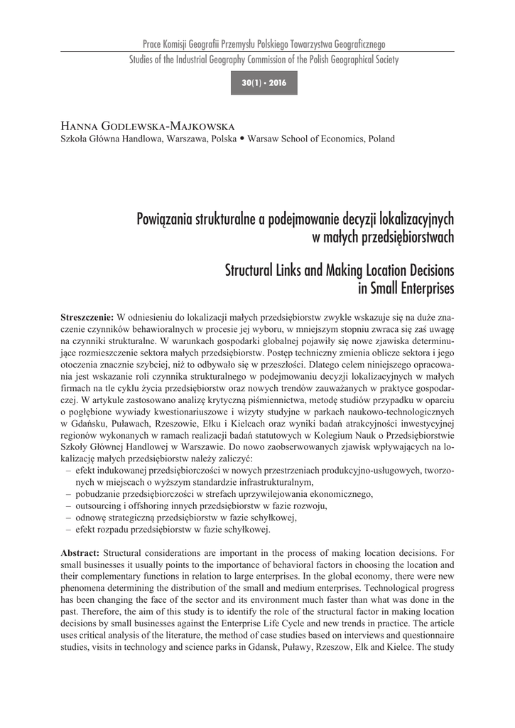 Prace Komisji Geografii Przemysłu Polskiego Towarzystwa Geograficznego Studies of the Industrial Geography Commission of the Polish Geographical Society 30 (1) · 2016 Hanna Godlewska-Majkowska Szkoła Główna Handlowa, Warszawa, Polska · Warsaw School of Economics, Poland Powiązania strukturalne a podejmowanie decyzji lokalizacyjnych w małych przedsiębiorstwach … Structural Links and Making Location Decisions in Small Enterprises Streszczenie: W odniesieniu do lokalizacji małych przedsiębiorstw zwykle wskazuje się na duże znaczenie czynników behawioralnych w procesie jej wyboru, w mniejszym stopniu zwraca się zaś uwagę na czynniki strukturalne. W warunkach gospodarki globalnej pojawiły się nowe zjawiska determinujące rozmieszczenie sektora małych przedsiębiorstw. Postęp techniczny zmienia oblicze sektora i jego otoczenia znacznie szybciej, niż to odbywało się w przeszłości. Dlatego celem niniejszego opracowania jest wskazanie roli czynnika strukturalnego w podejmowaniu decyzji lokalizacyjnych w małych firmach na tle cyklu życia przedsiębiorstw oraz nowych trendów zauważanych w praktyce gospodarczej. W artykule zastosowano analizę krytyczną piśmiennictwa, metodę studiów przypadku w oparciu o pogłębione wywiady kwestionariuszowe i wizyty studyjne w parkach naukowo-technologicznych w Gdańsku, Puławach, Rzeszowie, Ełku i Kielcach oraz wyniki badań atrakcyjności inwestycyjnej regionów wykonanych w ramach realizacji badań statutowych w Kolegium Nauk o Przedsiębiorstwie Szkoły Głównej Handlowej w Warszawie. Do nowo zaobserwowanych zjawisk wpływających na lokalizację małych przedsiębiorstw należy zaliczyć: –– efekt indukowanej przedsiębiorczości w nowych przestrzeniach produkcyjno-usługowych, tworzonych w miejscach o wyższym standardzie infrastrukturalnym, –– pobudzanie przedsiębiorczości w strefach uprzywilejowania ekonomicznego, –– outsourcing i offshoring innych przedsiębiorstw w fazie rozwoju, –– odnowę strategiczną przedsiębiorstw w fazie schyłkowej, –– efekt rozpadu przedsiębiorstw w fazie schyłkowej. Abstract: Structural considerations are important in the process of making location decisions. For small businesses it usually points to the importance of behavioral factors in choosing the location and their complementary functions in relation to large enterprises. In the global economy, there were new phenomena determining the distribution of the small and medium enterprises. Technological progress has been changing the face of the sector and its environment much faster than what was done in the past. Therefore, the aim of this study is to identify the role of the structural factor in making location decisions by small businesses against the Enterprise Life Cycle and new trends in practice. The article uses critical analysis of the literature, the method of case studies based on interviews and questionnaire studies, visits in technology and science parks in Gdansk, Puławy, Rzeszow, Elk and Kielce. The study 48 Hanna Godlewska-Majkowska is also based on the results of the investment attractiveness of regions carried out in the framework of the research provided in 2013-2015 by Warsaw School of Economics. The newly observed phenomena affecting the locations of small businesses include: –– the effect of induced business in new areas of production and service, created in a higher standard infrastructure, –– development of entrepreneurship in areas of economic privilege, –– outsourcing and offshoring of other enterprises in the development phase, –– strategic renewal of enterprises at the end stage, –– the effect of decay enterprises at the end stage. Słowa kluczowe: decyzja lokalizacyjna; lokalizacja; małe przedsiębiorstwo; struktura Keywords: location; location decision; small enterprise; structure Otrzymano: 31 grudnia 2015 Received: 31 December 2015 Zaakceptowano: 25 marca 2016 Accepted: 25 March 2016 Sugerowana cytacja / Suggested citation: Godlewska-Majkowska, H. (2016). Powiązania strukturalne a podejmowanie decyzji lokalizacyjnych w małych przedsiębiorstwach. Prace Komisji Geografii Przemysłu Polskiego Towarzystwa Geograficznego, 30(1), 47–61. Wstęp Małe przedsiębiorstwa są ważnymi interesariuszami stabilizującymi rynki lokalne i regionalne. Dlatego ich decyzje lokalizacyjne mają duży wpływ na bezpieczeństwo ekonomiczne nie tylko ich partnerów strategicznych (biznesowych), ale i społeczności regionalnych i lokalnych. To małe firmy są predestynowane do uzyskiwania korzyści z różnorodności. Lepiej reagują na zmiany na rynku oraz szybciej wprowadzają innowacje. Jest to szczególnie widoczne w sektorach wysokich technologii. Stanowią zatem ważny element lokalnych i regionalnych struktur przestrzennych. Na ich decyzje lokalizacyjne powinny więc w dużym stopniu wpływać ogólne warunki rozwoju przedsiębiorczości w danym regionie lub rejonie, a także zmiany strukturalne średnich i dużych przedsiębiorstw. W literaturze zwraca się uwagę na duże znaczenie czynników subiektywnych w wyborze lokalizacji czy wręcz brak prowadzenia analizy lokalizacyjnej przez małego przedsiębiorcę lub osobę rozpatrującą założenie firmy, niezależnie od wyboru formy organizacyjno-prawnej (Pred, 1967; Pred, 1969; Schmenner, 1982; Maier, Tődtling, 2006). Istotne znaczenie ma subiektywne ocenianie walorów lokalizacyjnych miejsca znanego z autopsji. Można je wytłumaczyć heurystykami dostępności, reprezentatywności i zakotwiczenia (Mechło, 2014). Heurystyka dostępności wskazuje na fakt, że ludzie są skłonni do oceny konkretnej informacji na podstawie pierwszego skojarzenia, co jest wywołane dostępnością tej informacji w ich pamięci. Reprezentatywność oznacza, że jeżeli dany obiekt ma cechy podobne do tych, które uważane są przez daną osobę za reprezentatywne dla niego, wówczas należy do danej grupy obiektów. Zakotwiczenie polega z