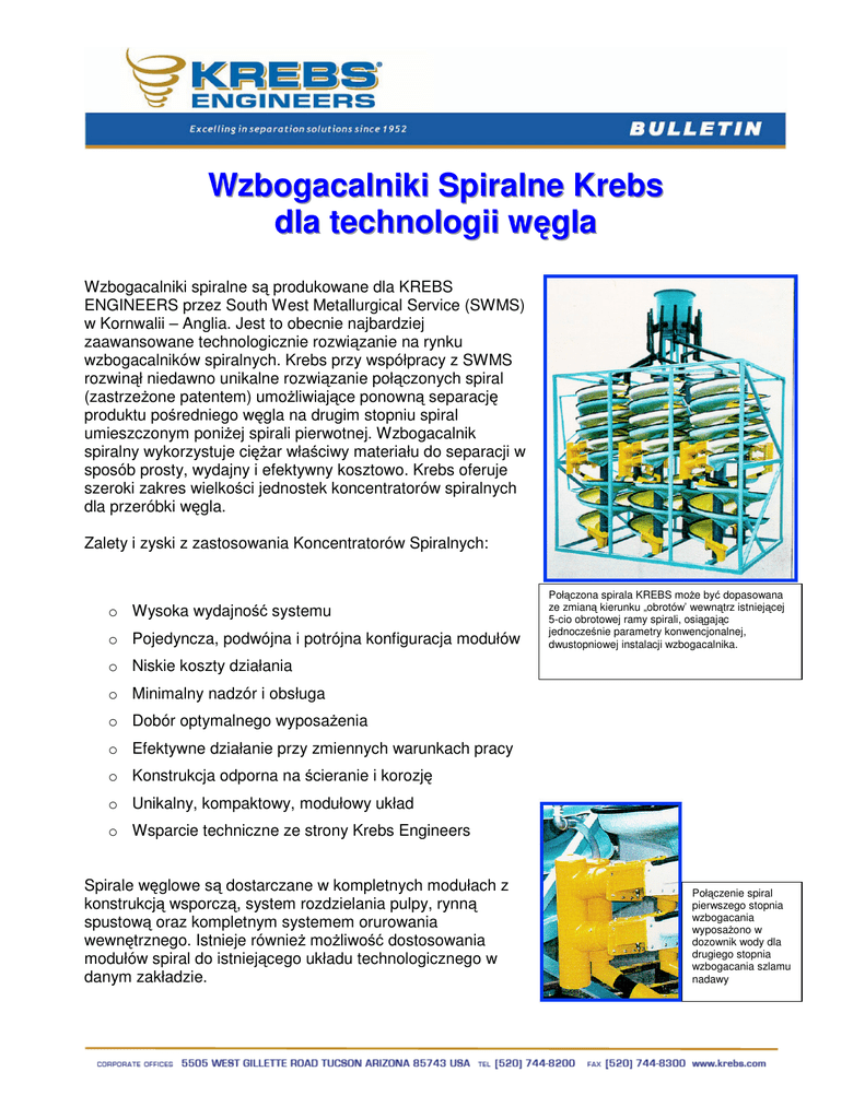 Wzbogacalniki Spiralne Krebs dla technologii węgla Wzbogacalniki spiralne są produkowane dla KREBS ENGINEERS przez South West Metallurgical Service (SWMS) w Kornwalii – Anglia. Jest to obecnie najbardziej zaawansowane technologicznie rozwiązanie na rynku wzbogacalników spiralnych. Krebs przy współpracy z SWMS rozwinął niedawno unikalne rozwiązanie połączonych spiral (zastrzeżone patentem) umożliwiające ponowną separację produktu pośredniego węgla na drugim stopniu spiral umieszczonym poniżej spirali pierwotnej. Wzbogacalnik spiralny wykorzystuje ciężar właściwy materiału do separacji w sposób prosty, wydajny i efektywny kosztowo. Krebs oferuje szeroki zakres wielkości jednostek koncentratorów spiralnych dla przeróbki węgla. Zalety i zyski z zastosowania Koncentratorów Spiralnych: o Wysoka wydajność systemu o Pojedyncza, podwójna i potrójna konfiguracja modułów Połączona spirala KREBS może być dopasowana ze zmianą kierunku „obrotów’ wewnątrz istniejącej 5-cio obrotowej ramy spirali, osiągając jednocześnie parametry konwencjonalnej, dwustopniowej instalacji wzbogacalnika. o Niskie koszty działania o Minimalny nadzór i obsługa o Dobór optymalnego wyposażenia o Efektywne działanie przy zmiennych warunkach pracy o Konstrukcja odporna na ścieranie i korozję o Unikalny, kompaktowy, modułowy układ o Wsparcie techniczne ze strony Krebs Engineers Spirale węglowe są dostarczane w kompletnych modułach z konstrukcją wsporczą, system rozdzielania pulpy, rynną spustową oraz kompletnym systemem orurowania wewnętrznego. Istnieje również możliwość dostosowania modułów spiral do istniejącego układu technologicznego w danym zakładzie. Połączenie spiral pierwszego stopnia wzbogacania wyposażono w dozownik wody dla drugiego stopnia wzbogacania szlamu nadawy Krebs posiada Zestaw spiral dla technologii węgla służący do przeprowadzania testów. Prosimy o kontakt telefoniczny Ostatnia generacja koncentratorów spiralnych KREBS dla technologii węgla to spirale o obrocie 3.25 i jako jedyne na rynku modele spirali o pięciu i sześciu obrotach. Geometria spirali jest wynikiem szczegółowych badań uniwersyteckich i posiada potwierdzoną pięcio- letnią żywotność w zakładach przeróbczych na całym świecie. Koncentratory spiralne SWMS są zaprojektowane dla uzyskania węgla o niskiej zawartości popiołu przy wysokiej wydajności rozdziału ciał organicznych od strumienia popiołu. Wydajność spirali wynosi 3-5 ton/h przy gęstości nadawy 30-45% objętości wagowej. Optymalna wielkość ziaren nadawy to 1mm do 0,125 .mm Obsługa klientów W KREBS ENGINEERS jesteśmy dumni z serwisu i wsparcia jakiego udzielamy naszym klientom poprzez analizy techniczne, dostawy części zamiennych i jakość produktów. Z zaangażowaniem dostarczamy najwyższej jakości urządzenia, oferujemy profesjonalny serwis techniczny oraz doradzamy w sprawach eksploatacyjnych. Pracownicy Krebs Engineers są specjalistami do spraw procesów separacji i klasyfikacji wykorzystywanych w przemyśle. Kiedykolwiek będzie to potrzebne, Firma Krebs Engineers zaoferuje Państwu wyczerpujące wsparcie techniczne oraz profesjonalną obsługę serwisową. Szczegółowe informacje ... Prosimy o kontakt z grupą naszych specjalistów w celu uzyskania szczegółowych informacji. Zachęcamy również do odwiedzenia naszej strony internetowej. KREBS ENGINEERS EUROPE Obere Hauptstrasse 27/3/4/TOP 21 TEL: 43-2167-3345 7100 Neusiedl am See FAX: 43-2167-3337 www.krebs.com EMAIL: [email protected]