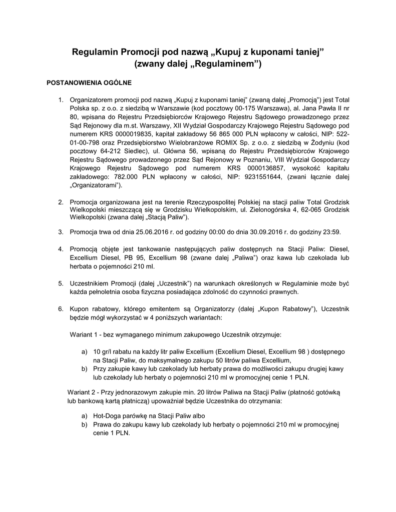 Regulamin Promocji pod nazwą „Kupuj z kuponami taniej” (zwany dalej „Regulaminem”) POSTANOWIENIA OGÓLNE 1. Organizatorem promocji pod nazwą „Kupuj z kuponami taniej” (zwaną dalej „Promocją”) jest Total Polska sp. z o.o. z siedzibą w Warszawie (kod pocztowy 00-175 Warszawa), al. Jana Pawła II nr 80, wpisana do Rejestru Przedsiębiorców Krajowego Rejestru Sądowego prowadzonego przez Sąd Rejonowy dla m.st. Warszawy, XII Wydział Gospodarczy Krajowego Rejestru Sądowego pod numerem KRS 0000019835, kapitał zakładowy 56 865 000 PLN wpłacony w całości, NIP: 52201-00-798 oraz Przedsiębiorstwo Wielobranżowe ROMIX Sp. z o.o. z siedzibą w Żodyniu (kod pocztowy 64-212 Siedlec), ul. Główna 56, wpisaną do Rejestru Przedsiębiorców Krajowego Rejestru Sądowego prowadzonego przez Sąd Rejonowy w Poznaniu, VIII Wydział Gospodarczy Krajowego Rejestru Sądowego pod numerem KRS 0000136857, wysokość kapitału zakładowego: 782.000 PLN wpłacony w całości, NIP: 9231551644, (zwani łącznie dalej „Organizatorami”). 2. Promocja organizowana jest na terenie Rzeczypospolitej Polskiej na stacji paliw Total Grodzisk Wielkopolski mieszczącą się w Grodzisku Wielkopolskim, ul. Zielonogórska 4, 62-065 Grodzisk Wielkopolski (zwana dalej „Stacją Paliw”). 3. Promocja trwa od dnia 25.06.2016 r. od godziny 00:00 do dnia 30.09.2016 r. do godziny 23:59. 4. Promocją objęte jest tankowanie następujących paliw dostępnych na Stacji Paliw: Diesel, Excellium Diesel, PB 95, Excellium 98 (zwane dalej „Paliwa”) oraz kawa lub czekolada lub herbata o pojemności 210 ml. 5. Uczestnikiem Promocji (dalej „Uczestnik”) na warunkach określonych w Regulaminie może być każda pełnoletnia osoba fizyczna posiadająca zdolność do czynności prawnych. 6. Kupon rabatowy, którego emitentem są Organizatorzy (dalej „Kupon Rabatowy”), Uczestnik będzie mógł wykorzystać w 4 poniższych wariantach: Wariant 1 - bez wymaganego minimum zakupowego Uczestnik otrzymuje: a) 10 gr/l rabatu na każdy litr paliw Excellium (Excellium Diesel, Excellium 98 ) dostępnego na Stacji Paliw, do maksymalnego zakupu 50 litrów paliwa Excellium, b) Przy zakupie kawy lub czekolady lub herbaty prawa do możliwości zakupu drugiej kawy lub czekolady lub herbaty o pojemności 210 ml w promocyjnej cenie 1 PLN. Wariant 2 - Przy jednorazowym zakupie min. 20 litrów Paliwa na Stacji Paliw (płatność gotówką lub bankową kartą płatniczą) upoważniał będzie Uczestnika do otrzymania: a) Hot-Doga parówkę na Stacji Paliw albo b) Prawa do zakupu kawy lub czekolady lub herbaty o pojemności 210 ml w promocyjnej cenie 1 PLN. Wariant 3 - Przy jednorazowym zakupie min. 40 litrów Paliwa na Stacji Paliw (płatność gotówką lub bankową kartą płatniczą) Uczestnik będzie mógł wykorzystać 2 Kupony Rabatowe upoważniające do otrzymania: a) Hot-Doga parówkę na Stacji Paliw i/lub, b) Prawa do zakupu Kawy lub czekolady lub herbaty o pojemności 210 ml za 1 PLN. Lub będzie mógł wykorzystać jeden Kupon Rabatowy uprawniający do otrzymania: a) Żetonu o wartości 10 PLN na myjnię znajdującą się przy Stacji Paliw i/lub, Wariant 4 - Przy jednorazowym zakupie min. 60 litrów Paliwa na Stacji Paliw (płatność gotówką lub bankową kartą płatniczą) Uczestnik będzie mógł wykorzystać 2 Kupony Rabatowe upoważniające do otrzymania: a) Żetonu o wartości 10 PLN na myjnię znajdującą się przy Stacji Paliw oraz b) Hot-Doga parówkę na Stacji Paliw i/lub, c) Prawa do zakupu Kawy lub czekolady lub herbaty o pojemności 210 ml za 1 PLN. Wariant 5 - Przy jednorazowym zakupie min. 80 litrów Paliwa na Stacji Paliw (płatność gotówką lub bankową kartą płatniczą) Uczestnik będzie mógł wykorzystać 3 Kupony Rabatowe upoważniające do otrzymania: a) Hot-Doga parówkę na Stacji Paliw i/lub, b) Żetonu o wartości 10 PLN na myjnię znajdującą się przy Stacji Paliw i/lub, c) Prawa do zakupu Kawy lub czekolady lub herbaty o pojemności 210 ml za 1 PLN. 7. Kuponów bez wymaganego minimum zakupowego oraz kuponów z wymaganym minimum zakupowym 20 litrów Paliwa nie można łączyć. 8. Warunkiem skorzystania z Promocji na Stacji Paliw jest przekazanie sprzedawcy przez Uczestnika wydrukowanego Kuponu Rabatowego, przed dokonaniem płatności za Paliwo. 9. Każdorazowe tankowanie Paliwa w ilości min. 20 litrów upoważnia do skorzystania z jednego Kuponu Rabatowego z zastrzeżeniem wariantów 3, 4 i 5 opisanych w pkt 6. 10. Wzór Kuponu Rabatowego stanowi załącznik nr 1 do Regulaminu. 11. Honorowane są jedynie oryginalne Kupony Rabatowe umożliwiające odczytanie kodu rabatowego – kserokopie, reprodukcje oraz zniszczone Kupony Rabatowe nie uprawniają do skorzystania z Promocji. 12. Promocja nie może być łączona z innymi promocjami oferowanymi przez Organizatorów na Stacji Paliw. 13. Z Promocji nie będzie mógł skorzystać Uczestnik, w przypadku którego nie upłynęło 24 h od momentu ostatniego wykorzystania Kuponów Rabatowych. SPOSÓB ZGŁASZANIA I ROZPATRYWANIA REKLAMACJI 14. Reklamacje związane z przebiegiem Promocji należy zgłaszać na piśmie na adres: Total Polska sp. z o.o., al. Jana Pawła II nr 80, 00-175 Warszawa, z dopiskiem: „Kupuj z kuponami taniej” Reklamacja powinna zawierać dane pozwalające na zidentyfikowanie Uczestnika i udzielenie mu odpowiedzi na reklamację np.: imię i nazwisko Uczestnika Promocji, adres zamieszkania lub pobytu, adres poczty elektronicznej lub numer telefonu, miejsce i datę zdarzenia, którego dotyczy reklamacja, przyczynę reklamacji wraz z jej uzasadnieniem, treść żądania. O sposobie rozpatrzenia reklamacji Uczestnik Promocji zostanie poinformowany elektroniczną lub telefonicznie w terminie 14 dni od dnia jej złożenia. pisemnie, pocztą DANE OSOBOWE 15. Dane osobowe Uczestników Promocji, podane w związku z reklamacją, są przetwarzane przez Total Polska Sp. z o.o. w celach związanych z rozpatrywaniem reklamacji