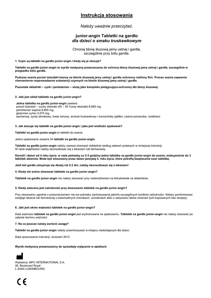 Instrukcja stosowania Należy uważnie przeczytać. junior-angin Tabletki na gardło dla dzieci o smaku truskawkowym Chronią błonę śluzową jamy ustnej i gardła, szczególnie przy bólu gardła. 1. Czym są tabletki na gardło junior-angin i kiedy się je stosuje? Tabletki na gardło junior-angin to wyrób medyczny przeznaczony do ochrony błony śluzowej jamy ustnej i gardła, szczególnie w przypadku bólu gardła. Podczas ssania porost islandzki tworzy na błonie śluzowej jamy ustnej i gardła ochronny roślinny film. Proces ssania zapewnia równomierne rozprowadzenie substancji czynnych na błonie śluzowej jamy ustnej i gardła. Pozostałe składniki – cynk i pantotenian – służą jako kompleks pielęgnująco-ochronny dla błony śluzowej. 2. Jaki jest skład tabletek na gardło junior-angin? Jedna tabletka na gardło junior-angin zawiera: porost islandzki – suchy ekstrakt (45 – 55 %owy ekstrakt) 6,665 mg, pantotenian wapnia 6,665 mg, glukonian cynku 5,574 mg, sacharozę, syrop skrobiowy, kwas winowy, aromat truskawkowy i koncentraty (jabłko, czarna porzeczka, rzodkiew) 3. Jak stosuje się tabletki na gardło junior-angin i jaka jest wielkość opakowań? Tabletki na gardło junior-angin to tabletki do ssania. Jedno opakowanie zawiera 24 tabletki na gardło junior-angin. Tabletki na gardło junior-angin należy zawsze stosować dokładnie według zaleceń podanych w niniejszej instrukcji. W razie wątpliwości należy skonsultować się z lekarzem lub farmaceutą. Dorośli i dzieci od 4 roku życia: w razie potrzeby co 2-3 godziny jedna tabletka na gardło junior-angin do ssania, maksymalnie do 3 tabletek dziennie. Może być stosowany przez dzieci powyżej 4. roku życia, które potrafią bezpiecznie ssać tabletkę. Jeśli ból gardła utrzymuje się dłużej niż 2-3 dni, należy skonsultować się z lekarzem! 4. Kiedy nie wolno stosować tabletek na gardło junior-angin? Tabletek na gardło junior-angin nie należy stosować przy nadwrażliwości na którykolwiek ze składników. 5. Kiedy zalecana jest ostrożność przy stosowaniu tabletek na gardło junior-angin? Przy stosowaniu zgodnie z przeznaczeniem nie ma potrzeby zachowywania jakichś szczególnych środków ostrożności. Należy poinformować swojego lekarza lub farmaceutę o ewentualnych chorobach, uczuleniach albo o zażywaniu leków (również tych kupowanych bez recepty). 6. Jaki jest okres ważności tabletek na gardło junior-angin? Data ważności tabletek na gardło junior-angin jest wydrukowana na opakowaniu. Tabletek na gardło junior-angin nie należy stosować po upływie terminu ważności 7. Na co jeszcze należy zwrócić uwagę? Tabletki na gardło junior-angin należy przechowywać w miejscu niedostępnym dla dzieci. Data opracowania instrukcji: wrzesień 2012 Wyrób medyczny przeznaczony do sprzedaży wyłącznie w aptekach Wytwórca: MPC INTERNATIONAL S.A. 26, Boulevard Royal L-2449 LUXEMBOURG