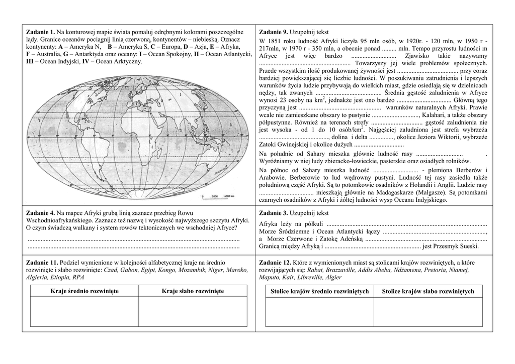 Zadanie 1. Na konturowej mapie świata pomaluj odrębnymi kolorami poszczególne lądy. Granice oceanów pociągnij linią czerwoną, kontynentów – niebieską. Oznacz kontynenty: A – Ameryka N, B – Ameryka S, C – Europa, D – Azja, E – Afryka, F – Australia, G – Antarktyda oraz oceany: I – Ocean Spokojny, II – Ocean Atlantycki, III – Ocean Indyjski, IV – Ocean Arktyczny. Zadanie 9. Uzupełnij tekst W 1851 roku ludność Afryki liczyła 95 mln osób, w 1920r. - 120 mln, w 1950 r 217mln, w 1970 r - 350 mln, a obecnie ponad ......... mln. Tempo przyrostu ludności m Afryce jest więc bardzo ............................ Zjawisko takie nazywamy ......................................................... Towarzyszy jej wiele problemów społecznych. Przede wszystkim ilość produkowanej żywności jest ...................................... przy coraz bardziej powiększającej się liczbie ludności. W poszukiwaniu zatrudnienia i lepszych warunków życia ludzie przybywają do wielkich miast, gdzie osiedlają się w dzielnicach nędzy, tak zwanych ......................................... Średnia gęstość zaludnienia w Afryce wynosi 23 osoby na km2, jednakże jest ono bardzo .................................. Główną tego przyczyną jest ................................................... warunków naturalnych Afryki. Prawie wcale nie zamieszkane obszary to pustynie ............................., Kalahari, a także obszary półpustynne. Również na terenach strefy ................................ gęstość zaludnienia nie jest wysoka - od 1 do 10 osób/km2. Najgęściej zaludniona jest strefa wybrzeża ..........................................., dolina i delta ..............., okolice Jeziora Wiktorii, wybrzeże Zatoki Gwinejskiej i okolice dużych ............................... Na południe od Sahary mieszka głównie ludność rasy ............................. . Wyróżniamy w niej ludy zbieracko-łowieckie, pasterskie oraz osiadłych rolników. Na północ od Sahary mieszka ludność ............................ - plemiona Berberów i Arabowie. Berberowie to lud wędrowny pustyni. Ludność tej rasy zasiedla także południową część Afryki. Są to potomkowie osadników z Holandii i Anglii. Ludzie rasy .................................. mieszkają głównie na Madagaskarze (Malgasze). Są potomkami czarnych osadników z Afryki i żółtej ludności wysp Oceanu Indyjskiego. Zadanie 4. Na mapce Afryki grubą linią zaznacz przebieg Rowu Wschodnioafrykańskiego. Zaznacz też nazwę i wysokość najwyższego szczytu Afryki. O czym świadczą wulkany i system rowów tektonicznych we wschodniej Afryce? Zadanie 3. Uzupełnij tekst .................................................................................................................................... .................................................................................................................................... Afryka leży na półkuli .................................................................................................... Morze Śródziemne i Ocean Atlantycki łączy ................................................................, a Morze Czerwone i Zatokę Adeńską ............................................................................ Granicą między Afryką i ............................................................ jest Przesmyk Sueski. Zadanie 11. Podziel wymienione w kolejności alfabetycznej kraje na średnio rozwinięte i słabo rozwinięte: Czad, Gabon, Egipt, Kongo, Mozambik, Niger, Maroko, Algieria, Etiopia, RPA Zadanie 12. Które z wymienionych miast są stolicami krajów rozwiniętych, a które rozwijających się: Rabat, Brazzaville, Addis Abeba, Ndżamena, Pretoria, Niamej, Maputo, Kair, Libreville, Algier Kraje średnio rozwinięte Kraje słabo rozwinięte Stolice krajów średnio rozwiniętych Stolice krajów słabo rozwiniętych Zadanie 2. Na mapie Afryki wpisz nazwy oceanów oraz ważniejszych mórz, półwyspów i wysp. Zaznacz najdalej wysunięte na północ, południe, wschód i zachód punkty Afryki. Pokoloruj morza i oceany kolorem niebieskim. Zadanie 6. Podpisz zamieszczone na mapie główne rzeki i jeziora Zadanie 18. Uzupełnij tabelkę Zadanie 16. Wpisz nazwy poniższych pasm górskich we właściwym miejscu tabelki: Alpy, Sudety, Góry Skandynawskie, Ural, Karpaty, Harz, Wogezy, Pireneje, Góry Dynarskie, Apeniny, Góry Pennińskie, Góry Kantabryjskie, Góry Betyckie, Bałkany, Rodopy, Góry Grampian, Góry Iberyjskie, Rudawy Klimat Strefa krajobrazowa Gleby Góry powstałe w czasie fałdowania kaledońskiego i hercyńskiego alpejskiego Umiarkowany chłodny Brunatne Stepy Śródziemnomorski Zadanie 5. Uzupełnij tabelkę kotliny wyżyny góry Zadanie 8. Uzupełnij tabelę wpisując definicje do podanych niżej pojęć Przyrost naturalny Wskaźnik przyrostu naturalnego Wyż demograficzny Eksplozja demograficzna Wskaźnik urodzeń Wskaźnik zgonów Gęstość zaludnienia Imigracja Emigracja Zadanie 7. Uzupełnij zdania lub skreśl niepotrzebne wyrazy Cechą ukształtowania powierzchni Afryki jest przewaga (wyżyn/gór) oraz występowanie licznych i rozległych (depresji/kotlin), otoczonych ................................ ....................... Pod względem geologicznym Afrykę budują ......................................... prekambryjskie. Najwyższym szczytem Afryki jest .................................................... o wysokości ........................m npm. Wschodnie wybrzeża południowej Afryki mają (mało/dużo) opadów, co związane jest z obecnością (ciepłego/zimnego) prądu (Mozambickiego/Benguelskiego). Wybrzeża zachodnie Afryki oblewają dwa (ciepłe/zimne) prądy morskie: ........................................................................... Powodują one bardzo (duże/małe) opady. Przeważająca część rzek stałych Afryki znajduje się w strefie klimatów ....................................