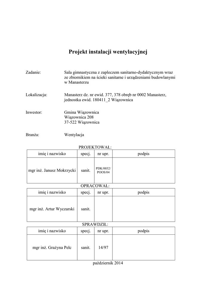 Projekt instalacji wentylacyjnej Zadanie: Sala gimnastyczna z zapleczem sanitarno-dydaktycznym wraz ze zbiornikiem na ścieki sanitarne i urządzeniami budowlanymi w Manasterzu Lokalizacja: Manasterz dz. nr ewid. 377, 378 obręb nr 0002 Manasterz, jednostka ewid. 180411_2 Wiązownica Inwestor: Gmina Wiązownica Wiązownica 208 37-522 Wiązownica Branża: Wentylacja imię i nazwisko mgr inż. Janusz Mokrzycki imię i nazwisko mgr inż. Artur Wyczarski imię i nazwisko mgr inż. Grażyna Pelc PROJEKTOWAŁ: specj. nr upr. sanit. podpis PDK/0032/ POOS/04 OPRACOWAŁ: specj. nr upr. podpis sanit. SPRAWDZIŁ: specj. nr upr. sanit. 14/97 październik 2014 podpis 2 SPIS TREŚCI OPIS TECHNICZNY................................................................................................................ 3 1. Podstawa opracowania ....................................................................................................... 3 2. Zakres opracowania............................................................................................................ 3 3. Dane budynku .................................................................................................................... 3 4. Rozwiązania projektowe .................................................................................................... 3 4.1. Wentylacja grawitacyjna ............................................................................................. 3 4.2. Wentylacja hybrydowa................................................................................................ 4 4.3. Wentylacja mechaniczna............................................................................................. 5 4.3.1. Wentylacja sali gimnastycznej ......................................................................... 5 4.3.2. Wentylacja pomieszczeń WC........................................................................... 6 4.3.3. Wentylacja podłogi .......................................................................................... 6 5. Wykonanie robót i warunki BHP ....................................................................................... 8 CZĘŚĆ GRAFICZNA 1. Instalacja wentylacji – rzut parteru 1:50 2. Instalacja wentylacji - rzut piętra 1:50 3. Instalacja wentylacji - schemat wentylacji podłogi 3 OPIS TECHNICZNY 1. Podstawa opracowania - umowa z Inwestorem - projekt architektoniczny - obowiązujące normy i przepisy - inwentaryzacja - katalogi i programy komputerowe 2. Zakres opracowania Zakres opracowania obejmuje instalację wentylacji grawitacyjnej, mechanicznej i hybrydowej dla projektowanego budynku sali gimnastycznej z zapleczem sanitarnodydaktycznym w miejscowości Manasterz na działkach nr ewid.: 377 i 378. 3. Dane budynku Projektowany budynek będzie wykonany w technologii tradycyjnej. Konstrukcja mieszana, ściany murowane wzmocnione słupami żelbetowymi, dach konstrukcji drewnianej kryty płytami warstwowymi dachowymi. 4. Rozwiązania projektowe W zależności od potrzeb dla pomieszczeń budynku zaprojektowano wentylację grawitacyjną, hybrydową oraz mechaniczną. Obliczenie ilości powietrza wraz z przyjętym rozwiązaniem wentylacyjnym w poszczególnych pomieszczeniach - w załączeniu 4.1. Wentylacja grawitacyjna W pomieszczeniach zaprojektowano pustaki wentylacyjne wykonane z betonu lekkiego Leier. Przeznaczone są do budowy grawitacyjnych systemów wentylacyjnych, do wentylacji pomieszczeń w budynkach mieszkalnych, przemysłowych i użyteczności publicznej. Pustaki 4 charakteryzują się dużą wytrzymałością na ściskanie i stosunkowo niską wagą, co pozwala na stosowanie ich w budynkach wielokondygnacyjnych. W niniejszym opracowaniu przyjęto pustaki typ LK2, LK3, LK4 o wymiarach pojedynczego kanału 12x17cm. W pomieszczeniu sali lekcyjnej na przewodach wentylacyjnych należy zamontować nasady kominowe Turbowent Tulipan ø150 Darco. Obrotowa nasada kominowa jest urządzeniem dynamicznie wykorzystującym siłę wiatru do wspomagania ciągu kominowego. Niezależnie od kierunku, siły i rodzaju wiatru, turbina nasady obraca się zawsze w jedną i tę samą stronę. Montuje się ją na wylotach kominowych wentylacji grawitacyjnej. Konstrukcja nasady (mała średnica turbiny) umożliwia zabudowę nasady na szeregowych kominach wentylacyjnych. Dodatkowo zaprojektowano nawiew grawitacyjny poprzez system wentylacyjny Purmo AIR. Grzejniki systemu AIR projektuje się także w pomieszczeniach: - sala gimnastyczna (nr 17), - szatnia odzieży (nr 18), - szatnia chłopców (nr 104), - umywalnia chłopców (nr 105), - umywalnia dziewcząt (nr 108), - szatnia dziewcząt (nr 112). 4.2. Wentylacja hybrydowa W pomieszczeniach w których wentylacja grawitacyjna była niewystarczająca zaprojektowano obrotowe nasady kominowe Turbowent Tulipan Hybrydowy ø150 Darco. Są to urządzenia dynamicznie wykorzystujące siłę wiatru do wspomagania ciągu kominowego, dodatkowo wyposażone w elektronicznie komutowany silnik bezszczotkowy małej mocy do jego skutecznej stabilizacji. Montuje się je na wylotach kominów wentylacyjnych o działaniu grawitacyjnym. Niezależnie od kierunku, siły i rodzaju wiatru, turbina nasady obraca się zawsze w jedną i tę samą stronę wytwarzając podciśnienie w króćcu dolotowym nasady, co w efekcie powoduje wzrost natężenia przepływu powietrza w przewodach. Jeśli wiejący wiatr nie jest na tyle silny by uzyskać prędkość obrotową ustawioną na sterowniku, silnik elektryczny dopędza nasadę do zadanej prędkości, jeśli jest zbyt mocny, silnik ogranicza prędkość obrotową. W sytuacji, gdy wiejący wiatr jest wystarczający dla 5 zapewnienia właściwej prędkości obrotowej Turbowent Hybrydowy działa jak zwykła nasada wiatrowa, a pobór energii elektrycznej jest minimalny. Dane techniczne: - napięcie zasilana regulatora obrotów [V] 24 - układ obrotowy: łożyska toczne - maksymalny pobór prądu [A] 0,3 - średni pobór prądu 