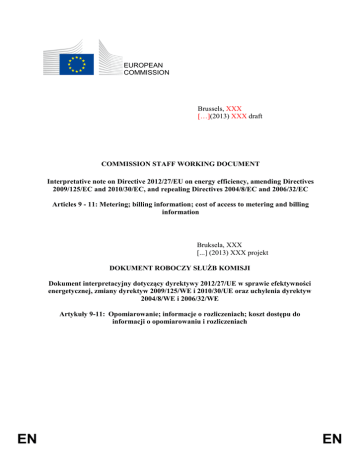 EUROPEAN COMMISSION Brussels, XXX […](2013) XXX draft COMMISSION STAFF WORKING DOCUMENT Interpretative note on Directive 2012/27/EU on energy efficiency, amending Directives 2009/125/EC and 2010/30/EC, and repealing Directives 2004/8/EC and 2006/32/EC Articles 9 - 11: Metering; billing information; cost of access to metering and billing information Bruksela, XXX [...] (2013) XXX projekt DOKUMENT ROBOCZY SŁUŻB KOMISJI Dokument interpretacyjny dotyczący dyrektywy 2012/27/UE w sprawie efektywności energetycznej, zmiany dyrektyw 2009/125/WE i 2010/30/UE oraz uchylenia dyrektyw 2004/8/WE i 2006/32/WE Artykuły 9-11: Opomiarowanie; informacje o rozliczeniach; koszt dostępu do informacji o opomiarowaniu i rozliczeniach EN EN SPIS TREŚCI A. WPROWADZENIE ................................................................................................................................. 2 B. KONTEKST PRAWNY I REGULACYJNY ....................................................................................................... 5 C. ZAKRES ZOBOWIĄZANIA ....................................................................................................................... 6 D. OBOWIĄZEK ZAPEWNIENIA LICZNIKÓW I PRZEKAZYWANIA DANYCH POMIAROWYCH ...................................... 6 E. ZOBOWIĄZANIA DO ZAPEWNIENIA PRZEKAZYWANIA INFORMACJI O ROZLICZENIACH .................................... 11 F. OBOWIĄZEK ZAPEWNIENIA BEZPŁATNEGO PRZEKAZYWANIA INFORMACJI DOTYCZĄCYCH OPOMIAROWANIA I ROZLICZEŃ ................................................................................................................................................ 15 G. OBOWIĄZEK EGZEKWOWANIA WYKONANIA ARTYKUŁÓW 9, 10 I 11 ......................................................... 16 1 ARTYKUŁY 9-11: OPOMIAROWANIE; INFORMACJE O ROZLICZENIACH; KOSZT DOSTĘPU DO INFORMACJI O OPOMIAROWANIU I ROZLICZENIACH A. WPROWADZENIE 1. Artykuły 9, 10 i 11 oraz załącznik VII do dyrektywy 2012/27/EU w sprawie efektywności energetycznej1 (dalej zwana również „DEE” lub „Dyrektywą”) dotyczą opomiarowania i rozliczeń indywidualnego zużycia energii. . 2. W odniesieniu do opomiarowania zużycia energii Artykuł 9 zobowiązuje państwa członkowskie do przestrzegania następujących głównych zobowiązań: Zapewnienie, by – z wyjątkami wynikającymi z przyczyn technicznych lub finansowych – odbiorcy końcowi energii elektrycznej, gazu ziemnego, ciepła sieciowego, chłodu sieciowego oraz ciepłej wody użytkowej mieli możliwość nabycia po konkurencyjnych cenach indywidualnych liczników, które dokładnie oddają rzeczywiste zużycie energii przez odbiorcę końcowego i podają informacje o rzeczywistym czasie korzystania z energii. Państwa członkowskie są zobowiązane do zapewnienia możliwości nabycia liczników w każdym przypadku: - podłączania nowych liczników w nowych budynkach; lub przy wykonaniu ważniejszych renowacji budynków, zgodnie z dyrektywą 2010/31/EU2 (dalej zwaną „DCEB”). W przypadku, gdy państwa członkowskie wprowadzają inteligentne systemy pomiarowe i rozpowszechniają inteligentne liczniki gazu ziemnego i/lub energii elektrycznej zgodnie z dyrektywami 2009/72/WE3 i 2009/73/WE4: - - - Systemy pomiarowe muszą dawać odbiorcom końcowym informacje na temat rzeczywistego czasu użytkowania; Przy ustalaniu minimalnych parametrów funkcjonalnych liczników i obowiązków nakładanych na uczestników rynku należy w pełni wziąć pod uwagę cele efektywności energetycznej i korzyści dla odbiorców końcowych; Należy zapewnić bezpieczeństwo inteligentnych liczników i przekazywania danych, a także prywatność odbiorców końcowych zgodnie ze stosownymi przepisami unijnymi o ochronie danych i prywatności; W przypadku dostarczania energii elektrycznej i na wniosek odbiorcy końcowego operatorzy liczników muszą być zobowiązani do zapewnienia, aby licznik był w stanie dokonywać rozliczeń ilości energii elektrycznej wysyłanej do sieci z obiektów odbiorcy końcowego; 1 Dyrektywa Parlamentu Europejskiego i Rady 2012/27/UE z dnia 25 października 2012 r. w sprawie efektywności energetycznej, zmiany dyrektyw 2009/125/WE i 2010/30/UE oraz uchylenia dyrektyw 2004/8/WE i 2006/32/WE, Dz.U. L 315, 14.11.2012, str. 1 2 Dyrektywa Parlamentu Europejskiego i Rady 2010/31/UE z dnia 19 maja 2010 r. w sprawie charakterystyki energetycznej budynków (wersja przekształcona), Dz.U. L 153, 18.06.2010, str. 13. 3 Dyrektywa Parlamentu Europejskiego i Rady 2009/72/WE z dnia 13 lipca 2009 r. dotycząca wspólnych zasad rynku wewnętrznego energii elektrycznej i uchylająca dyrektywę 2003/54/WE, Dz.U. L 211, 14.08.2009, str. 5593 4 Dyrektywa Parlamentu Europejskiego i Rady 2009/73/WE z dnia 13 lipca 2009 r. dotycząca wspólnych zasad rynku wewnętrznego gazu ziemnego i uchylająca dyrektywę 2003/55/WE, Dz.U. L 211, 14.08.2009, str. 94-136 2 - - Na wniosek odbiorców końcowych należy udostępnić – im lub stronie trzeciej działającej w imieniu odbiorcy końcowego (np. przedsiębiorstwo oszczędzania energii (ESCO) lub koncentrator) – dane pomiarowe dotyczące wprowadzanej i zbywanej przez nich energii elektrycznej w łatwo zrozumiałym formacie, umożliwiającym porównywanie podobnych transakcji; W momencie montażu inteligentnych liczników obowiązkowe jest przekazywanie odbiorcom stosownych porad i informacji, w szczególności na temat pełnych możliwości liczników w odniesieniu do monitorowania zużycia energii. W odniesieniu do pomiaru zużycia ciepła, chłodu i ciepłej wody użytkowej: - - Budynki zasilane w energię cieplną i chłodniczą lub ciepłą wodę z sieci ciepłowniczej lub z centralnego źródła obsługującego większą liczbę budynków, muszą być wyposażone w licznik energii cieplnej lub ciepłej wody, zamontowany na wymienniku ciepła lub na granicy dostawy; W odniesieniu do odbiorców końcowych w budynkach wielomieszkaniowych lub wielofunkcyjnych z w