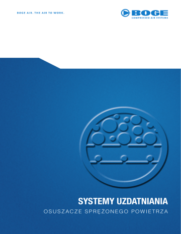 SYSTEMY UZDATNIANIA OSUSZACZE SPRĘŻONEGO POWIETRZA Ponad 100 000 użytkowników z branży przemysłu i rzemiosła ma wysokie oczekiwania, jeśli chodzi o zaopatrzenie w sprężone powietrze. Powietrze BOGE jest Państwa powietrzem gotowym do pracy. Powietrze BOGE jest powietrzem wysokiej jakości "made in Germany" - Jest ono wytwarzane przez wysokiej klasy i wydajne systemy sprężonego powietrza. Nasze urządzenia do uzdatniania sprężonego powietrza są dostosowane do współpracy z sprężarkami BOGE. Gwarantują one optymalne warunki do wytwarzania sprężonego powietrza o różnych klasach jakości. Powietrze BOGE spełnia najwyższe wymagania użytkowników. 2 TREŚĆ UZDATNIANIE SPRĘŻONEGO POWIETRZA 4 OSUSZACZE ZIĘBNICZE 6 OSUSZACZE MEMBRANOWE 12 OSUSZCZACZE ADSORPCYJNE 14 Osuszacze 3 Powietrze wysokiej jakości opłaca się: BOGE Uzdatnianie sprężonego powietrza. CZYSTO WYKONANA PRACA: OD POWIETRZA DO POWIETRZA WYSOKIEJ JAKOŚCI BOGE. Sprężone powietrze jest medium o szerokim spektrum zastosowań: od nieuzdatnionego powietrza nadmuchowego stosowanego na przykład w zakładach rzemieślniczych, aż po absolutnie suche, bezolejowe i sterylne sprężone powietrze w przemyśle farmaceutycznym, spożywczym i temu podobnym. sprężonego powietrza, tam coraz więcej użytkowników zdaje się na powietrze made by BOGE. Biorąc pod uwagę specyficzne wymagania, nasi eksperci od sprężonego powietrza tworzą z wielu komponentów indywidualnie dopasowany system uzdatniania, który jest zaprojektowany pod kątem konkretnej dziedziny zastosowań. Tam, gdzie zakresy zastosowania wymagają niezawodnego i właściwego uzdatnienia 1 m³ nieuzdatnionego powietrza zawiera nawet do 180 milionów drobin zanieczyszczeń, 50 do 80 procent pary wodnej i oleju w formie niespalonych węglowodorów. Podczas sprężania stężenie tych drobin rośnie: Przy ciśnieniu 10 bar wzrost jest jedenastokrotny, aż do dwóch miliardów drobin. Maksymalnie uzdatnione sprężone powietrze jest suche, bezpyłowe, bezolejowe i sterylne. CZYSTY BILANS: ZALETY UZDATNIANIA BOGE SPRĘŻONEGO POWIETRZA. STARANNE PLANOWANIE I DORADZTWO Błędnie zwymiarowane komponenty systemu uzdatniania mogą powodować wysokie koszty. Z tego powodu nasi pracownicy analizują najpierw Państwa zapotrzebowanie i dopasowują system dokładnie do wymagań. 4 OPTYMALNA PROPORCJA KOSZTÓW I ZALET UŻYTKOWYCH Każde uzdatnianie sprężonego powietrza pociąga za sobą koszty, które powinny pozostawać w optymalnej proporcji z zaletami użytkowymi. Z tego powodu, BOGE oferuje wielostronne i różnorodne komponenty, które umożliwiają dokładną wzajemną współpracę. JAKOŚĆ ”MADE IN GERMANY“ Wybór wysokiej klasy materiałów i zmniejszona ilość części zużywających się powodują, że systemy uzdatniania z BOGE są tak ekonomiczne i niezawodne. BOGE stanowi gwarancję najwyższych standardów w projektowaniu i produkcji gwarantowane! Odpowiedni system dla każdego: biorąc pod uwagę wymagania naszych klientów odnośnie jakości, BOGE zestawia ze sobą komponenty uzdatniające sprężone powietrze w optymalnych dla Państwa kombinacjach. Nasze wsparcie ze strony projektowej i planistycznej wyznacza ramy projektu dla rodzaju i technologii uzdatniania właściwego dla Państwa potrzeb: Nasi eksperci zadbają o najlepsze rozwiązania dostosowane dla Państwa potrzeb! ZANIECZYSZCZENIA I KLASY JAKOŚCI WEDŁUG ISO 8573-1:2010 KLASA Zanieczyszczenia stałe (maks. ilość drobin na m³) przy maksymalnej wielkości drobin w μm z 0.1 < d < = 0.5 0.5 < d < = 1.0 1.0 < d < = 5.0 według danych producenta ≤ 20 000 ≤ 400 ≤ 10 ≤ 400 000 ≤ 6 000 ≤ 100 bez danych ≤ 90 000 ≤ 1 000 bez danych bez danych ≤ 10 000 bez danych bez danych ≤ 100 000 0 1 2 3 4 5 Wilgotność Maks. zawartość (maks. temperatura rosy) oleju °C mg/m3 < = –70 °C < = –40 °C < = –20 °C < = +3 °C < = +7 °C < = 0.01 mg/m³ < = 0.1 mg/m³ < = 1 mg/m³ < = 5 mg/m³ — Warunki referencyjne 1 bar(a), 20 °C, 0 % wilgotność względna; ciśnieniowy punkt rosy przy ciśnieniu końcowym sprężarki 8 bar (a). OSUSZACZE SPRĘŻONEGO POWIETRZA BOGE Ciśnieniowy punkt rosy °C +10 +7 Osuszacze ziębnicze sprężonego powietrza BOGE dla standardowych ciśnieniowych punktów rosy +3 °C +3 Temperatura zamarzania Osuszacze ziębnicze sprężonego powietrza BOGE DS Osuszacze ziębnicze sprężonego powietrza BOGE DH 0 – 20 – 25 Osuszacze membranowe BOGE DM * Osuszacze membranowe BOGE / Osuszacze adsorpcyjne BOGE dla standardowych ciśnieniowych punktów rosy -20°C, -25°C, -40°C, -70°C – 40 – 70 * Osuszacze adsorpcyjne BOGE DAZ Zespół uzdatniania BOGE DACZ * * Osuszacze adsorpcyjne BOGE DAV Przepływ l/min83 110182250 m3/min0.08 0.110.180.25 3 m /h 5 7 10.8 15 1000 1 60 DS = Osuszacz ziębniczy sprężonego powietrza DM = Osuszacz membranowy DAZ = Osuszacz adsorpcyjny, regenerowany na zimno DAV = Osuszacz adsorpcyjny, regenerowany na gorąco z chłodzeniem próżniowym DACZ = Zespół uzdatniania składający się z osuszacza adsorpcyjnego DAZ, regenerowanego na zimno z adsorbentem z węgla aktywnego DH = Osuszacz ziębniczy sprężonego powietrza 2.6 154 6.7 400 14 850 30.4 45.8 1824 2750 93 124 146 5600 7400 8750 241.7 14 500 Osuszacze 5 Osuszacze ziębnicze sprężonego powietrza DS 2 do DS 95 Wydajność przepływu: 0,20 – 9,5 m³/min, 7 – 335 cfm Maks. ciśnienie pracy: do 16 bar, 235 psig Instrukcja posadowienia Temperatura pomieszczenia, względnie otoczenia dla standardowego doboru osuszacza nie powinna przekroczyć +50 °C oraz nie powinna spaść poniżej +5 °C. Wokół osuszacza ziębniczego sprężonego powietrza należy zapewnić wolną przestrzeń w celu zapewnienia dobrej cyrkulacji powietrza chłodzącego. W celu odprowadzenia kondensatu należy zainstalować odpowiednio zwymiarowany przewód odpływowy. Warunki doboru Wydajność przepływu jest do warunków zasysania przez sprężarkę (+20 °C i 1 bar): temper