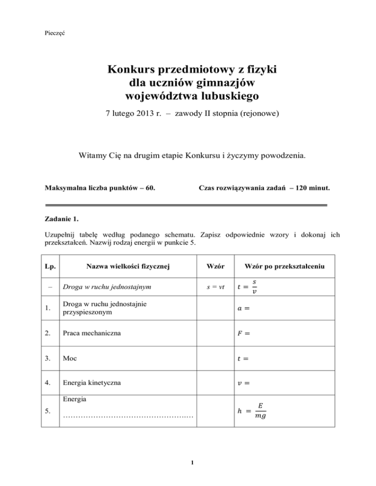 Pieczęć Konkurs przedmiotowy z fizyki dla uczniów gimnazjów województwa lubuskiego 7 lutego 2013 r. – zawody II stopnia (rejonowe) Witamy Cię na drugim etapie Konkursu i życzymy powodzenia. Maksymalna liczba punktów – 60. Czas rozwiązywania zadań – 120 minut. Zadanie 1. Uzupełnij tabelę według podanego schematu. Zapisz odpowiednie wzory i dokonaj ich przekształceń. Nazwij rodzaj energii w punkcie 5. Nazwa wielkości fizycznej Lp. – Wzór Droga w ruchu jednostajnym 1. Droga w ruchu jednostajnie przyspieszonym 2. Praca mechaniczna 3. Moc 4. Energia kinetyczna s = vt Energia 5. ………………………………………….… 1 Wzór po przekształceniu Zadanie 2. Felix Baumgartner to austriacki skoczek spadochronowy, który 14 października 2012 roku zasłynął rekordowym skokiem z wysokości 39 km nad powierzchnią Ziemi, gdzie rozciąga się stratosfera – jedna z górnych warstw atmosfery ziemskiej. Powietrze jest tam tak rozrzedzone, że zapewnia śmiałkowi lot bez oporów ruchu. Doczepiona do balonu kapsuła wyniosła skoczka w czasie na wysokość , skąd rozpoczął spadanie swobodne. Trwało ono , a maksymalna szybkość spadania w tym czasie wyniosła . a. Oblicz w jednostkach podstawowych układu SI średnią szybkość wznoszenia kapsuły. Wynik podaj z dokładnością do trzech cyfr znaczących. b. Przyjmując wartość przyspieszenia grawitacyjnego , oblicz z dokładnością do dwóch miejsc po przecinku: drogę przebytą przez skoczka w pierwszej sekundzie ruchu, drogę przebytą przez skoczka w drugiej sekundzie ruchu. 2 c. Jednym z zamiarów skoczka było przekroczenie szybkości dźwięku w powietrzu, która wynosi . Czy cel został zrealizowany? Uzasadnij odpowiedź. d. Średnia szybkość podróżna samolotem Boening 747 wynosi , gdzie mila to jednostka odległości równa . Czy, spadając, Felix Baumgartner przekroczył tę szybkość? Odpowiedź uzasadnij obliczeniami. e. Przypuśćmy, że byłoby to możliwe. Jaką wartość powinno mieć średnie przyspieszenie skoczka, aby w czasie 4 minut i 20 sekund osiągnął szybkość 1 km/s? 3 Zadanie 3. Stojący na linii startu samochód rusza do wyścigu, osiągając w ciągu kilku sekund maksymalną szybkość. Prostą startową wyznaczono na poziomym odcinku trasy. Analizując informacje dotyczące startu samochodu, zaznacz poprawne stwierdzenia. a. b. Wartość siły ciągu silnika jest Wypadkowa siła działająca na samochód ma wartość co wynika z c. równa wartości sił oporów ruchu. większa od wartości sił oporów ruchu. mniejsza od wartości sił oporów ruchu. równą zeru, większą od zera, mniejszą od zera, I zasady dynamiki Newtona. II zasady dynamiki Newtona. III zasady dynamiki Newtona. W kierunku pionowym na samochód działa tylko siła grawitacji zwrócona w dół. działają siła grawitacji i siła nacisku zwrócone w dół. działają siła grawitacji i siła sprężystości podłoża zwrócone przeciwnie. d. Skutkiem stałej co do wartości siły wypadkowej działającej na pojazd jest przyspieszenie, którego wartość e. nie zmienia się. maleje. wzrasta. Czterokrotny wzrost energii kinetycznej samochodu oznacza wzrost jego szybkości. 4 dwukrotny czterokrotny szesnastokrotny Zadanie 4. W pewnym akwenie wodnym poszukiwano niebezpiecznych wraków leżących na dnie morza na głębokości mniejszej niż , gdyż takie uznawano za niebezpieczne dla pływających w tym rejonie jednostek. Statek badawczy przeznaczony do poszukiwań wysłał pionowo za pomocą echosondy sygnał dźwiękowy, którego powrót zarejestrowano po czasie . Po analizie sygnału uznano, że może on wskazywać na niewielki zatopiony statek. Wartość prędkości dźwięku w wodzie określono na . a. Oblicz głębokość, na jakiej spoczywa wrak. Oceń, czy jest ona bezpieczna dla przepływających nad nim jednostek. b. Niedaleko wraku dno morza obniża się do głębokości 100 . Oblicz panujące tam ciśnienie całkowite. Ile razy jest ono większe od ciśnienia atmosferycznego, którego wartość na powierzchni akwenu wynosi ? Przyjmij, że gęstość wody wynosi , a przyspieszenie grawitacyjne ma wartość . 5 Zadanie 5. Bartek, dysponując dwiema jednakowymi grzałkami, stwierdził, że jedna – podłączona do źródła o napięciu – ma moc . a. Oblicz opór elektryczny grzałki podczas pracy. b. Bartek postanowił zwiększyć moc układu grzewczego, łącząc dwie grzałki szeregowo. Wykonaj obliczenia i odpowiedz, czy to był dobry pomysł. Jak zmieniła się moc układu? Wzrosła czy zmalała? Ile razy? c. Ile wyniósł czas potrzebny na doprowadzenie do wrzenia wody o masie i temperaturze , jeśli wiadomo, że użyto jednej grzałki, a 5% dostarczonej energii nie zostało wykorzystane ogrzanie wody? Ciepło właściwe wody wynosi . d. Na co została zużyta energia niewykorzystana do ogrzania wody? Podaj dwa przykłady. 6 Zadanie 6. Na tekturowy walec nawinięto zwojnicę składającą się z 1000 zwojów. Jej końce podłączono do źródła prądu o stałym napięciu. Zakreśl krzyżykiem właściwe informacje. a. Linie pola magnetycznego wytworzonego przez zwojnicę mają kształt bardzo podobny do linii pola magnetycznego wytworzonego przez magnes sztabkowy. Tak b. Nie Zwojnicę bez rdzenia przecięto na pół, a jedną z połówek podłączono ponownie do źródła prądu stałego. Natężenie prądu w zwojnicy wzrosło. Tak d. Nie Po wsunięciu do zwojnicy żelaznego rdzenia jej pole magnetyczne wzrosło. Tak c. Nie Materiały, z których wytwarza się magnesy sztabkowe, nadają się na rdzenie zwojnic używanych w elektromagnesach. Tak Nie Zadanie 7. Fala dźwiękowa wytworzona za pomocą kamertonu przeszła z powietrza do wody. Po przekroczeniu granicy ośrodków jej szybkość wzrosła. Zakreśl krzyżykiem właściwe informacje. a. b. c. e. Częstotliwość dźwięku pozostała niezmieniona. Tak Nie Tak Nie Tak Nie Tak Nie Długość fali dźwiękowej po przejściu do wod
