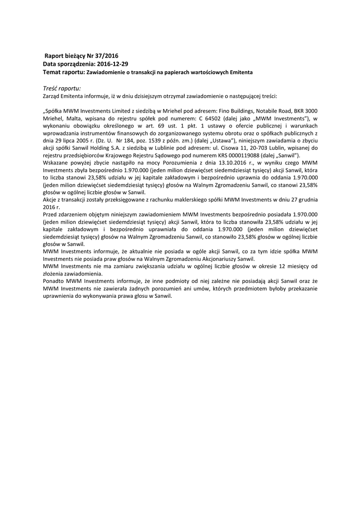 Raport bieżący Nr 37/2016 Data sporządzenia: 2016-12-29 Temat raportu: Zawiadomienie o transakcji na papierach wartościowych Emitenta Treść raportu: Zarząd Emitenta informuje, iż w dniu dzisiejszym otrzymał zawiadomienie o następującej treści: „Spółka MWM Investments Limited z siedzibą w Mriehel pod adresem: Fino Buildings, Notabile Road, BKR 3000 Mriehel, Malta, wpisana do rejestru spółek pod numerem: C 64502 (dalej jako „MWM Investments”), w wykonaniu obowiązku określonego w art. 69 ust. 1 pkt. 1 ustawy o ofercie publicznej i warunkach wprowadzania instrumentów finansowych do zorganizowanego systemu obrotu oraz o spółkach publicznych z dnia 29 lipca 2005 r. (Dz. U. Nr 184, poz. 1539 z późn. zm.) (dalej „Ustawa”), niniejszym zawiadamia o zbyciu akcji spółki Sanwil Holding S.A. z siedzibą w Lublinie pod adresem: ul. Cisowa 11, 20-703 Lublin, wpisanej do rejestru przedsiębiorców Krajowego Rejestru Sądowego pod numerem KRS 0000119088 (dalej „Sanwil”). Wskazane powyżej zbycie nastąpiło na mocy Porozumienia z dnia 13.10.2016 r., w wyniku czego MWM Investments zbyła bezpośrednio 1.970.000 (jeden milion dziewięćset siedemdziesiąt tysięcy) akcji Sanwil, która to liczba stanowi 23,58% udziału w jej kapitale zakładowym i bezpośrednio uprawnia do oddania 1.970.000 (jeden milion dziewięćset siedemdziesiąt tysięcy) głosów na Walnym Zgromadzeniu Sanwil, co stanowi 23,58% głosów w ogólnej liczbie głosów w Sanwil. Akcje z transakcji zostały przeksięgowane z rachunku maklerskiego spółki MWM Investments w dniu 27 grudnia 2016 r. Przed zdarzeniem objętym niniejszym zawiadomieniem MWM Investments bezpośrednio posiadała 1.970.000 (jeden milion dziewięćset siedemdziesiąt tysięcy) akcji Sanwil, która to liczba stanowiła 23,58% udziału w jej kapitale zakładowym i bezpośrednio uprawniała do oddania 1.970.000 (jeden milion dziewięćset siedemdziesiąt tysięcy) głosów na Walnym Zgromadzeniu Sanwil, co stanowiło 23,58% głosów w ogólnej liczbie głosów w Sanwil. MWM Investments informuje, że aktualnie nie posiada w ogóle akcji Sanwil, co za tym idzie spółka MWM Investments nie posiada praw głosów na Walnym Zgromadzeniu Akcjonariuszy Sanwil. MWM Investments nie ma zamiaru zwiększania udziału w ogólnej liczbie głosów w okresie 12 miesięcy od złożenia zawiadomienia. Ponadto MWM Investments informuje, że inne podmioty od niej zależne nie posiadają akcji Sanwil oraz że MWM Investments nie zawierała żadnych porozumień ani umów, których przedmiotem byłoby przekazanie uprawnienia do wykonywania prawa głosu w Sanwil.