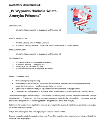 WARSZTATY MIEDZYSZKOLNE „IV Wyprawa dookoła świataAmeryka Północna” ORGANIZATOR: Szkoła Podstawowa nr 23 w Szczecinie, ul. Miernicza 10 WSPÓŁORGANIZATOR: Wydział Oświaty Urzędu Miasta Szczecin; Pracownia Edukacji Wodnej i Żeglarskiej Pałacu Młodzieży – PCE w Szczecinie; MIEJSCE KONKURSU: Szkoła Podstawowa nr 23 w Szczecinie, ul. Miernicza 10 CELE KONKURSU: Przybliżenie kultury Ameryki Północnej; Wymiana wiedzy i umiejętności; Integracja szczecińskich szkół; Wzbudzanie tolerancji międzykulturowej. ZASADY UCZESTNICTWA: Warsztaty są imprezą otwartą. Warunkiem uczestnictwa jest zgłoszenie we właściwym terminie udziału oraz przygotowanie prezentacji na wybrany i ustalony z organizatorem temat. Zgłoszenie do konkursu odbywa się przez złożenie wypełnionej karty zgłoszenia. Karty zgłoszeń muszą zawierać dokładny adres (z telefonem) placówki oraz dane opiekuna SKEM. Warsztaty składają się z dwóch części. I Prezentacji - uczestnicy mają 5 minut na zaprezentowanie swojego zagadnienia i II Praktycznej -10 min na przeprowadzenie zadania dla pozostałych. Uczniowie poznają prezentacje przygotowane i wykonują zadania przygotowane przez inne drużyny. Zadaniem dla widzów może być krótka zabawa, gra, krzyżówka, puzzle, łamigłówka, degustacja nawiązująca do przedstawionego tematu. W tym dniu obowiązuje strój z nawiązujący do strojów amerykańskich. Zespoły przygotowują jedno zagadnienie z życia Ameryki w uzgodnieniu z organizatorem oto przykłady (mile widziane inne propozycje): KATEGORIE WIEKOWE: Uczestnicy warsztatów: - dzieci /młodzież ze szkół podstawowych i specjalnych zrzeszone w SKEM; 4 osobowe zespoły MIEJSCE I TERMIN: Szkoła Podstawowa nr 23 w Szczecinie, ul. Miernicza 10, – 14 kwiecień 2015 r. godz. 12.30. Zgłoszenia będą przyjmowane do 20 marca 2014 pod adresem: [email protected] UWAGI KOŃCOWE: Informacja o harmonogramie działań będzie przesłana do szkół drogą elektroniczną z potwierdzeniem przeczytania wiadomości. Prosimy o zwrócenie uwagi na swoje rzeczy osobiste (w szczególności przedmioty wartościowe). Za rzeczy pozostawione bez nadzoru – organizator nie odpowiada. Drużyny otrzymują pamiątkowe dyplomy uczestnictwa oraz zabierają własnoręcznie wykonane pamiątki w toku warsztatów. Dostępne przybory i materiały: kredki, nożyczki, klej, gazety, papier, itp. (inne proszę uzgodnić). Zgodnie z art. 23 ust. 1 pkt. 1 ustawy z 29.08.1997 r. o ochronie danych osobowych (Dz. U. Nr 133, poz. 883 z późn. zm.) dane osobowe wykorzystywane będą jedynie do celów statutowych placówki. Zgłoszenie dzieci na warsztaty, jest jednoznaczne z wyrażeniem zgody na publikację zdjęć na stronie internetowej, w publikacjach i folderach placówki oraz Koordynatora Programu. Niniejsza zgoda dotyczy wyłącznie publikacji w celach niekomercyjnych. Przykłady: • FAKTY • Budowle • Sztuka SP • Historia flagi • Rdzenni; Indianie • Roślinność • Mapa • Stroje • Taniec • kuchnia • Przedmioty codziennego użytku - • Zwierzęta • Muzyka Sporządziła: Bożena Thomsen, SP23 SP 37 KARTA ZGŁOSZENIA (WYPEŁNIAC DRUKOWANYMI LITERAMI) Zgłaszam udział szkoły/ placówki………………………………… ……….. w imprezie edukacyjnej -„V Wyprawa dookoła świata – Ameryka Północna”, która odbędzie się w Szkole Podstawowej Nr 23 w dniu 14.04.2015 w auli szkoły o godzinie 12.30 Opiekun: …………………………………………………., Tel. ………………………………………….. TEMAT: …………………………………………………….. (do uzgodnienia z organizatorem) Imiona i nazwiska uczestników (4 osoby): 1. ………………………………………… 2. ………………………………………… 3. ………………………………………… 4. ………………………………………… Zgłoszenia do 30.03.15 na fax nr: 914600288 Lub e-mail: [email protected]