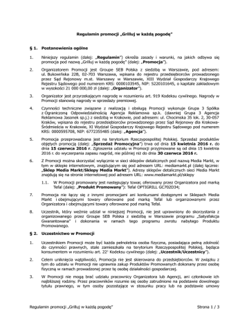 Regulamin promocji „Grilluj w każdą pogodę” § 1. Postanowienia ogólne 1. Niniejszy regulamin (dalej: „Regulamin”) określa zasady i warunki, na jakich odbywa się promocja pod nazwą „Grilluj w każdą pogodę” (dalej: „Promocja”). 2. Organizatorem Promocji jest Groupe SEB Polska z siedzibą w Warszawie, pod adresem: ul. Bukowińska 22B, 02-703 Warszawa, wpisana do rejestru przedsiębiorców prowadzonego przez Sąd Rejonowy m.st. Warszawy w Warszawie, XIII Wydział Gospodarczy Krajowego Rejestru Sądowego pod numerem KRS: 0000103545, NIP: 5220101645, o kapitale zakładowym w wysokości 21 000 000,00 zł (dalej: „Organizator”). 3. Organizator jest przyrzekającym nagrodę w rozumieniu art. 919 Kodeksu cywilnego. Nagrody w Promocji stanowią nagrody w sprzedaży premiowej. 4. Czynności techniczne związane z realizacją i obsługą Promocji wykonuje Grupa 3 Spółka z Ograniczoną Odpowiedzialnością Agencja Reklamowa sp.k. (dawniej Grupa 3 Agencja Reklamowa Jasonek sp.j.) z siedzibą w Krakowie, pod adresem: ul. Chocimska 35 lok. 2, 30-057 Kraków, wpisana do rejestru przedsiębiorców prowadzonego przez Sąd Rejonowy dla KrakowaŚródmieścia w Krakowie, XI Wydział Gospodarczy Krajowego Rejestru Sądowego pod numerem KRS: 0000595708, NIP: 6772355485 (dalej: „Agencja”). 5. Promocja przeprowadzana jest na terytorium Rzeczypospolitej Polskiej. Sprzedaż produktów objętych promocją (dalej: „Sprzedaż Promocyjna”) trwa od dnia 15 kwietnia 2016 r. do dnia 15 czerwca 2016 r. Zgłoszenia udziału w Promocji przyjmowane są od dnia 15 kwietnia 2016 r. do wyczerpania zapasu nagród, nie później niż do dnia 30 czerwca 2016 r. 6. Z Promocji można skorzystać wyłącznie w sieci sklepów detalicznych pod nazwą Media Markt, w tym w sklepie internetowym, znajdującym się pod adresem URL: mediamarkt.pl (dalej łącznie: „Sklep Media Markt/Sklepy Media Markt”). Adresy sklepów detalicznych sieci Media Markt znajdują się na stronie internetowej pod adresem URL: www.mediamarkt.pl/sklepy 1.1. W Promocji promowany jest następujący towar, oferowany przez Organizatora pod marką Tefal (dalej: „Produkt Promowany”): Tefal OPTIGRILL GC702D34; 7. Promocja nie łączy się z innymi promocjami ani konkursami dostępnymi w Sklepach Media Markt i obejmującymi towary oferowane pod marką Tefal lub organizowanymi przez Organizatora i obejmującymi towary oferowane pod marką Tefal. 8. Uczestnik, który weźmie udział w niniejszej Promocji, nie jest uprawniony do skorzystania z organizowanego przez Groupe SEB Polska z siedzibą w Warszawie programu „Satysfakcja Gwarantowana” i dokonania w ramach tego programu zwrotu nabytego Produktu Promowanego. § 2. Uczestnictwo w Promocji 1. Uczestnikiem Promocji może być każda pełnoletnia osoba fizyczna, posiadająca pełną zdolność do czynności prawnych, stale zamieszkała na terytorium Rzeczypospolitej Polskiej, będąca konsumentem w rozumieniu art. 22 1 Kodeksu cywilnego (dalej: „Uczestnik/Uczestnicy”). 2. Celem uniknięcia wątpliwości, Promocja nie jest skierowana do przedsiębiorców. W związku z tym do udziału w Promocji nie uprawnia zakup Produktów Promowanych dokonany przez osobę fizyczną w ramach prowadzonej przez tę osobę działalności gospodarczej. 3. W Promocji nie mogą brać udziału pracownicy Organizatora lub Agencji, ani członkowie ich najbliższej rodziny. Przez pracowników rozumie się osoby zatrudnione na podstawie dowolnego tytułu prawnego, w tym osoby pozostające w stosunku pracy lub na podstawie umowy Regulamin promocji „Grilluj w każdą pogodę” Strona 1 / 3 cywilnoprawnej. Za członków najbliższej rodziny rozumie się wstępnych, zstępnych, małżonków, rodzeństwo, małżonków rodzeństwa i osoby pozostające w stosunku przysposobienia. 4. Udział w Promocji jest całkowicie dobrowolny. § 3. Zasady Promocji 1. W ramach Promocji Uczestnik, który w okresie trwania Sprzedaży Promocyjnej zakupi Produkt Promocyjny w Sklepie Media Markt i zachowa paragon lub fakturę wystawioną dla osoby fizycznej nieprowadzącej działalności gospodarczej (dalej łącznie: „Dowód Zakupu Promocyjnego”), otrzyma nagrodę, o której mowa w ust. 2 poniżej, 2. Nagrodą w Promocji jest: 1.2. 180 noży K0770214 COMFORT TOUCH o wartości 61,99 zł brutto; 3. Pula nagród w Promocji jest ograniczona. Nagrody przyznawane są według kolejności zgłoszeń do wyczerpania puli nagród. Informacja o wyczerpaniu puli nagród dostępna będzie w sklepie internetowym pod adresem URL: mediamarkt.pl 4. Nagrody nie mogą być wymieniane na ich równowartość pieniężną ani na nagrody innego rodzaju. 5. Aby zgłosić swój udział w Promocji, należy w czasie przyjmowania zgłoszeń udziału w Promocji (§ 1 ust. 5) wysłać za pomocą przesyłki pocztowej na adres Agencji (Grupa 3 Spółka z Ograniczoną Odpowiedzialnością Agencja Reklamowa sp.k., ul. Chocimska 35 lok. 2, 30-057 Kraków): 1.3. 1.4. 1.5. kod kreskowy wycięty z opakowania Produktu Promowanego; kserokopię Dowodu Zakupu Promocyjnego; dane teleadresowe do wysyłki ewentualnej nagrody – imię, nazwisko, adres korespondencyjny na terytorium Rzeczypospolitej Polskiej oraz numer telefonu kontaktowego. 6. O zachowaniu terminu do przyjmowania zgłoszeń udziału w Promocji (§ 1 ust. 5) decyduje data stempla pocztowego. 7. Zgłoszenie dokonane z wykorzystaniem podrobionego, przerobionego lub nieprawdziwego kodu kreskowego Produktu Promowanego lub Dowodu Zakupu Promocyjnego nie uprawnia do otrzymania nagrody w Promocji. W razie podejrzenia wykorzystania przy zgłoszeniu udziału w Promocji dokumentów podrobionych, przerobionych lub nieprawdziwych, Organizator ma prawo zażądać okazania przez Uczestnika oryginału Dowodu Zakupu Promocyjnego w celu jego weryfikacji. Odmowa udostępnienia oryginału takiego dokumentu do wglądu Organizatora lub osoby działającej w imieniu Organizatora oznaczać będzie brak spełnienia war