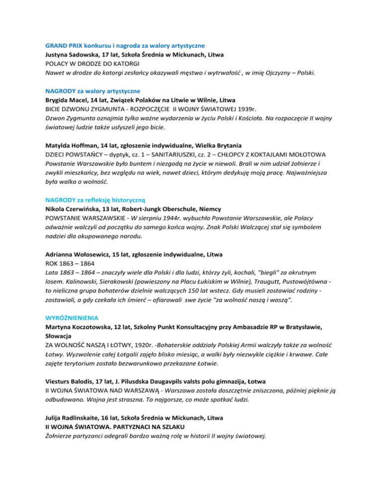 GRAND PRIX konkursu i nagroda za walory artystyczne Justyna Sadowska, 17 lat, Szkoła Średnia w Mickunach, Litwa POLACY W DRODZE DO KATORGI Nawet w drodze do katorgi zesłaocy okazywali męstwo i wytrwałośd , w imię Ojczyzny – Polski. NAGRODY za walory artystyczne Brygida Macel, 14 lat, Związek Polaków na Litwie w Wilnie, Litwa BICIE DZWONU ZYGMUNTA - ROZPOCZĘCIE II WOJNY ŚWIATOWEJ 1939r. Dzwon Zygmunta oznajmia tylko ważne wydarzenia w życiu Polski i Kościoła. Na rozpoczęcie II wojny światowej ludzie także usłyszeli jego bicie. Matylda Hoffman, 14 lat, zgłoszenie indywidualne, Wielka Brytania DZIECI POWSTAOCY – dyptyk, cz. 1 – SANITARIUSZKI, cz. 2 – CHŁOPCY Z KOKTAJLAMI MOŁOTOWA Powstanie Warszawskie było buntem i niezgodą na życie w niewoli. Brali w nim udział żołnierze i zwykli mieszkaocy, bez względu na wiek, nawet dzieci, którym dedykuję moją pracę. Najważniejsza była walka o wolnośd. NAGRODY za refleksję historyczną Nikola Czerwioska, 13 lat, Robert-Jungk Oberschule, Niemcy POWSTANIE WARSZAWSKIE - W sierpniu 1944r. wybuchło Powstanie Warszawskie, ale Polacy odważnie walczyli od początku do samego kooca wojny. Znak Polski Walczącej stał się symbolem nadziei dla okupowanego narodu. Adrianna Wołosewicz, 15 lat, zgłoszenie indywidualne, Litwa ROK 1863 – 1864 Lata 1863 – 1864 – znaczyły wiele dla Polski i dla ludzi, którzy żyli, kochali, "biegli" za okrutnym losem. Kalinowski, Sierakowski (powieszony na Placu Łukiskim w Wilnie), Traugutt, Pustowójtówna to nieliczna grupa bohaterów dzielnie walczących 150 lat wstecz. Gdy musieli zostawiad rodziny zostawiali, a gdy czekała ich śmierd – ofiarowali swe życie "za wolnośd naszą i waszą". WYRÓŻNIENIENIA Martyna Koczotowska, 12 lat, Szkolny Punkt Konsultacyjny przy Ambasadzie RP w Bratysławie, Słowacja ZA WOLNOŚĆ NASZĄ I ŁOTWY, 1920r. -Bohaterskie oddziały Polskiej Armii walczyły także za wolnośd Łotwy. Wyzwolenie całej Łotgalii zajęło blisko miesiąc, a walki były niezwykle ciężkie i krwawe. Całe zajęte terytorium zostało bezwarunkowo przekazane Łotwie. Viesturs Balodis, 17 lat, J. Pilusdska Daugavpils valsts polu gimnazija, Łotwa II WOJNA ŚWIATOWA NAD WARSZAWĄ - Warszawa została doszczętnie zniszczona, później pięknie ją odbudowano. Wojna jest straszna. To najgorsze, co może spotkad ludzi. Julija Radlinskaite, 16 lat, Szkoła Średnia w Mickunach, Litwa II WOJNA ŚWIATOWA. PARTYZNACI NA SZLAKU Żołnierze partyzanci odegrali bardzo ważną rolę w historii II wojny światowej.