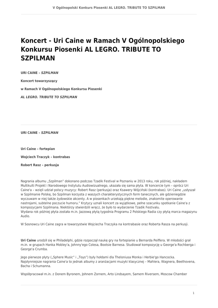 V Ogólnopolski Konkurs Piosenki AL LEGRO. TRIBUTE TO SZPILMAN Koncert - Uri Caine w Ramach V Ogólnopolskiego Konkursu Piosenki AL LEGRO. TRIBUTE TO SZPILMAN URI CAINE – SZPILMAN Koncert towarzyszący w Ramach V Ogólnopolskiego Konkursu Piosenki AL LEGRO. TRIBUTE TO SZPILMAN URI CAINE – SZPILMAN Uri Caine – fortepian Wojciech Traczyk – kontrabas Robert Rasz – perkusja Nagrania albumu „Szpilman” dokonano podczas Tzadik Festival w Poznaniu w 2013 roku, rok później, nakładem Multikulti Projekt i Narodowego Instytutu Audiowizualnego, ukazała się sama płyta. W koncercie tym – oprócz Uri Caine'a – wzięli udział polscy muzycy: Robert Rasz (perkusja) oraz Ksawery Wójciński (kontrabas). Uri Caine „usłyszał w Szpilmanie Polskę, bo Szpilman korzysta z waszych charakterystycznych form tanecznych, ale gdzieniegdzie wyczuwam w niej także żydowskie akcenty. A w piosenkach urzekają piękne melodie, znakomite operowanie nastrojami, subtelne poczucie humoru.” Krytycy uznali koncert za wyjątkowe, pełne szacunku spotkanie Caine'a z kompozycjami Szpilmana. Niektórzy stwierdzili wręcz, że było to wydarzenie Tzadik Festivalu. Wydana rok później płyta została m.in. Jazzową płytą tygodnia Programu 2 Polskiego Radia czy płytą marca magazynu Audio. W Sosnowcu Uri Caine zagra w towarzystwie Wojciecha Traczyka na kontrabasie oraz Roberta Rasza na perkusji. Uri Caine urodził się w Philadelphi, gdzie rozpoczął naukę gry na fortepianie u Bernarda Peiffera. W młodości grał m.in. w grupach Hanka Mobley'a, Johnny'ego Colesa, Bootsie Barnesa. Studiował kompozycję u George'a Rochberga i George'a Crumba. Jego pierwsze płyty („Sphere Music” i „Toys”) były hołdami dla Theloniusa Monka i Herbie'go Hancocka. Najsłynniejsze nagrania Caine'a to jednak albumy z aranżacjami muzyki klasycznej – Mahlera, Wagnera, Beethovena, Bacha i Schumanna. Współpracował m.in. z Donem Byronem, Johnem Zornem, Arto Lindsayem, Samem Riversem, Moscow Chamber 1 V Ogólnopolski Konkurs Piosenki AL LEGRO. TRIBUTE TO SZPILMAN Orchestra, Cleveland Orchestra, Enja Band, Dave'em Douglasem. Robert Rasz ukończył Wydział Jazzu Szkoły Muzycznej II st. im. Fryderyka Chopina w Warszawie i Akademii Muzycznej im. Karola Szymanowskiego w Katowicach. Współpracuje lub współpracował m.in. z Gabą Kulką, Mikołajem Trzaską, Kadabrą. Razem z Wacławem Zimplem i Wojciechem Traczykiem współtworzy Zimpel/Traczyk/Rasz Trio. Wojciech Traczyk ukończył Wydział Jazzu PSM im. F. Chopina w Warszawie oraz Akademii Muzycznej w Katowicach. Współpracuje m.in. z Marią Peszek, Marcinem Maseckim, Tworzywem Sztucznym, Muzykoterapią. Razem z Wacławem Zimplem i Robertem Raszem współtworzy Zimpel/Traczyk/Rasz Trio. https://soundcloud.com/wawmak_multikulti/sets/uri-caine-ksawery-w-jci-ski 05.12.2015 godzina 19:30 Sala Koncertowa ul. Wawel 2, Sosnowiec Cena biletów : Bilet Kat. A - 10,00 ZŁ Bilet Kat. B - 5,00 ZŁ Kasa Energetycznego Centrum Kultury ul. Będzińska 65, czynna 14:00 - 20:00 Online na stronie www.kiepura.pl 2