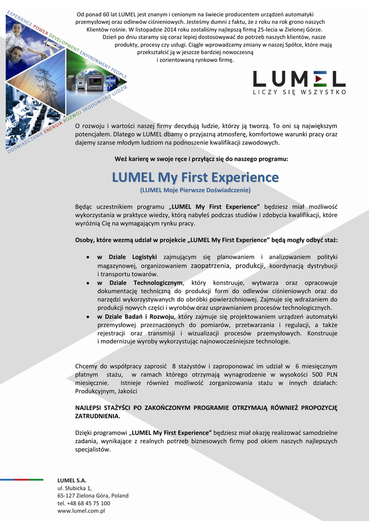 Od ponad 60 lat LUMEL jest znanym i cenionym na świecie producentem urządzeń automatyki przemysłowej oraz odlewów ciśnieniowych. Jesteśmy dumni z faktu, że z roku na rok grono naszych Klientów rośnie. W listopadzie 2014 roku zostaliśmy najlepszą firmą 25-lecia w Zielonej Górze. Dzień po dniu staramy się coraz lepiej dostosowywać do potrzeb naszych klientów, nasze produkty, procesy czy usługi. Ciągle wprowadzamy zmiany w naszej Spółce, które mają przekształcić ją w jeszcze bardziej nowoczesną i zorientowaną rynkowo firmę. O rozwoju i wartości naszej firmy decydują ludzie, którzy ją tworzą. To oni są największym potencjałem. Dlatego w LUMEL dbamy o przyjazną atmosferę, komfortowe warunki pracy oraz dajemy szanse młodym ludziom na podnoszenie kwalifikacji zawodowych. Weź karierę w swoje ręce i przyłącz się do naszego programu: LUMEL My First Experience (LUMEL Moje Pierwsze Doświadczenie) Będąc uczestnikiem programu „LUMEL My First Experience” będziesz miał możliwość wykorzystania w praktyce wiedzy, którą nabyłeś podczas studiów i zdobycia kwalifikacji, które wyróżnią Cię na wymagającym rynku pracy. Osoby, które wezmą udział w projekcie „LUMEL My First Experience” będą mogły odbyć staż: w Dziale Logistyki zajmującym się planowaniem i analizowaniem polityki magazynowej, organizowaniem zaopatrzenia, produkcji, koordynacją dystrybucji i transportu towarów. w Dziale Technologicznym, który konstruuje, wytwarza oraz opracowuje dokumentację techniczną do produkcji form do odlewów ciśnieniowych oraz do narzędzi wykorzystywanych do obróbki powierzchniowej. Zajmuje się wdrażaniem do produkcji nowych części i wyrobów oraz usprawnianiem procesów technologicznych. w Dziale Badań i Rozwoju, który zajmuje się projektowaniem urządzeń automatyki przemysłowej przeznaczonych do pomiarów, przetwarzania i regulacji, a także rejestracji oraz transmisji i wizualizacji procesów przemysłowych. Konstruuje i modernizuje wyroby wykorzystując najnowocześniejsze technologie. Chcemy do współpracy zaprosić 8 stażystów i zaproponować im udział w 6 miesięcznym płatnym stażu, w ramach którego otrzymają wynagrodzenie w wysokości 500 PLN miesięcznie. Istnieje również możliwość zorganizowania stażu w innych działach: Produkcyjnym, Jakości NAJLEPSI STAŻYŚCI PO ZAKOŃCZONYM PROGRAMIE OTRZYMAJĄ RÓWNIEŻ PROPOZYCJĘ ZATRUDNIENIA. Dzięki programowi „LUMEL My First Experience” będziesz miał okazję realizować samodzielne zadania, wynikające z realnych potrzeb biznesowych firmy pod okiem naszych najlepszych specjalistów. LUMEL S.A. ul. Słubicka 1, 65-127 Zielona Góra, Poland tel. +48 68 45 75 100 www.lumel.com.pl Do programu LUMEL My First Experience zapraszamy: Wszystkich studentów V roku oraz absolwentów studiów wyższych z Wydziału Mechanicznego oraz Wydziału Elektrotechniki, Osoby ze znajomością języka angielskiego lub niemieckiego. W ramach projektu zapewniamy: Osobistego opiekuna, który zapewni wsparcie i opiekę podczas w programie, Dostęp do narzędzi i materiałów potrzebnych do odbycia praktyki, Referencje po odbytym stażu, Wynagrodzenie w wysokości 500 zł brutto (za każdy miesiąc stażu), Możliwość stałego zatrudnienia w naszej firmie. uczestnictwa Jak zgłosić się do programu? 1. Prześlij zgłoszenie na adres mailowy: [email protected] z dopiskiem „LUMEL My First Experience”, 2. Wybrane osoby zaprosimy na rozmowę kwalifikacyjną (osoby te zostaną poproszone o wykonanie kilku zadań), 3. Wybierzemy 8 kandydatów. "Nawet najdalszą podróż zaczyna się od pierwszego kroku". Teraz również i Ty masz szansę zrobić swój pierwszy krok. Zachęcamy do aplikowania i udziału w programie „LUMEL My First Experience” Przesyłając swoją aplikację prosimy o dopisanie następującej klauzuli: "Wyrażam zgodę na przetwarzanie moich danych osobowych zawartych w ofercie pracy dla potrzeb procesu rekrutacji zgodnie z Ustawą z dnia 29.08.1997r. o Ochronie Danych Osobowych, tekst jednolity: Dz. U. z 2002 r., Nr 101, poz. 926 ze zm.” LUMEL S.A. ul. Słubicka 1, 65-127 Zielona Góra, Poland tel. +48 68 45 75 100 www.lumel.com.pl