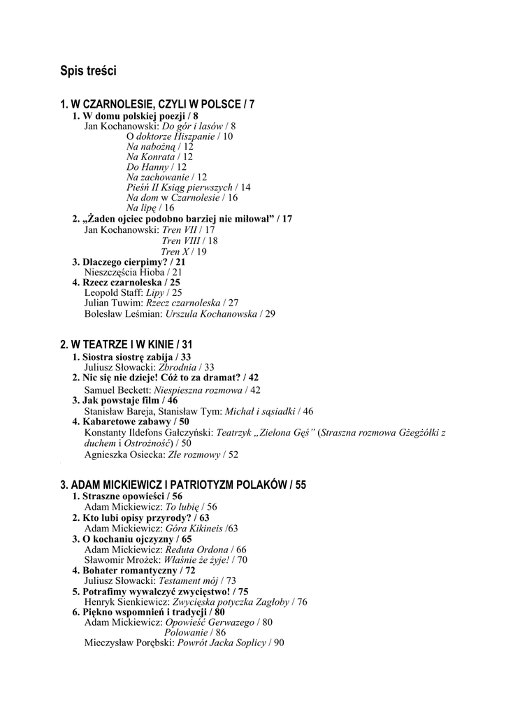 Spis treści 1. W CZARNOLESIE, CZYLI W POLSCE / 7 1. W domu polskiej poezji / 8 Jan Kochanowski: Do gór i lasów / 8 O doktorze Hiszpanie / 10 Na nabożną / 12 Na Konrata / 12 Do Hanny / 12 Na zachowanie / 12 Pieśń II Ksiąg pierwszych / 14 Na dom w Czarnolesie / 16 Na lipę / 16 2. „Żaden ojciec podobno barziej nie miłował” / 17 Jan Kochanowski: Tren VII / 17 Tren VIII / 18 Tren X / 19 3. Dlaczego cierpimy? / 21 Nieszczęścia Hioba / 21 4. Rzecz czarnoleska / 25 Leopold Staff: Lipy / 25 Julian Tuwim: Rzecz czarnoleska / 27 Bolesław Leśmian: Urszula Kochanowska / 29 2. W TEATRZE I W KINIE / 31 1. Siostra siostrę zabija / 33 Juliusz Słowacki: Zbrodnia / 33 2. Nic się nie dzieje! Cóż to za dramat? / 42 Samuel Beckett: Niespieszna rozmowa / 42 3. Jak powstaje film / 46 Stanisław Bareja, Stanisław Tym: Michał i sąsiadki / 46 4. Kabaretowe zabawy / 50 Konstanty Ildefons Gałczyński: Teatrzyk „Zielona Gęś” (Straszna rozmowa Gżegżółki z duchem i Ostrożność) / 50 Agnieszka Osiecka: Złe rozmowy / 52 . 3. ADAM MICKIEWICZ I PATRIOTYZM POLAKÓW / 55 1. Straszne opowieści / 56 Adam Mickiewicz: To lubię / 56 2. Kto lubi opisy przyrody? / 63 Adam Mickiewicz: Góra Kikineis /63 3. O kochaniu ojczyzny / 65 Adam Mickiewicz: Reduta Ordona / 66 Sławomir Mrożek: Właśnie że żyje! / 70 4. Bohater romantyczny / 72 Juliusz Słowacki: Testament mój / 73 5. Potrafimy wywalczyć zwycięstwo! / 75 Henryk Sienkiewicz: Zwycięska potyczka Zagłoby / 76 6. Piękno wspomnień i tradycji / 80 Adam Mickiewicz: Opowieść Gerwazego / 80 Polowanie / 86 Mieczysław Porębski: Powrót Jacka Soplicy / 90 4. ŚWIAT JEST JEDEN – NARODÓW WIELE 93 1. Żyliśmy razem przez wieki / 94 Icik Manger: Szmulek traci skrzydła / 95 Oczarowanie / 100 Leszek Kołakowski: O stereotypach narodowych / 101 Isaac Bashevis Singer: Moja Warszawa / 104 Hanna Krall: Teatr: Tykocin / 106 Perła / 110 Wisława Szymborska: Nienawiść / 113 Anna Kap1ińska: Gdzie jest piekło? Rozmowa z Józefem Tischnerem / 114 2. Kolorowe życie / 116 Pieśń cygańska z Papuszy głowy ułożona / 116 3. Odmienni i odlegli / 120 Ryszard Kapuściński: Przez Etiopię / 120 Moloch aktualności / 125 Świat nie jest sprawiedliwy! / 127 Powszechna Deklaracja Praw Człowieka (fragmenty) / 128 5. CUDA MIŁOŚCI / 131 1. Miłość wszystko zwycięży / 132 William Szekspir: Rozmowa zakochanych / 132 Cyprian Kamil Norwid: W Weronie / 143 Jarosław Iwaszkiewicz: Julia i Romeo / 144 Halina Poświatowska: * * * (Jestem Julią) / 144 2. Ogród miłości / 146 Dante i Beatrycze / 147 Dante Alighieri: * * * (Ma pani luba w oczach miłość niesie) / 147 Petrarka i Laura / 148 Francesco Petrarka: CXXXII (Jeśli to nie jest miłość – cóż ja czuję?) / 148 CXXXIV (Nie mam spokoju, choć wojować nie chcę) / 149 Adam i Maryla / 150 Adam Mickiewicz: Do M*** / 150 Krzysztof i Barbara /152 Krzysztof Kamil Baczyński: Miłość / 152 Biała magia / 153 3. Pierwsza miłość / 154 Lucyna Legut: Wszyscy potrzebują miłości / 155 Konstanty Ildefons Gałczyński: Brzydkie oczy / 161 Bułat Okudżawa: * * * (Pierwsza miłość z wiatrem gna) / 163 Małgorzata Hillar: My z drugiej połowy XX wieku / 165 4. Zakochani piszą listy / 166 Adam Mickiewicz do Maryli Wereszczakówny (1822) / 166 Halina Poświatowska do Ireneusza Morawskiego (1966) / 168 5. Nie igra się z miłością!? / 170 Antoni Czechow: Zły chłopiec / 170 Konstanty Ildefons Galczyński: Teatrzyk „Zielona Gęś” (Zaręczyny Gżegżółki i Miłość) / 173 6. O POŻYTKACH Z WYOBRAŹNI / 177 1. Wyobraź sobie... / 178 Zbigniew Herbert: Pudełko zwane wyobraźnią / 178 Fragment wazy greckiej / 179 Kołatka / 181 2. Wyobraźnia i rzeczywistość / 183 Saki (Hector Hugh Munro): Otwarte okno / 183 3. Münchhauzenada, czyli za wiele wyobraźni / 187 Gottfried August Bürger: Opowieści szalonego barona / 188 4. Wyobraźnia odkrywcy / 191 C. W. Ceram: Skarby w „Dolinie Królów” / 191 7. EUROPA TO NASZA WSPÓLNA SPRAWA / 201 1. Nienasycona ciekawość / 202 Opowieść o potopie / 202 Marcin Jamkowski: Plaża Noego / 206 2. Świat w oczach laureatów Nagrody Nobla / 210 Wisława Szymborska: Jarmark cudów / 210 William Golding: Zabicie zwierza / 212 Josif Brodski: Przepływają obłoki / 220 Günther Grass: Blaszany bębenek (fragment) / 222 Czesław Miłosz: Gucio zaczarowany (fragment) / 226 O aniołach / 227 3. Świat pełen barier / 229 Zygmunt Bocheński: Poszukiwania wymarłych ptaków / 230 Marta Korotaj: Tor przeszkód / 232 Andrzej S. Rodys: Sport każdemu pomaga / 234 Jan Twardowski: Niewidoma dziewczynka / 235 4. Europejskie prezentacje / 238 Dorota Szwarcman: Kompozytor świata / 238 Dariusz Domański: Z Polski do Tokio. Wywiad z Łukaszem Kuropaczewskim / 241 Lena Małgorzata Piątkowska: * * * [Czy można tańczyć] / 242 Anna Piżl: Oczekiwanie / 244 Michał Książkiewicz: Moje odkrycie / 245 8. BOHATEROWIE MASOWEJ WYOBRAŹNI / 247 l. Mały wielki świat / 248 Arthur Conan Doyle: Sztuka dedukcji / 249 W zaginionym świecie / 252 2. Na tropie tajemnic / 261 Les Martin: Misja ratunkowa / 261 3. Fabryka gwiazd / 267 Robert Leszczyński: Jak się robi zespół / 267 4. Rzecz o potędze reklamy / 271 Sławomir Mrożek: Półpancerze praktyczne / 272 5. Papierowi bohaterowie / 276 René Goscinny (tekst), Albert Uderzo (rysunki): Przygody Asteriksa pod piramidami / 278 Spis twórców, terminów oraz mitów i symboli kultury / 286