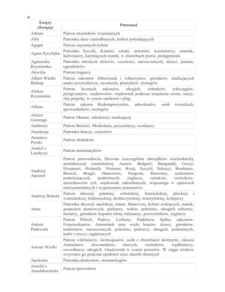 A Święty (Święta) Adrian Afra Agapit Patronaż Patron strażników więziennych Patronka dusz zaniedbanych, kobiet pokutujących Patron ciężarnych kobiet Patronka Sycylii, Katanii, sztuki, artystów, kominiarzy, nianiek, Agata Sycylijka ludwisarzy, karmiących matek, w chorobach piersi, pielęgniarek Agnieszka Patronka młodych dziewic, czystości, narzeczonych, dzieci, panien, Rzymianka ogrodników Akwilin Patron tragarzy Albert Wielki Patron zakonów Albertynek i Albertynów, górników, studiujących Biskup nauki przyrodnicze, uczonych, plastyków, teologów Patron licznych zakonów, ubogich, żebraków, włóczęgów, Aleksy pielgrzymów, wędrowców, orędownik podczas trzęsienia ziemi, suszy, Rzymianin złej pogody, w czasie epidemii i plag Patron zakonu Redemptorystów, adwokatów, osób świeckich, Alfons spowiedników, teologów Alojzy Patron Mantui, młodzieży studiującej Gonzaga Ambroży Patron Bolonii, Mediolanu, pszczelarzy, woskarzy Anastazja Patronka tkaczy, cenzorów Anastazy Patron złotników Perski Anatol z Patron matematyków Laodycei Patron prawosławia, Słowian (szczególnie obrządków wschodnich), archidiecezji warmińskiej, Austrii, Bułgarii, Burgundii, Grecji, Hiszpanii, Holandii, Niemiec, Rosji, Sycylii, Szkocji, Bordeaux, Andrzej Brescii, Brugii, Hanoweru, Neapolu, Rawenny, małżeństw Apostoł podróżujących, podróżnych, żeglarzy, rybaków, rzeźników, sprzedawców ryb, orędownik zakochanych, wspomaga w sprawach matrymonialnych i wypraszaniu potomstwa Patron diecezji pińskiej, wileńskiej, łomżyńskiej, płockiej i Andrzej Bobola warmińskiej, białostockiej, drohiczyńskiej, łomżyńskiej, kolejarzy Patronka diecezji opolskiej, miast, Hanoveru, kobiet rodzących, matek, Anna gospodyń domowych, piekarzy, wdów, położnic, ubogich robotnic, stolarzy, górników kopalni złota, młynarzy, powroźników, żeglarzy Patron Włoch, Padwy, Lizbony, Padeborn, Splitu, zakonów: Antoni Franciszkanów, Antoninek oraz wielu bractw, dzieci, górników, Padewski małżeństw, narzeczonych, położnic, piekarzy, ubogich, podróżnych, ludzi i rzeczy zaginionych Patron wikliniarzy, świniopasów, osób z chorobami skórnymi, zakonu Antoninów, dzwonników, chorych, rzeźników, wędliniarzy, Antoni Wielki szczotkarzy, ubogich. Orędownik w czasie pożarów. W ciągu wieków wzywano go podczas epidemii oraz chorób skórnych Apolonia Patronka dentystów, stomatologów Arnold z Patron śpiewaków Arnoldsweicler Arnulf Augustyn Autbert Patron młynarzy, piwowarów Patron zakonu Augustianów, kanoników regularnych, Magdalenek, Kartaginy, drukarzy, wydawców, teologów Patron piekarzy B Baldomer Barbara z Nikomedii Barnaba Apostoł Bartłomiej Apostoł Bazyli Benedykt z Nursji Benild Benon z Miśni Bernard z Aosty Bernard z Badenii Bernard z Clairvaux Bernard (Bernardyn) ze Sieny Blandyna Błażej Bonawentura Bonifacy Brendan Brunon Kartuz Brycjusz Brygida Królowa Brygida z Patron ślusarzy Patronka archidiecezji katowickiej, Edessy, Kairu, architektów, cieśli, dzwonników, flisaków, górników, hutników, kamieniarzy, kowali, ludwisarzy, marynarzy, murarzy, saperów, strażników, szczotkarzy, tkaczy, więźniów, wytwórców sztucznych ogni, żołnierzy (szczególnie artylerzystów i załóg twierdz), dobrej śmierci Patron Florencji, Mediolanu, orędownik podczas kłótni, sporów, smutku oraz burz gradowych Patronem Armenii, Fermo, Frankfurtu nad Menem, Maastricht, introligatorów, tynkarzy, garbarzy, rybaków, rzeźników, zegarmistrzów Patron zakonu Bazylianów i sióstr św. Krzyża Patron wielu zakonów, diecezji tarnowskiej, Francji, architektów, górników, inżynierów, nauczycieli, speleologów, uczniów, wydawców, kotlarzy, orędownik w chorobach róży oraz konających Patron nauczycieli Patron rybaków, sukienników Patron alpinistów, narciarzy, broni pól przed burzą Patron mężczyzn Patron zakonu Cystersów, Burgundii, Ligurii, Genui, Gibraltaru, Pelplina, pszczelarzy, opiekun podczas klęsk żywiołowych, sztormów oraz w godzinie śmierci Patron zakonu Bernardynów, Sieny, tkaczy, reklamy, orędownik chorych na gardło i krwawiących Patronka pomocy domowych, dziewic Patron przemysłu wełniarskiego, handlarzy wełną, kapeluszników, lekarzy, gręplarzy, chorób gardła, opiekun zwierząt, szewców, sztukatorów Patron zakonu Franciszkanów, matek oczekujących potomstwa, dzieci, robotników, teologów, tragarzy, wytwórców jedwabiu Patron Niemiec, diecezji w Fuldzie, Erfurcie, Moguncji, łomżyńskiej, archidiecezji warmińskiej, kasjerów, krawców, księgarzy, piwowarów Patron żeglarzy i podróżników Patron Kartuzów, obłąkanych Patron sędziów Patronka Szwecji, pielgrzymów, dobrej śmierci Patronka Irlandii, opiekunka pracujących na roli Kildar C Cecylia Celestyn Cezary z Nazjanzu Chlodwald Chryzant Cyriak Cyryl Patronka chórzystów, lutników, muzyków, organistów, zespołów wokalno-muzycznych, śpiewaków, niewidomych Patron introligatorów Patron lekarzy Patron wytwórców gwoździ Patron sędziów Patron ciężkiej pracy Patron Europy D Damazy I Papież Damian Daria Dawid Demetriusz z Salonik Dionizy Dominik kapłan Dominik Savio Dorota Dunstan Dyzma E Eberhard Edward Wyznawca Efrem Eliasz Prorok Eligiusz Elżbieta Patron archiwariuszy kościelnych Patron aptekarzy, chirurgów i mędrców, stomatologów Patron sędziów Patron Walii i Bath Patron żołnierzy Patron strzelców, przywoływany w różnych okolicznościach, m.in. przy bólu głowy, opętaniu i kłótniach Patron zakonu Dominikanów – gałęzi żeńskiej i męskiej, Bolonii, Kordoby, Madrytu, Palermo Patron dzieci, ministrantów, chórów dziecięcych, młodzieży Patronka piwowarów, górników, panien młodych, młodych małżeństw, narzeczonych, kwiaciarzy, ogrodników, botaników, położnych i par młodych, sprzedawców kwiatów Patron ślusarzy, złotników Patron złodziei Patron pasterzy Patron królów angielskich Patron Asturii P