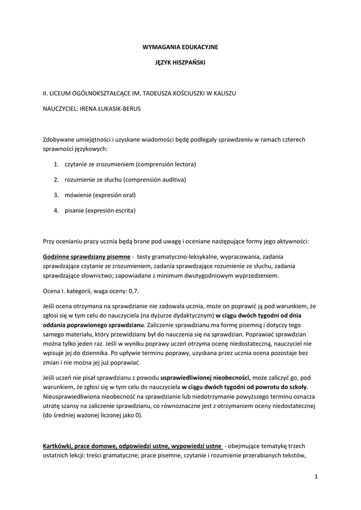 WYMAGANIA EDUKACYJNE JĘZYK HISZPAŃSKI II. LICEUM OGÓLNOKSZTAŁCĄCE IM. TADEUSZA KOŚCIUSZKI W KALISZU NAUCZYCIEL: IRENA ŁUKASIK-BERUS Zdobywane umiejętności i uzyskane wiadomości będę podlegały sprawdzeniu w ramach czterech sprawności językowych: 1. czytanie ze zrozumieniem (comprensión lectora) 2. rozumienie ze słuchu (comprensión auditiva) 3. mówienie (expresión oral) 4. pisanie (expresión escrita) Przy ocenianiu pracy ucznia będą brane pod uwagę i oceniane następujące formy jego aktywności: Godzinne sprawdziany pisemne - testy gramatyczno-leksykalne, wypracowania, zadania sprawdzające czytanie ze zrozumieniem, zadania sprawdzające rozumienie ze słuchu, zadania sprawdzające słownictwo; zapowiadane z minimum dwutygodniowym wyprzedzeniem. Ocena I. kategorii, waga oceny: 0,7. Jeśli ocena otrzymana na sprawdzianie nie zadowala ucznia, może on poprawić ją pod warunkiem, że zgłosi się w tym celu do nauczyciela (na dyżurze dydaktycznym) w ciągu dwóch tygodni od dnia oddania poprawionego sprawdzianu. Zaliczenie sprawdzianu ma formę pisemną i dotyczy tego samego materiału, który przewidziany był do nauczenia się na sprawdzian. Poprawiać sprawdzian można tylko jeden raz. Jeśli w wyniku poprawy uczeń otrzyma ocenę niedostateczną, nauczyciel nie wpisuje jej do dziennika. Po upływie terminu poprawy, uzyskana przez ucznia ocena pozostaje bez zmian i nie można jej już poprawiać. Jeśli uczeń nie pisał sprawdzianu z powodu usprawiedliwionej nieobecności, może zaliczyć go, pod warunkiem, że zgłosi się w tym celu do nauczyciela w ciągu dwóch tygodni od powrotu do szkoły. Nieusprawiedliwiona nieobecność na sprawdzianie lub niedotrzymanie powyższego terminu oznacza utratę szansy na zaliczenie sprawdzianu, co równoznaczne jest z otrzymaniem oceny niedostatecznej (do średniej ważonej liczonej jako 0). Kartkówki, prace domowe, odpowiedzi ustne, wypowiedzi ustne - obejmujące tematykę trzech ostatnich lekcji: treści gramatyczne; prace pisemne, czytanie i rozumienie przerabianych tekstów, 1 ćwiczenia gramatyczno-leksykalne; znajomość słownictwa, dialogi, monologi, opowiadania, dyktanda, tłumaczenia. Ocena II. kategorii, waga oceny: 0,3. Oceny tej kategorii nie podlegają poprawie. W przypadku stwierdzenia przez nauczyciela niesamodzielnego pisania przez ucznia sprawdzianu, kartkówki, udzielania odpowiedzi ustnej, wykonania pracy domowej, nauczyciel wystawia uczniowi cząstkową ocenę niedostateczną za tę formę sprawdzenia wiedzy. Uczeń nie ma możliwości poprawy takiej oceny. Przygotowanie do lekcji należy rozumieć jako: posiadanie i staranne prowadzenie zeszytu przedmiotowego, posiadanie i wypełnianie zeszytu ćwiczeń, posiadanie podręcznika, odrabianie pracy domowej, znajomość aktualnie realizowanego materiału - brak lub nierealizowanie któregokolwiek z powyższych elementów jest jednoznaczne z nieprzegotowaniem się do lekcji; zaistniałe braki należy uzupełnić na następne zajęcia uczeń może zgłosić brak przygotowania do lekcji 2 razy w semestrze, zawsze przed rozpoczęciem zajęć Aktywność na lekcjach aktywność na lekcjach polega na systematycznym i aktywnym uczestniczeniu w różnorodnych formach pracy na zajęciach: praca indywidualna, praca w parach, w grupach, udział w dyskusji wykonywanie zadań dodatkowych jest odnotowywane w dzienniku i będzie brane pod uwagę przy wystawianiu oceny końcowej udział w konkursach przedmiotowych, w zależności od wyników, wpływa na podwyższenie oceny końcowej Obecność na zajęciach uczeń, który opuścił ponad 50% lekcji (nieobecności usprawiedliwione jak i nieusprawiedliwione) może być niesklasyfikowany 2 Ocena końcowa ( śródroczna i końcoworoczna) jest wystawiana za semestralną lub całoroczną pracę ucznia, na podstawie ocen cząstkowych za każdą sprawność językową i nie może zostać zmieniona na podstawie jednostkowego sprawdzianu lub odpowiedzi. Jest ona średnią ważoną zdobytych ocen w końcowej ocenie uwzględniona jest również postawa na lekcji, podejmowanie zadań dodatkowych oraz aktywność na lekcjach ocena końcowa ustalona przez nauczyciela jest nieodwołalna i może być zweryfikowana tylko w wyniku egzaminu sprawdzającego KRYTERIA OCENIANIA SPRAWNOŚCI PISANIA (oceniane są następujące elementy: treść, słownictwo, forma i objętość, poprawność językowa, płynność, ortografia i interpunkcja) ocena celująca - wypowiedź zawiera wszystkie elementy określone w poleceniu, w całości zgodna z tematem i założoną formą, wielostronne i oryginalne ujęcie tematu (różnorodność myśli i argumentów), wypowiedź spójna i logiczna, objętość pracy zgodna z wymogami, brak błędów gramatycznych, leksykalnych i ortograficznych, poprawna interpunkcja, duże urozmaicenie użytych struktur gramatycznych i leksykalnych, precyzyjny dobór słownictwa (użycie idiomów), brak powtórzeń, różne sposoby łączenia zdań. ocena bardzo dobra – wypowiedź zawiera wszystkie elementy określone w poleceniu, w całości zgodna z tematem i założoną formą, wielostronne i oryginalne ujęcie tematu (różnorodność myśli i argumentów), wypowiedź spójna i logiczna, objętość pracy może przekraczać podane granice do +10%, drobne, sporadyczne błędy gramatyczne i leksykalne nie zakłócające komunikacji, nieliczne (do 10% słów) błędy ortograficzne nie zmieniające znaczenia wyrazu, poprawna interpunkcja, duże urozmaicenie użytych struktur gramatycznych i leksykalnych, precyzyjny dobór słownictwa, brak powtórzeń, różne sposoby łączenia zdań. ocena dobra – wypowiedź zawiera wszystkie elementy określone w poleceniu, w całości zgodna z tematem, zgodna z założoną formą z niewielkimi uchybieniami, poprawne ale schematyczne ujęcie tematu (widoczna myśl przewodnia), wypowiedź w znacznym stopniu spójna i logiczna, objętość pracy może przekraczać podane granice do +15%, dro