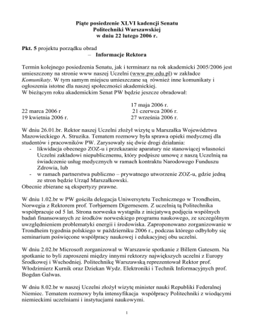 Piąte posiedzenie XLVI kadencji Senatu Politechniki Warszawskiej w dniu 22 lutego 2006 r. Pkt. 5 projektu porządku obrad – Informacje Rektora Termin kolejnego posiedzenia Senatu, jak i terminarz na rok akademicki 2005/2006 jest umieszczony na stronie www naszej Uczelni (www.pw.edu.pl) w zakładce Komunikaty. W tym samym miejscu umieszczane są również inne komunikaty i ogłoszenia istotne dla naszej społeczności akademickiej. W bieżącym roku akademickim Senat PW będzie jeszcze obradował: 17 maja 2006 r. 21 czerwca 2006 r. 27 września 2006 r. 22 marca 2006 r 19 kwietnia 2006 r. W dniu 26.01.br. Rektor naszej Uczelni złożył wizytę u Marszałka Województwa Mazowieckiego A. Struzika. Tematem rozmowy była sprawa opieki medycznej dla studentów i pracowników PW. Zarysowały się dwie drogi działania: - likwidacja obecnego ZOZ-u i przekazanie aparatury nie stanowiącej własności Uczelni zakładowi niepublicznemu, który podpisze umowę z naszą Uczelnią na świadczenie usług medycznych w ramach kontraktu Narodowego Funduszu Zdrowia, lub - w ramach partnerstwa publiczno – prywatnego utworzenie ZOZ-u, gdzie jedną ze stron będzie Urząd Marszałkowski. Obecnie zbierane są ekspertyzy prawne. W dniu 1.02.br w PW gościła delegacja Uniwersytetu Technicznego w Trondheim, Norwegia z Rektorem prof. Torbjørnem Digernesem. Z uczelnią tą Politechnika współpracuje od 5 lat. Strona norweska wystąpiła z inicjatywą podjęcia wspólnych badań finansowanych ze środków norweskiego programu naukowego, ze szczególnym uwzględnieniem problematyki energii i środowiska. Zaproponowano zorganizowanie w Trondheim tygodnia polskiego w październiku 2006 r., podczas którego odbyłoby się seminarium poświęcone współpracy naukowej i edukacyjnej obu uczelni. W dniu 2.02.br Microsoft zorganizował w Warszawie spotkanie z Billem Gatesem. Na spotkanie to byli zaproszeni między innymi rektorzy największych uczelni z Europy Środkowej i Wschodniej. Politechnikę Warszawską reprezentował Rektor prof. Włodzimierz Kurnik oraz Dziekan Wydz. Elektroniki i Technik Informacyjnych prof. Bogdan Galwas. W dniu 8.02.br w naszej Uczelni złożył wizytę minister nauki Republiki Federalnej Niemiec. Tematem rozmowy była intensyfikacja współpracy Politechniki z wiodącymi niemieckimi uczelniami i instytucjami naukowymi. 1 W dniu 9.02.br odbyło się posiedzenie Rady Naukowej Centrum Transferu Technologii. Głównym tematem posiedzenia były perspektywy rozwoju jednostki w kontekście nowej organizacji badan naukowych, która zostanie przedstawiona w dalszej części obrad Senatu. W dniu 13.02.br. w Belwederze odbyła się konferencja zatytułowana „Badania i innowacje dla rozwoju Regionów”. Konferencję zorganizował prof. J. Buzek, a wzięli w niej udział między innymi Szef Kancelarii Prezydenta RP min. Andrzej Urbański i Komisarz Unii Europejskiej Danuta Hübner. Nasza Uczelnia reprezentowana była przez Rektora prof. Włodzimierza Kurnika i Prorektora ds. Nauki prof. Tadeusza Kulika. W dniu 14.02.br w Sali Senatu naszej Uczelni została podpisana umowa powołująca Warszawskie Konsorcjum Naukowe. W skład konsorcjum wchodzą: Politechnika Warszawska, Uniwersytet Warszawski, Akademia Medyczna, Szkoła Główna Gospodarstwa Wiejskiego, Wojskowa Akademia Techniczna, Szkoła Główna Handlowa, Polsko-Japońska Wyższa Szkoła Technik Komputerowych, Wyższa Szkoła Przedsiębiorczości i Zarządzania, Polska Akademia Nauk oraz Ośrodek Przetwarzania Informacji. Celem konsorcjum jest integracja warszawskiego środowiska naukowego w pracach nad rozwojem nowoczesnych technologii oraz ich aplikacji, a także opracowanie koncepcji działania Warszawskiego Parku Technologicznego. Zgodnie z umową Konsorcjum, w roku bieżącym nasza Uczelnia ma w nim rolę wiodącą. Dnia 21.02.br. ukonstytuowała się Rada konsorcjum, której Przewodniczącym został Rektor Politechniki Warszawskiej prof. Włodzimierz Kurnik. Rada m.st. Warszawy przyznała 19 studentom Politechniki Warszawskiej stypendia im. Jana Pawła II na okres od 1.10.2005 do 30.06.2006 r. Chór Akademicki PW wygrał rejonowe eliminacje do XII Ogólnopolskiego Festiwalu Kolęd i Pastorałek, które odbyły się 19 grudnia2005 r. w Wesołej i zaprezentował się 7 stycznia br. w finale Festiwalu w Będzinie. Dnia 28.01.br. odbył się po raz drugi Wielki Bal Karnawałowy „Karnavauli 2006” organizowany przez Samorząd Studentów i Stowarzyszenie Studentów „BEST”. W balu uczestniczyło ponad tysiąc osób, w tym wielu rektorów uczelni warszawskich. 28.02.2006 r. o godz. 19.00 odbędzie się XXVIII Koncert z cyklu Wielka Muzyka w Małej Auli, poświęcony jubileuszowi 5-lecia Chóru Akademickiego Politechniki Warszawskiej. Serdecznie zapraszamy. Jego Magnificencja Rektor wraz z Samorządem Studentów PW i Akademickim Stowarzyszeniem „Soli DEO” organizuje cykl seminariów pod wspólnym hasłem „Jak żyć ?”. Pierwsze seminarium odbędzie się 7 marca br. (wtorek w Małej Auli Gm. Główny, godz. 17.00 – Temat: „SEX – poezja czy rzemiosło”, prowadzi ks. Piotr Pawlukiewicz (kościół akademicki Św. Anny). 2