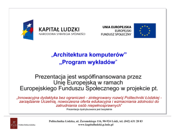„Architektura komputerów” „Program wykładów” Prezentacja jest współfinansowana przez Unię Europejską w ramach Europejskiego Funduszu Społecznego w projekcie pt. „Innowacyjna dydaktyka bez ograniczeń - zintegrowany rozwój Politechniki Łódzkiej zarządzanie Uczelnią, nowoczesna oferta edukacyjna i wzmacniania zdolności do zatrudniania osób niepełnosprawnych” Prezentacja dystrybuowana jest bezpłatnie Politechnika Łódzka, ul. Żeromskiego 90-924 Łódź, tel. (042) 631 28 83 Projekt współfinansowany przez Unię116, Europejską www.kapitalludzki.p.lodz.pl w ramach Europejskiego Funduszu Społecznego Architektura komputerów Grzegorz Jabłoński Katedra Mikroelektroniki i Technik Informatycznych [email protected] ul. Wólczańska 221/223, pokój 33 Materiały wykładowe: http://neo.dmcs.pl/ak-pod Projekt współfinansowany przez Unię Europejską w ramach Europejskiego Funduszu Społecznego 2 Architektura komputerów Informacje organizacyjne • Warunki zaliczenia Projekt współfinansowany przez Unię Europejską w ramach Europejskiego Funduszu Społecznego 3 Architektura komputerów 4 Wprowadzenie • • • • • Pojęcie algorytmu Pojęcie zmiennej Pętle Pamięć jako lista ponumerowanych komórek Licznik rozkazów Projekt współfinansowany przez Unię Europejską w ramach Europejskiego Funduszu Społecznego Architektura komputerów System dwójkowy • • • • • • Pojęcie systemu liczbowego Naturalny kod binarny Kod uzupełnień do dwóch Kodowanie znaków alfanumerycznych Liczby zmiennoprzecinkowe Dwójkowe kodowanie rozkazów Projekt współfinansowany przez Unię Europejską w ramach Europejskiego Funduszu Społecznego 5 Architektura komputerów Podstawowe urządzenia wejściowe • Klawiatura • Mysz Projekt współfinansowany przez Unię Europejską w ramach Europejskiego Funduszu Społecznego 6 Architektura komputerów Monitor ekranowy • • • • Cyfrowa reprezentacja kolorów Obraz jako macierz pikseli Konstrukcja monitorów CRT i LCD Karta graficzna Projekt współfinansowany przez Unię Europejską w ramach Europejskiego Funduszu Społecznego 7 Architektura komputerów Pamięci masowe • Dyski twarde • Pamięci półprzewodnikowe • Pamięci optyczne Projekt współfinansowany przez Unię Europejską w ramach Europejskiego Funduszu Społecznego 8 Architektura komputerów Zaawansowane urządzenia wejścia/wyjścia • • • • Skaner Cyfrowy aparat fotograficzny Cyfrowa kamera Karta dźwiękowa Projekt współfinansowany przez Unię Europejską w ramach Europejskiego Funduszu Społecznego 9 Architektura komputerów 10 Uruchamianie systemu operacyjnego. BIOS. • Wybór urządzenia z systemem operacyjnym • Konfiguracja parametrów komputera Projekt współfinansowany przez Unię Europejską w ramach Europejskiego Funduszu Społecznego „Architektura komputerów” „Program wykładów” Prezentacja jest współfinansowana przez Unię Europejską w ramach Europejskiego Funduszu Społecznego w projekcie pt. „Innowacyjna dydaktyka bez ograniczeń - zintegrowany rozwój Politechniki Łódzkiej zarządzanie Uczelnią, nowoczesna oferta edukacyjna i wzmacniania zdolności do zatrudniania osób niepełnosprawnych” Prezentacja dystrybuowana jest bezpłatnie Politechnika Łódzka, ul. Żeromskiego 90-924 Łódź, tel. (042) 631 28 83 Projekt współfinansowany przez Unię116, Europejską www.kapitalludzki.p.lodz.pl w ramach Europejskiego Funduszu Społecznego