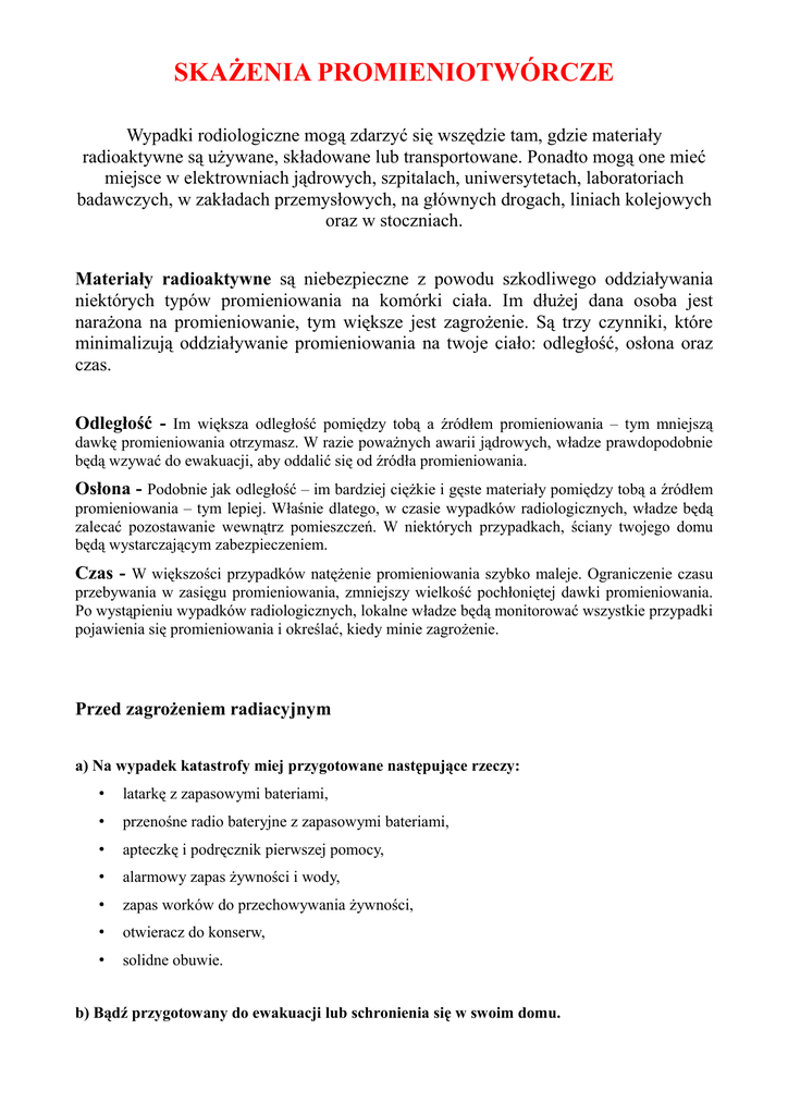 SKAŻENIA PROMIENIOTWÓRCZE Wypadki rodiologiczne mogą zdarzyć się wszędzie tam, gdzie materiały radioaktywne są używane, składowane lub transportowane. Ponadto mogą one mieć miejsce w elektrowniach jądrowych, szpitalach, uniwersytetach, laboratoriach badawczych, w zakładach przemysłowych, na głównych drogach, liniach kolejowych oraz w stoczniach. Materiały radioaktywne są niebezpieczne z powodu szkodliwego oddziaływania niektórych typów promieniowania na komórki ciała. Im dłużej dana osoba jest narażona na promieniowanie, tym większe jest zagrożenie. Są trzy czynniki, które minimalizują oddziaływanie promieniowania na twoje ciało: odległość, osłona oraz czas. Odległość - Im większa odległość pomiędzy tobą a źródłem promieniowania – tym mniejszą dawkę promieniowania otrzymasz. W razie poważnych awarii jądrowych, władze prawdopodobnie będą wzywać do ewakuacji, aby oddalić się od źródła promieniowania. Osłona - Podobnie jak odległość – im bardziej ciężkie i gęste materiały pomiędzy tobą a źródłem promieniowania – tym lepiej. Właśnie dlatego, w czasie wypadków radiologicznych, władze będą zalecać pozostawanie wewnątrz pomieszczeń. W niektórych przypadkach, ściany twojego domu będą wystarczającym zabezpieczeniem. Czas - W większości przypadków natężenie promieniowania szybko maleje. Ograniczenie czasu przebywania w zasięgu promieniowania, zmniejszy wielkość pochłoniętej dawki promieniowania. Po wystąpieniu wypadków radiologicznych, lokalne władze będą monitorować wszystkie przypadki pojawienia się promieniowania i określać, kiedy minie zagrożenie. Przed zagrożeniem radiacyjnym a) Na wypadek katastrofy miej przygotowane następujące rzeczy: • latarkę z zapasowymi bateriami, • przenośne radio bateryjne z zapasowymi bateriami, • apteczkę i podręcznik pierwszej pomocy, • alarmowy zapas żywności i wody, • zapas worków do przechowywania żywności, • otwieracz do konserw, • solidne obuwie. b) Bądź przygotowany do ewakuacji lub schronienia się w swoim domu. c) Opracuj plan komunikowania się na wypadek zagrożenia. d) Przygotuj plan oraz sposoby powrotu do domu członków rodziny, jeżeli w czasie wystąpienia zagrożenia są rozdzieleni (realna możliwość w ciągu dnia, gdy dorośli są w pracy, a dzieci w szkole). e) Poproś krewnych lub znajomych, zamieszkałych w innych miejscowościach, aby służyli jako miejsce kontaktu dla twojej rodziny. Upewnij się czy wszyscy członkowie twojej rodziny znają nazwisko, adres i numer telefonu osoby kontaktowej. f) Jeśli prowadzisz samodzielne gospodarstwo rolne, zastanów się nad zabezpieczeniem paszy dla zwierząt hodowlanych, ujęć wody pitnej oraz pomieszczeń dla nich. W czasie zagrożenia radiacyjnego a) zachowaj spokój: • nie każdy wypadek, związany z wydostaniem się substancji promieniotwórczej jest dla Ciebie niebezpieczny, • wypadek może dotyczyć tylko terenu zakładu (elektrowni atomowej) i może nie powodować żadnych zagrożeń zewnętrznych. b) Uważnie i stale słuchaj radia, oglądaj telewizję krajową lub lokalną. Komunikaty określą charakter wypadku, stopień zagrożenia oraz zasięg i szybkość rozprzestrzeniania się – wykonaj zalecenia wynikające z komunikatów. c) Gdy powracasz do miejsca schronienia z zewnątrz: • weź prysznic, zmień buty i odzież, • schowaj rzeczy noszone na zewnątrz do plastikowej torby i szczelnie je zamknij. d) Jeśli otrzymasz polecenie ewakuacji wykonuj je niezwłocznie, według zaleceń władz (służb ratowniczych): • nasłuchuj w radiu i telewizji komunikatów o drogach ewakuacji, tymczasowych schronach i sposobach postępowania, • zabierz przygotowane na ewakuację rzeczy. Pamiętaj o swoich sąsiadach, którzy mogą potrzebować specjalnej pomocy przy małych dzieciach, starszych lub niepełnosprawnych osobach. e) W wypadku zaniechania ewakuacji, pozostań w domu: • zabezpiecz i pozamykaj okna i drzwi, • wyłącz klimatyzację, wentylację, ogrzewanie nawiewowe itp., • miej przy sobie cały czas włączone radio bateryjne, • zamknij, uszczelnij zasuwy piecowe i kominowe, • udaj się do piwnicy lub innych pomieszczeń, poniżej powierzchni gruntu, • pozostań wewnątrz pomieszczeń do czasu, aż władze (służby ratownicze) ogłoszą, że jest już bezpiecznie, • jeśli musisz wyjść na zewnątrz, zakryj usta i nos mokrym ręcznikiem. Bądź przygotowany do ewakuacji lub schronienia się na dłuższy czas w swoim domu. f) Ukryj inwentarz i nakarm go przechowaną w zamknięciu paszą. g) Nie używaj telefonu, jeśli nie jest to konieczne. Linie telefoniczne są niezbędne dla akcji ratowniczej. h) Przechowuj żywność w szczelnych pojemnikach lub lodówce: • nie zabezpieczoną żywność, przed schowaniem dokładnie opłucz, • zrezygnuj ze spożywania owoców, warzyw i wody z niepewnych źródeł. i) Dalej postępuj zgodnie z zaleceniami określonymi przez władze (służby ratownicze) do czasu odwołania zagrożenia skażeniem promieniotwórczym. Po odwołaniu zagrożenia radiacyjnego a) Opuść ukrycie i w razie najmniejszych podejrzeń o skażeniu poddaj siebie i rodzinę zabiegom sanitarnym. b) Unikaj spożywania żywności z twojego ogrodu oraz od twoich krów i kóz, dopóki nie będą zbadane przez lokalny urząd sanitarny. c) W przypadku zarządzenia ewakuacji zabierz ze sobą najcenniejsze rzeczy, odzież, dokumenty i produkty żywnościowe. Zabezpiecz mieszkanie