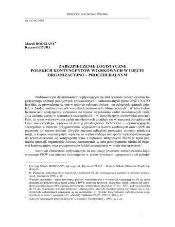 ZESZYTY NAUKOWE WSOWL Nr 4 (146) 2007 Marek BODZIANY Ryszard CZUBA ZABEZPIECZENIE LOGISTYCZNE POLSKICH KONTYNGENTÓW WOJSKOWYCH W UJĘCIU ORGANIZACYJNO – PROCEDURALNYM Podstawowym determinantem wpływającym na efektywność zabezpieczenia logistycznego operacji pokojowych prowadzonych i nadzorowanych przez ONZ i NATO jest fakt, że prowadzone są one w różnych rejonach świata - na odległych teatrach działań, w bardzo zróżnicowanych warunkach terenowych i klimatycznych 1. W takich okolicznościach kontyngenty kierowane do rejonu wypełniania zadań mandatowych realizują zadania często w warunkach szczególnych – w specyficznym środowisku działań2. Fakt, iż rejon wykonywania zadań mandatowych znajduje się w znacznej odległości od kraju macierzystego, wpływa na szereg przedsięwzięć techniczno – organizacyjnych, szczególnie w zakresie przygotowania, wyposażenia stanów osobowych oraz UiSW do przerzutu do rejonu działań. Zwykle znaczna odległość pomiędzy rejonem pełnienia misji, a krajem macierzystym wpływa na wybór rodzaju transportu wykorzystywanego do przemieszczenia się kontyngentu wraz z zapasami taktycznymi ŚBiM w rejon pełnienia operacji, organizację dowozu zaopatrzenia w celu podtrzymania zdolności bojowej kontyngentów oraz przygotowanie źródeł zaopatrzenia w kraju macierzystym3. Istotnym elementem wpływającym na realizację procesów zabezpieczenia logistycznego PKW jest miejsce kontyngentu w przewidywanym ugrupowaniu sił pokojo 1 - - - - - 2 3 kpt. mgr Marek BODZIANY, kpt. mgr inż. Ryszard CZUBA – Wyższa Szkoła Oficerska Wojsk Lądowych B. Piekarski, Zabezpieczenie logistyczne jednostek SZ RP realizujących zadania w misjach pokojowych, Warszawa 1998, s. 15. Warunki normalne – teren równinny, pocięty wzniesieniami o wysokości względnej do 50 m, stoki dogodne do pokonywania przez czołgi i BWP, pokrycie terenu tj. zalesienie, rzeki, jeziora lub zabudowa nie przekracza 50% ogólnej powierzchni, temperatura otoczenia -5o do + 30oC, pokrywa śnieżna do 15 cm. Natomiast warunki terenowe i klimatyczne, których charakterystyka nie mieści się w powyższych wskaźnikach uznawane są za szczególne, E. Nowak: Determinanty zabezpieczenia logistycznego w walce i operacji, [w:] „Zeszyty Naukowe AON” 1997/3 (28), s. 27. NATO w operacjach pokojowych, [w:] „Wojsko i wychowanie”, 1999/12, s. 24. Marek BODZIANY, Ryszard CZUBA wych. W zależności od charakteru wykonywanych zadań i wielkości kontyngentu, może on otrzymać strefę odpowiedzialności na obszarze od 80 km do 150 km4. Parametr powyższy nie jest jednak normą, ponieważ czasami obszar zainteresowania kontyngentu może być większy. Przykładem takiej sytuacji był w pierwszych pięciu zmianach obszar sektora Central – South w Iraku w strefie zainteresowania MND5 pod polskim dowództwem. Obszar odpowiedzialności będzie więc w decydujący sposób wpływał na użycie sił narodowych w jednym lub kilku zgrupowaniach, a tym samym będzie miał wpływ na sposób działania jednostek logistycznych i rozwijanych przez nie urządzeń. Ponadto istotnym elementem wpływającym na realizację procesów zabezpieczenia logistycznego jest bez wątpienia fakt, iż kontyngent w rejonie odpowiedzialności może otrzymać rejon dyslokacji w terenie zniszczonym działaniami wojennymi, co w znacznym stopniu utrudni realizację zadań zabezpieczenia logistycznego, szczególnie w zakresie wykorzystania potencjału technicznego i medycznego stanowiącego elementy cywilnej i wojskowej infrastruktury logistycznej zarówno liniowej (drogi), jak i punktowej (magazyny, obiekty remontowe, mieszkalne, składy itp.). Znaczna odległość od rejonu pełnienia misji i ograniczony czas, jaki ma kontyngent na przygotowanie się do realizacji zadań mandatowych, może również spowodować zajęcie rejonu nieprzygotowanego i nie w pełni rozpoznanego pod względem infrastruktury logistycznej, co w rezultacie może wydłużyć czas osiągnięcia gotowości pododdziałów logistycznych do realizacji zadań na rzecz wojsk w wyznaczonej strefie działania. Operacje poza obszarem kraju macierzystego charakteryzują się ponadto tym, że zwykle są niepowtarzalne, co decyduje o indywidualnym podejściu do problemów logistycznych każdej z nich, a także fakt, że posiadają tendencję do zmiany ich charakteru. Specyfika miejsca pełnienia misji nie ogranicza się tylko do warunków szczególnych obszaru działania czy odległości od kraju macierzystego. Ważną rolę odgrywa również odmienność kulturowa i religijna regionu, w którym prowadzona jest misja6. Szczególnie istotny jest: poziom przychylności społeczeństwa danego regionu do sił pokojowych, sposób i zakres ochrony urządzeń i obiektów logistycznych oraz ochrony transportów z zaopatrzeniem. Ma ona również wpływ na zatrudnianie pracowników cywilnych, jak również na zakup zaopatrzenia na rynku lokalnym. Inna ważna kwestia, która determinuje procesy zabezpieczenia logistycznego PKW, to możliwość kontraktowania usług na rynku lokalnym. Nie bez znaczenia pozostaje również problematyka z obszaru sfer finansowych, celnych oraz administracyjnych, która w dużej mierze wpływa na skuteczność funkcjonowania logistyki poza obszarem kraju. Dotyczy ona głównie możliwości wykorzystania ich dla potrzeb Wsparcia przez Państwo Gospodarza – HNS7. Osiągnięcie założonego poziomu możliwości wykonawczych logistyki wymusza dostosowanie struktur organizacyjnych kontyngentu, w tym jego jednostek logistycz4 - 5 6 - - - - 7 Planowanie wojskowe NATO dla potrzeb Działań Zabezpieczenia Pokoju MC-327, NATO 1994. MND- Multinational Division – Wielonarodowa Dywizja Sektora Południowo- Centralnego. L. Zapałowski, Operacje pokojowe ONZ, Warszawa 1993, s. 56. Państwo gospodarz (Host Nation) – państwo, które przyjmuje wojska i (lub) zaopatrzenie od państw sojuszniczych i (lub) organizacji NATO w celu rozmieszczenia ich