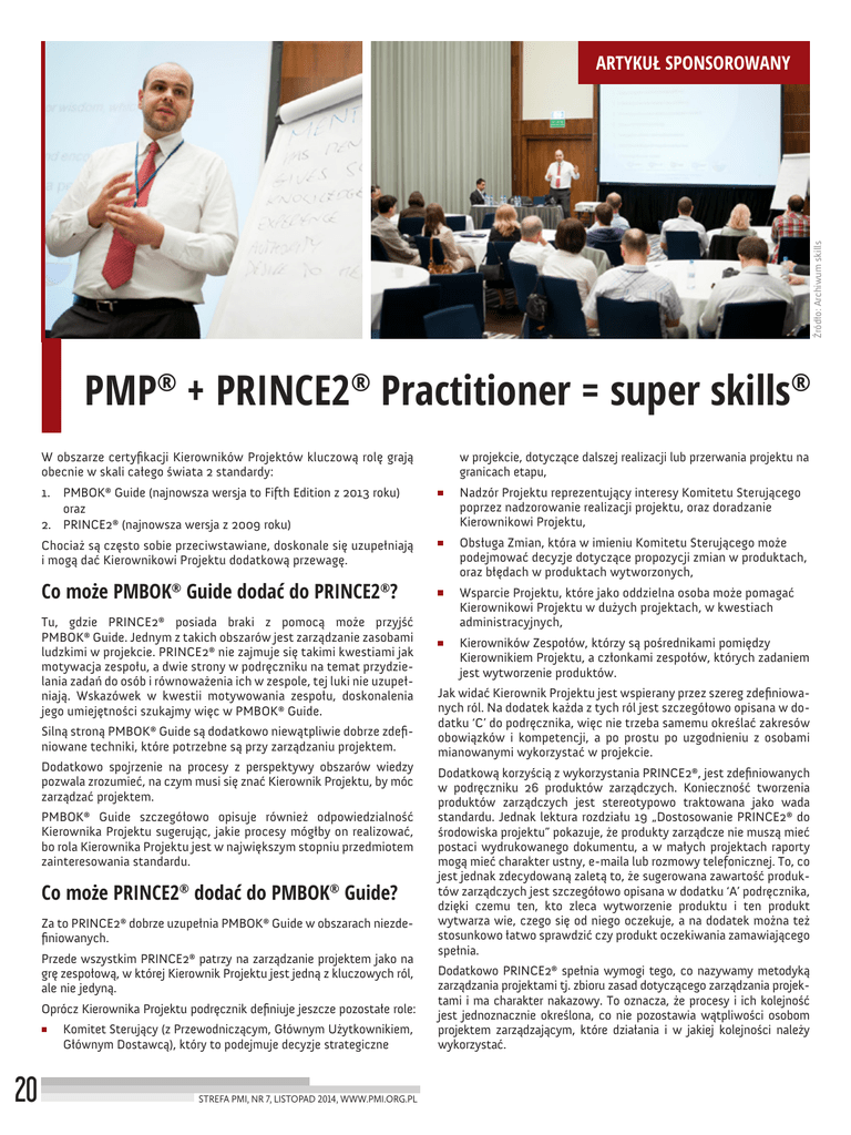 Źródło: Archiwum skills ARTYKUŁ SPONSOROWANY PMP® + PRINCE2® Practitioner = super skills® W obszarze certyfikacji Kierowników Projektów kluczową rolę grają obecnie w skali całego świata 2 standardy: w projekcie, dotyczące dalszej realizacji lub przerwania projektu na granicach etapu, 1. PMBOK® Guide (najnowsza wersja to Fifth Edition z 2013 roku) oraz 2. PRINCE2® (najnowsza wersja z 2009 roku) Nadzór Projektu reprezentujący interesy Komitetu Sterującego poprzez nadzorowanie realizacji projektu, oraz doradzanie Kierownikowi Projektu, Chociaż są często sobie przeciwstawiane, doskonale się uzupełniają i mogą dać Kierownikowi Projektu dodatkową przewagę. Obsługa Zmian, która w imieniu Komitetu Sterującego może podejmować decyzje dotyczące propozycji zmian w produktach, oraz błędach w produktach wytworzonych, Co może PMBOK® Guide dodać do PRINCE2®? Tu, gdzie PRINCE2® posiada braki z pomocą może przyjść PMBOK® Guide. Jednym z takich obszarów jest zarządzanie zasobami ludzkimi w projekcie. PRINCE2® nie zajmuje się takimi kwestiami jak motywacja zespołu, a dwie strony w podręczniku na temat przydzielania zadań do osób i równoważenia ich w zespole, tej luki nie uzupełniają. Wskazówek w kwestii motywowania zespołu, doskonalenia jego umiejętności szukajmy więc w PMBOK® Guide. Silną stroną PMBOK® Guide są dodatkowo niewątpliwie dobrze zdefiniowane techniki, które potrzebne są przy zarządzaniu projektem. Dodatkowo spojrzenie na procesy z perspektywy obszarów wiedzy pozwala zrozumieć, na czym musi się znać Kierownik Projektu, by móc zarządzać projektem. PMBOK® Guide szczegółowo opisuje również odpowiedzialność Kierownika Projektu sugerując, jakie procesy mógłby on realizować, bo rola Kierownika Projektu jest w największym stopniu przedmiotem zainteresowania standardu. Co może PRINCE2® dodać do PMBOK® Guide? Za to PRINCE2® dobrze uzupełnia PMBOK® Guide w obszarach niezdefiniowanych. Przede wszystkim PRINCE2® patrzy na zarządzanie projektem jako na grę zespołową, w której Kierownik Projektu jest jedną z kluczowych ról, ale nie jedyną. Oprócz Kierownika Projektu podręcznik definiuje jeszcze pozostałe role: Komitet Sterujący (z Przewodniczącym, Głównym Użytkownikiem, Głównym Dostawcą), który to podejmuje decyzje strategiczne 20 STREFA PMI, NR 7, LISTOPAD 2014, WWW.PMI.ORG.PL Wsparcie Projektu, które jako oddzielna osoba może pomagać Kierownikowi Projektu w dużych projektach, w kwestiach administracyjnych, Kierowników Zespołów, którzy są pośrednikami pomiędzy Kierownikiem Projektu, a członkami zespołów, których zadaniem jest wytworzenie produktów. Jak widać Kierownik Projektu jest wspierany przez szereg zdefiniowanych ról. Na dodatek każda z tych ról jest szczegółowo opisana w dodatku ‘C’ do podręcznika, więc nie trzeba samemu określać zakresów obowiązków i kompetencji, a po prostu po uzgodnieniu z osobami mianowanymi wykorzystać w projekcie. Dodatkową korzyścią z wykorzystania PRINCE2®, jest zdefiniowanych w podręczniku 26 produktów zarządczych. Konieczność tworzenia produktów zarządczych jest stereotypowo traktowana jako wada standardu. Jednak lektura rozdziału 19 „Dostosowanie PRINCE2® do środowiska projektu” pokazuje, że produkty zarządcze nie muszą mieć postaci wydrukowanego dokumentu, a w małych projektach raporty mogą mieć charakter ustny, e-maila lub rozmowy telefonicznej. To, co jest jednak zdecydowaną zaletą to, że sugerowana zawartość produktów zarządczych jest szczegółowo opisana w dodatku ‘A’ podręcznika, dzięki czemu ten, kto zleca wytworzenie produktu i ten produkt wytwarza wie, czego się od niego oczekuje, a na dodatek można też stosunkowo łatwo sprawdzić czy produkt oczekiwania zamawiającego spełnia. Dodatkowo PRINCE2® spełnia wymogi tego, co nazywamy metodyką zarządzania projektami tj. zbioru zasad dotyczącego zarządzania projektami i ma charakter nakazowy. To oznacza, że procesy i ich kolejność jest jednoznacznie określona, co nie pozostawia wątpliwości osobom projektem zarządzającym, które działania i w jakiej kolejności należy wykorzystać. ARTYKUŁ SPONSOROWANY Jak poznać PRINCE2®? Poznanie PRINCE2® na podstawie samodzielnej lektury podręcznika nie jest łatwe. Podręcznik jest napisany sekwencyjnie opisując po kolei: 7 zasad/pryncypiów, 7 tematów, 7 procesów, oraz dostosowanie PRINCE2® do środowiska projektu. Elementy te jednak w realizowanym projekcie tworzą trójwymiarowy model, który trudno samemu stworzyć czytelnikowi. Dobrze jest posłuchać kogoś, kto wie jak ten model działa w praktyce i jak dopasować w realizowanym projekcie poszczególne elementy. Z tego powodu dobrze jest wziąć udział w szkoleniu. Ważne jest jednak, by to było szkolenie akredytowane, gdyż takie szkolenie jest weryfikowane pod kątem przygotowania uczestnika do odpowiedniego egzaminu. Szkolenia akredytowane są prowadzone przez akredytowane organizacje szkoleniowe tj. ATO (Accredited Training Organization). Certyfikacja PRINCE2 ® Certyfikacja PRINCE2® nie wymaga od osoby zdającej żadnego doświadczenia zawodowego, więc każda osoba umiejąca standard, rozumiejąca go, oraz wiedząca jak go zastosować, może zdobyć certyfikat. To bardzo dobra wiadomość bo koszt egzaminu PRINCE2® Foundation wynosi ok. 1300 złotych więc co najmniej tyle osoba z certyfikatem PMI może zaoszczędzić. Nie oznacza to jednak, że merytorycznie można poziom PRINCE2® Foundation pominąć. Osoba zdająca egzamin Practitioner musi opanować wiedzę i rozumieć podręcznik. Z tego powodu dobrze jest poświęcić nieco czasu na odpowiednie i rzetelne przygotowanie się do egzaminu – najlepiej z pomocą wiarygodnego, sprawdzonego i doświadczonego partnera szkoleniowego. Uznanie znaków towarowych: PRINCE®, PRINCE2®, M_o_R®, P3O®, MSP® są zarejestrowanymi znakami handlowymi AXELO
