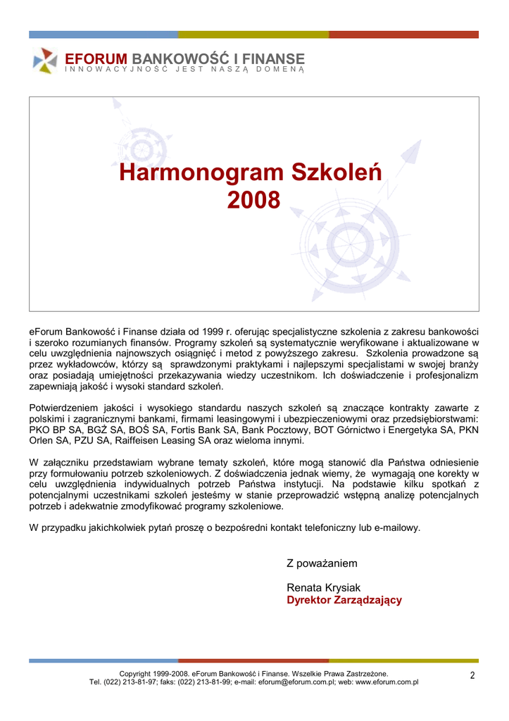 EFORUM BANKOWOŚĆ I FINANSE I N N O W A C Y J N O Ś Ć J E S T N A S Z Ą D O M E N Ą Harmonogram Szkoleń 2008 eForum Bankowość i Finanse działa od 1999 r. oferując specjalistyczne szkolenia z zakresu bankowości i szeroko rozumianych finansów. Programy szkoleń są systematycznie weryfikowane i aktualizowane w celu uwzględnienia najnowszych osiągnięć i metod z powyższego zakresu. Szkolenia prowadzone są przez wykładowców, którzy są sprawdzonymi praktykami i najlepszymi specjalistami w swojej branży oraz posiadają umiejętności przekazywania wiedzy uczestnikom. Ich doświadczenie i profesjonalizm zapewniają jakość i wysoki standard szkoleń. Potwierdzeniem jakości i wysokiego standardu naszych szkoleń są znaczące kontrakty zawarte z polskimi i zagranicznymi bankami, firmami leasingowymi i ubezpieczeniowymi oraz przedsiębiorstwami: PKO BP SA, BGŻ SA, BOŚ SA, Fortis Bank SA, Bank Pocztowy, BOT Górnictwo i Energetyka SA, PKN Orlen SA, PZU SA, Raiffeisen Leasing SA oraz wieloma innymi. W załączniku przedstawiam wybrane tematy szkoleń, które mogą stanowić dla Państwa odniesienie przy formułowaniu potrzeb szkoleniowych. Z doświadczenia jednak wiemy, że wymagają one korekty w celu uwzględnienia indywidualnych potrzeb Państwa instytucji. Na podstawie kilku spotkań z potencjalnymi uczestnikami szkoleń jesteśmy w stanie przeprowadzić wstępną analizę potencjalnych potrzeb i adekwatnie zmodyfikować programy szkoleniowe. W przypadku jakichkolwiek pytań proszę o bezpośredni kontakt telefoniczny lub e-mailowy. Z poważaniem Renata Krysiak Dyrektor Zarządzający Copyright 1999-2008. eForum Bankowość i Finanse. Wszelkie Prawa Zastrzeżone. Tel. (022) 213-81-97; faks: (022) 213-81-99; e-mail: [email protected]; web: www.eforum.com.pl 2 EFORUM BANKOWOŚĆ I FINANSE I N N O W A C Y J N O Ś Ć J E S T N A S Z Ą D O M E N Ą Pomiar Rentowności Skorygowanej o Ryzyko – ICAAP. Praktyka a Teoria 1.950 Obowiązki Sprawozdawcze w Świetle Nowych Regulacji Nadzorczych. COREP FINREP 1.950 1.950 Wprowadzenie do Basel II 1.650 Nowe Wyzwania dla Audytu Wewnętrznego - Nowa Umowa Kapitałowa 1.950 1.950 Scoring Kredytowy II. Budowa Modeli Scoringowych z Wykorzystaniem Regresji Logistycznej 1.950 Grudzień Listopad Październik Sierpień Wrzesień Lipiec Czerwiec Maj Kwiecień 10-11 R a t i n g o w e / S c o r i n g o w e Scoring Kredytowy I. Zastosowanie Punktowych Metod Oceny Klientów P o r t f e l o w e Zarządzanie Ryzykiem Portfela Kredytów Detalicznych. Praktyka i Teoria 1.950 4-5 R y z y k o 3-4 Nowa Umowa Kapitałowa. Identyfikacja, Pomiar i Zarządzanie Ryzykiem Kredytowym M o d e l e Marzec K a p i t a ł o w a 6-7 U m o w a 12-13 1.950 19-20 System Wyceny Funduszy jako Podstawa Wdrożenia Kapitału Ekonomicznego i Miar typu RAPM I C A A P 10-11 2.250 17-18 Kapitał Ekonomiczny w Procesie ICAAP Warsztaty N o w a Luty E k o n o m i c z n y 3-4 K a p i t a ł Styczeń Cena Bankowość Copyright 1999-2008. eForum Bankowość i Finanse. Wszelkie Prawa Zastrzeżone. Tel. (022) 213-81-97; faks: (022) 213-81-99; e-mail: [email protected]; web: www.eforum.com.pl 3 EFORUM BANKOWOŚĆ I FINANSE Zarządzanie Ryzykiem Operacyjnym w Banku – Ujęcie Praktyczne 1.950 Wycena Instrumentów Pochodnych Papiery Wartościowe. Charakterystyka, Organizacja Rynków, Ewidencja i Rozliczenia 1.950 1.950 1.950 Ocena Opłacalności Projektów Inwestycyjnych 1.450 Zarządzanie Ryzykiem w Projektach Inwestycyjnych 1.450 Grudzień Listopad Październik Sierpień Wrzesień Lipiec Czerwiec Maj 16-17 Finansowanie Nieruchomości 19-20 I n w e s t y c y j n e 10-11 P r o j e k t y 1.450 R e s t r u k t u r y z a c j a Prawne Aspekty Skutecznego Zabezpieczenia i Windykacja Należności Nowelizacja Prawa Upadłościowego oraz Postępowania Egzekucyjnego i W i n d y k a c j a 9-10 Analiza Sytuacji Finansowej Kredytobiorcy/Kontrahenta 15-16 K r e d y t o w a 1.450 950 7 A n a l i z a Kwiecień P o c h o d n e 21-22 I n s t r u m e n t y 17-18 O p e r a c y j n e 6-7 R y z y k o Marzec D O M E N Ą Luty N A S Z Ą Styczeń J E S T Cena I N N O W A C Y J N O Ś Ć Copyright 1999-2008. eForum Bankowość i Finanse. Wszelkie Prawa Zastrzeżone. Tel. (022) 213-81-97; faks: (022) 213-81-99; e-mail: [email protected]; web: www.eforum.com.pl 4 EFORUM BANKOWOŚĆ I FINANSE I N N O W A C Y J N O Ś Ć J E S T N A S Z Ą D O M E N Ą Grudzień Listopad Październik Sierpień Wrzesień Lipiec Czerwiec Maj Kwiecień Marzec Luty Analiza Sytuacji Finansowej Kredytobiorcy/Kontrahenta 1.450 R y z y k i e m 950 Opcje egzotyczne – Wykorzystanie w Praktyce 1.650 Zintegrowane Zarządzanie Ryzykiem w Przedsiębiorstwie 1.650 22 1.650 2-3 Zarządzanie Ryzykiem Walutowym 16-17 Wykorzystanie Opcji Walutowych w Zarządzaniu Ryzykiem Kursowym 2 Z a r z ą d z a n i e I n w e s t y c y j n e 1.450 Biznes Plan 1.450 R e s t r u k t u r y z a c j a Prawne Aspekty Skutecznego Zabezpieczenia i Windykacja Należności. 1.450 Nowelizacja Prawa Upadłościowego oraz Postępowania Egzekucyjnego 950 16-17 Zarządzanie Ryzykiem w Projektach Inwestycyjnych 2-3 1.450 i W i n d y k a c j a 9-10 Ocena Opłacalności Projektów Inwestycyjnych 7 P r o j e k t y 15-16 K o n t r a h e n t a 10-11 R y z y k o Styczeń Cena Finanse Copyright 1999-2008. eForum Bankowość i Finanse. Wszelkie Prawa Zastrzeżone. Tel. (022) 213-81-97; faks: (022) 213-81-99; e-mail: [email protected]; web: www.eforum.com.pl 5 EFORUM BANKOWOŚĆ I FINANSE I N N O W A C Y J N O Ś Ć J E S T N A S Z Ą D O M E N Ą Grudzień Listopad Październik Sierpień Wrzesień Lipiec Czerwiec Maj Kwiecień Marzec Luty M i n i n g D a n y c h - Podstawy Statystyki - Analiza Opisowa Danych 1.450 Podstawy Statystyki - Wnioskowanie statystyczne 1.450 Analiza Regresji i Korelacji 1.450 Analiza i Prognozowanie Szeregów Czasowych I 1.450 Wprowadzenie do Systemu Statystycznego R 1.450 S t a t y s t y k a 4-5 A n a l i z a 18-19 1.650 13-14 Data Mining - Metody Uczenia 