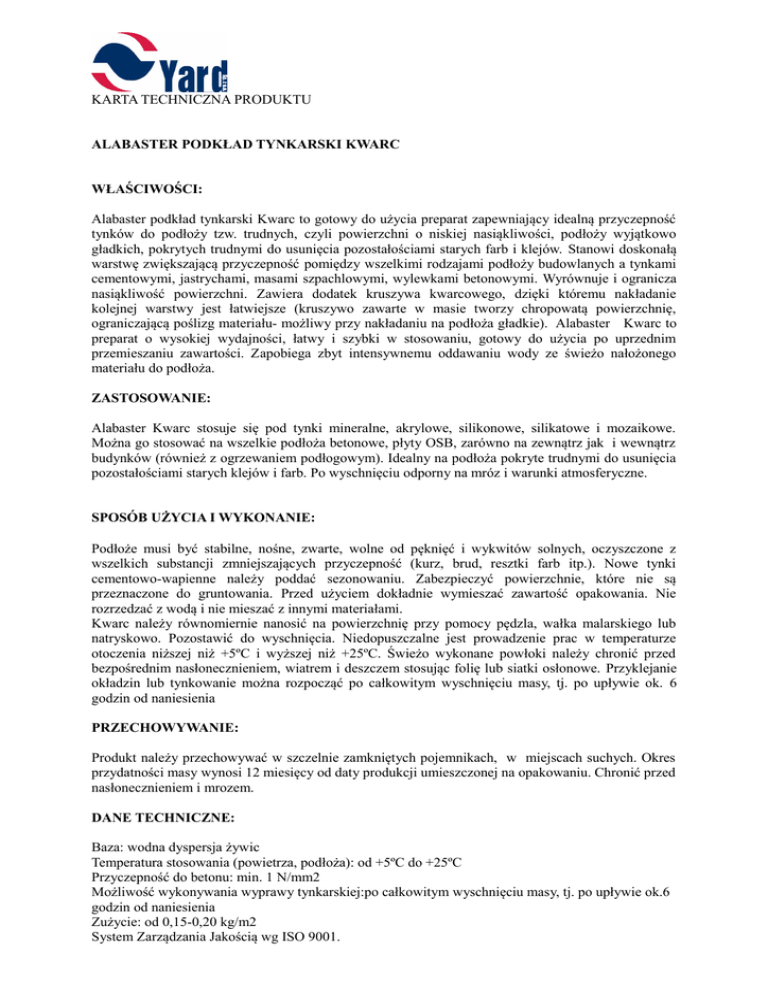 KARTA TECHNICZNA PRODUKTU ALABASTER PODKŁAD TYNKARSKI KWARC WŁAŚCIWOŚCI: Alabaster podkład tynkarski Kwarc to gotowy do użycia preparat zapewniający idealną przyczepność tynków do podłoży tzw. trudnych, czyli powierzchni o niskiej nasiąkliwości, podłoży wyjątkowo gładkich, pokrytych trudnymi do usunięcia pozostałościami starych farb i klejów. Stanowi doskonałą warstwę zwiększającą przyczepność pomiędzy wszelkimi rodzajami podłoży budowlanych a tynkami cementowymi, jastrychami, masami szpachlowymi, wylewkami betonowymi. Wyrównuje i ogranicza nasiąkliwość powierzchni. Zawiera dodatek kruszywa kwarcowego, dzięki któremu nakładanie kolejnej warstwy jest łatwiejsze (kruszywo zawarte w masie tworzy chropowatą powierzchnię, ograniczającą poślizg materiału- możliwy przy nakładaniu na podłoża gładkie). Alabaster Kwarc to preparat o wysokiej wydajności, łatwy i szybki w stosowaniu, gotowy do użycia po uprzednim przemieszaniu zawartości. Zapobiega zbyt intensywnemu oddawaniu wody ze świeżo nałożonego materiału do podłoża. ZASTOSOWANIE: Alabaster Kwarc stosuje się pod tynki mineralne, akrylowe, silikonowe, silikatowe i mozaikowe. Można go stosować na wszelkie podłoża betonowe, płyty OSB, zarówno na zewnątrz jak i wewnątrz budynków (również z ogrzewaniem podłogowym). Idealny na podłoża pokryte trudnymi do usunięcia pozostałościami starych klejów i farb. Po wyschnięciu odporny na mróz i warunki atmosferyczne. SPOSÓB UŻYCIA I WYKONANIE: Podłoże musi być stabilne, nośne, zwarte, wolne od pęknięć i wykwitów solnych, oczyszczone z wszelkich substancji zmniejszających przyczepność (kurz, brud, resztki farb itp.). Nowe tynki cementowo-wapienne należy poddać sezonowaniu. Zabezpieczyć powierzchnie, które nie są przeznaczone do gruntowania. Przed użyciem dokładnie wymieszać zawartość opakowania. Nie rozrzedzać z wodą i nie mieszać z innymi materiałami. Kwarc należy równomiernie nanosić na powierzchnię przy pomocy pędzla, wałka malarskiego lub natryskowo. Pozostawić do wyschnięcia. Niedopuszczalne jest prowadzenie prac w temperaturze otoczenia niższej niż +5ºC i wyższej niż +25ºC. Świeżo wykonane powłoki należy chronić przed bezpośrednim nasłonecznieniem, wiatrem i deszczem stosując folię lub siatki osłonowe. Przyklejanie okładzin lub tynkowanie można rozpocząć po całkowitym wyschnięciu masy, tj. po upływie ok. 6 godzin od naniesienia PRZECHOWYWANIE: Produkt należy przechowywać w szczelnie zamkniętych pojemnikach, w miejscach suchych. Okres przydatności masy wynosi 12 miesięcy od daty produkcji umieszczonej na opakowaniu. Chronić przed nasłonecznieniem i mrozem. DANE TECHNICZNE: Baza: wodna dyspersja żywic Temperatura stosowania (powietrza, podłoża): od +5ºC do +25ºC Przyczepność do betonu: min. 1 N/mm2 Możliwość wykonywania wyprawy tynkarskiej:po całkowitym wyschnięciu masy, tj. po upływie ok.6 godzin od naniesienia Zużycie: od 0,15-0,20 kg/m2 System Zarządzania Jakością wg ISO 9001. BEZPIECZEŃSTWO: S2- Chronić przed dziećmi. S24/25- Unikać zanieczyszczenia skóry i oczu. S26- W razie kontaktu z oczami przemyć dużą ilością wody i skontaktować się z lekarzem. S37- Nosić odpowiednie rękawice ochronne S46- Po połknięciu skonsultować się natychmiast z lekarzem i pokazać opakowanie lub etykietę Producent nie ponosi odpowiedzialności za skutki powstałe w wyniku użycia wyrobu niezgodnie z powyższymi wskazówkami oraz zasadami sztuki budowlanej „Yard” Sp. z o.o. Ul. Pomorska 53 70-812 Szczecin tel./fax +48/91/4693246 www.alabaster-yard.eu