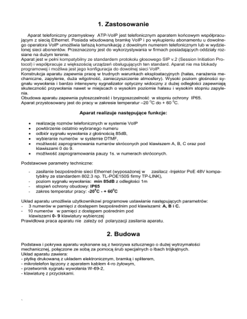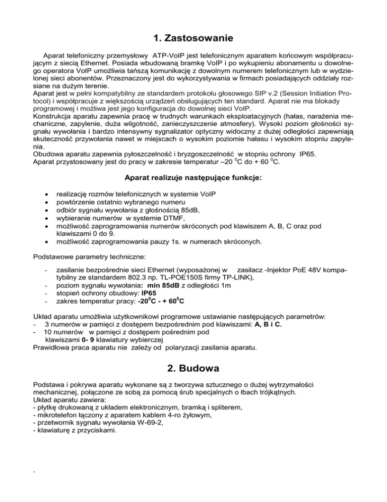 1. Zastosowanie Aparat telefoniczny przemysłowy ATP-VoIP jest telefonicznym aparatem końcowym współpracującym z siecią Ethernet. Posiada wbudowaną bramkę VoIP i po wykupieniu abonamentu u dowolnego operatora VoIP umożliwia tańszą komunikację z dowolnym numerem telefonicznym lub w wydzielonej sieci abonentów. Przeznaczony jest do wykorzystywania w firmach posiadających oddziały rozsiane na dużym terenie. Aparat jest w pełni kompatybilny ze standardem protokołu głosowego SIP v.2 (Session Initiation Protocol) i współpracuje z większością urządzeń obsługujących ten standard. Aparat nie ma blokady programowej i możliwa jest jego konfiguracja do dowolnej sieci VoIP. Konstrukcja aparatu zapewnia pracę w trudnych warunkach eksploatacyjnych (hałas, narażenia mechaniczne, zapylenie, duża wilgotność, zanieczyszczenie atmosfery). Wysoki poziom głośności sygnału wywołania i bardzo intensywny sygnalizator optyczny widoczny z dużej odległości zapewniają skuteczność przywołania nawet w miejscach o wysokim poziomie hałasu i wysokim stopniu zapylenia. Obudowa aparatu zapewnia pyłoszczelność i bryzgoszczelność w stopniu ochrony IP65. Aparat przystosowany jest do pracy w zakresie temperatur –20 0C do + 60 0C. Aparat realizuje następujące funkcje: • • • • • • realizację rozmów telefonicznych w systemie VoIP powtórzenie ostatnio wybranego numeru odbiór sygnału wywołania z głośnością 85dB, wybieranie numerów w systemie DTMF, możliwość zaprogramowania numerów skróconych pod klawiszem A, B, C oraz pod klawiszami 0 do 9. możliwość zaprogramowania pauzy 1s. w numerach skróconych. Podstawowe parametry techniczne: - zasilanie bezpośrednie sieci Ethernet (wyposażonej w zasilacz -Injektor PoE 48V kompatybilny ze standardem 802.3 np. TL-POE150S firmy TP-LINK), poziom sygnału wywołania: min 85dB z odległości 1m stopień ochrony obudowy: IP65 0 0 zakres temperatur pracy: -20 C - + 60 C Układ aparatu umożliwia użytkownikowi programowe ustawianie następujących parametrów: - 3 numerów w pamięci z dostępem bezpośrednim pod klawiszami: A, B i C. - 10 numerów w pamięci z dostępem pośrednim pod klawiszami 0- 9 klawiatury wybierczej Prawidłowa praca aparatu nie zależy od polaryzacji zasilania aparatu. 2. Budowa Podstawa i pokrywa aparatu wykonane są z tworzywa sztucznego o dużej wytrzymałości mechanicznej, połączone ze sobą za pomocą śrub specjalnych o łbach trójkątnych. Układ aparatu zawiera: - płytkę drukowaną z układem elektronicznym, bramką i spliterem, - mikrotelefon łączony z aparatem kablem 4-ro żyłowym, - przetwornik sygnału wywołania W-69-2, - klawiaturę z przyciskami. ` 3. Funkcje przycisków 0 ... 9 - przycisk dostępu do dodatkowych usług telekomunikacyjnych przy współpracy z centralą systemu DTMF # A - wybieranie numeru ... C - przyciski wybierania skróconego F - przycisk FLASH P - przycisk programowania pauzy R - powtórzenie ostatnio wybieranego numeru M - wejście w tryb programowania numerów do pamięci pośredniej 4. Opis funkcji Wywołanie w aparacie Przychodzący sygnał wywołania o głośności min. 85dB dodatkowo jest sygnalizowany świeceniem czerwonej diody luminescencyjnej o średnicy 20mm. Rozmowa wychodząca Realizowana jest przez podniesienie mikrotelefonu i wybranie numeru żądanego abonenta z klawiatury lub numeru zakodowanego w pamięci bezpośredniej pod przyciskami: A, B lub C względnie w pamięci pośredniej pod przyciskami 0 - 9 . Automatyczne powtórzenie ostatnio wybranego numeru Aparat rejestruje automatycznie w pamięci ostatnio wybrany numer wymazując poprzedni. Powtórne wybranie tego numeru następuje automatycznie po naciśnięciu przycisku "R". ` Kodowanie numerów w pamięci bezpośredniej W pamięci bezpośredniej można zakodować numery telefoniczne max 16 cyfrowe pod przyciskami: A, B, C. Aby wejść w tryb programowania należy: • otworzyć aparat • przesunąć przełącznik oznaczony PR na płytce drukowanej Programowanie odbywa się następująco: • podnieść mikrotelefon • nacisnąć jeden z przycisków: A, B lub C. • wybrać z klawiatury numer, który chcemy zapisać • nacisnąć przycisk potwierdzający # Numery, które mają być zapisane pod pozostałymi klawiszami zapisać w identyczny sposób. Programowanie zakończyć następująco: • odłożyć mikrotelefon • przestawić przełącznik PR do pozycji pierwotnej • zamknąć aparat Wybieranie skrócone tych numerów następuje bezpośrednio po naciśnięciu przycisku A, B lub C. Kodowanie numerów w pamięci pośredniej W celu zakodowania numerów max 16cyfrowych pod przyciskami pamięci pośredniej: 0 - 9 należy: • wejść w tryb programowania, przez otwarcie aparatu i przestawić przełącznik PR • nacisnąć przycisk M • nacisnąć jeden z przycisków 0 – 9 oznaczający komórkę pamięci pod którą będzie zapamiętany numer • wybrać z klawiatury numer, który chcemy zapisać • nacisnąć przycisk potwierdzający # Numery, które mają być zapisane pod pozostałymi klawiszami zapisać w identyczny sposób. Programowanie zakończyć przez odłożenie mikrotelefonu, przestawienie przełącznika PR do pozycji pierwotnej, zamknięcie aparatu. Wybieranie skrócone tych numerów następuje bezpośrednio po naciśnięciu przycisków: M i numeru komórki pamięci 0 – 9 5. Instalowanie i konserwacja aparatu W celu podłączenia aparatu do linii telefonicznej należy: 1. Odkręcić pokrywę aparatu 2. Odkręcić przepust i wyjąć podkładkę zaślepiającą otwór przepustu 3. Na kabel instalacyjny z Ethernetem 8-żyłowy (skrętka) nałożyć dławik, podkładkę metalową oraz uszczelkę. 4. Kabel przewlec przez otwór przepustu 5. Na koniec kabla zacisnąć gniazdko RJ-45 zgodnie z zasadami instalacji sieci Ethernet i przyłączyć do gniazda wejściowego na płytce bramki VoIP w aparacie. 6. Dokręcić wkręt dławika, zapewniając odpowiednią