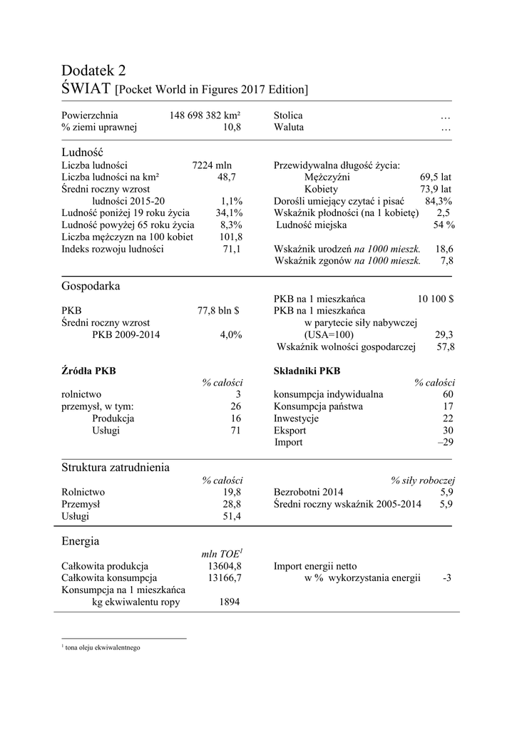 Dodatek 2 ŚWIAT [Pocket World in Figures 2017 Edition] Powierzchnia % ziemi uprawnej 148 698 382 km² 10,8 … … Stolica Waluta Ludność Liczba ludności 7224 mln Liczba ludności na km² 48,7 Średni roczny wzrost ludności 2015-20 1,1% Ludność poniżej 19 roku życia 34,1% Ludność powyżej 65 roku życia 8,3% Liczba mężczyzn na 100 kobiet 101,8 Indeks rozwoju ludności 71,1 Przewidywalna długość życia: Mężczyźni 69,5 lat Kobiety 73,9 lat Dorośli umiejący czytać i pisać 84,3% Wskaźnik płodności (na 1 kobietę) 2,5 Ludność miejska 54 % Wskaźnik urodzeń na 1000 mieszk. Wskaźnik zgonów na 1000 mieszk. 18,6 7,8 Gospodarka PKB Średni roczny wzrost PKB 2009-2014 77,8 bln $ 4,0% Źródła PKB rolnictwo przemysł, w tym: Produkcja Usługi PKB na 1 mieszkańca 10 100 $ PKB na 1 mieszkańca w parytecie siły nabywczej (USA=100) 29,3 Wskaźnik wolności gospodarczej 57,8 Składniki PKB % całości 3 26 16 71 konsumpcja indywidualna Konsumpcja państwa Inwestycje Eksport Import % całości 60 17 22 30 –29 Struktura zatrudnienia Rolnictwo Przemysł Usługi % całości 19,8 28,8 51,4 % siły roboczej Bezrobotni 2014 5,9 Średni roczny wskaźnik 2005-2014 5,9 Energia Całkowita produkcja Całkowita konsumpcja Konsumpcja na 1 mieszkańca kg ekwiwalentu ropy 1 tona oleju ekwiwalentnego mln TOE1 13604,8 13166,7 1894 Import energii netto w % wykorzystania energii -3 Inflacja i finanse2 Inflacja cen tow. I usług konsumpcyjnych 2015 Średnia roczna inflacja 2010-15 Wskaźnik LIBOR, 3 miesiące, grudzień 2015 2,8% 3,8% średni roczny wzrost 2010 -15 Wąski pieniądz 9,1% Szeroki pieniądz 5,5% 0,37% Handel Światowy eksport Towary przemysłowe Paliwa Żywność mld $ fob 13200 2487 1722 Rudy metale i metale Surowe produkty rolne mld $ fob 765 306 W sumie łącznie z innymi Główne kierunki eksportu Stany Zjednoczone Chiny Niemcy Japonia Wielka Brytania 19131 Główne kierunki importu % całości 12,6 10,5 6,5 4,3 3,7 Chiny Stany Zjednoczone Niemcy Japonia Holandia % całości 12,8 8,8 8,1 3,8 3,7 Bilans płatniczy, rezerwy i długi, mld $ Eksport widzialny fob Import widzialny fob Bilans handlowy Niewidzialny napływ Niewidzialny odpływ Przepływ netto Stan rachunku bieżącego - w %PKB Bilans kapitałowy Bilans ogólny 18433 -17820 613 8900 – 8859 - 258 397 0,5 – – Zmiany w rezerwach 288 Poziom rezerw na koniec grudnia 13074 Liczba miesięcy pokrycia importowego 5,9 Pomoc udzielona – 3 - w % PKB – Zdrowie i edukacja Wydatki na lecznictwo w % PKB Lekarze na 1000 mieszk. Łóżka szpitalne na 1000 mieszk. Dostęp do źródeł uzdatnionej wody w % mieszk. 10 1,5 … 89,3 Wydatki na edukację w % PKB Zapisani do szkół, %: podstawowych średnich wyższych Społeczeństwo Liczba gospodarstw domowych 2012,2mln 2 3 Kraje Organizacji Współpracy Gospodarczej i Rozwoju (OECD) Kraje OECD i Bliskiego Wschodu Liczba kolorowych odbiorników TV 4,8% 108 73 32 Średnia liczba osób na 1 gospodarstwo domowe Małżeństwa zawarte na 1000 mieszkańców Liczba rozwodów Na 1000 mieszkańców Koszty utrzymania, grudzień 2014 Nowy Jork = 100 3,6 … … … na 100 gosp. Domowych … Linie telefoniczne na 100 mieszk. 20 Abonenci telefonii komórkowej na 100 mieszk. 101 Liczba komputerów na 100 mieszk. 19,8 Łącza internetowe na 100 mieszk. 132,9